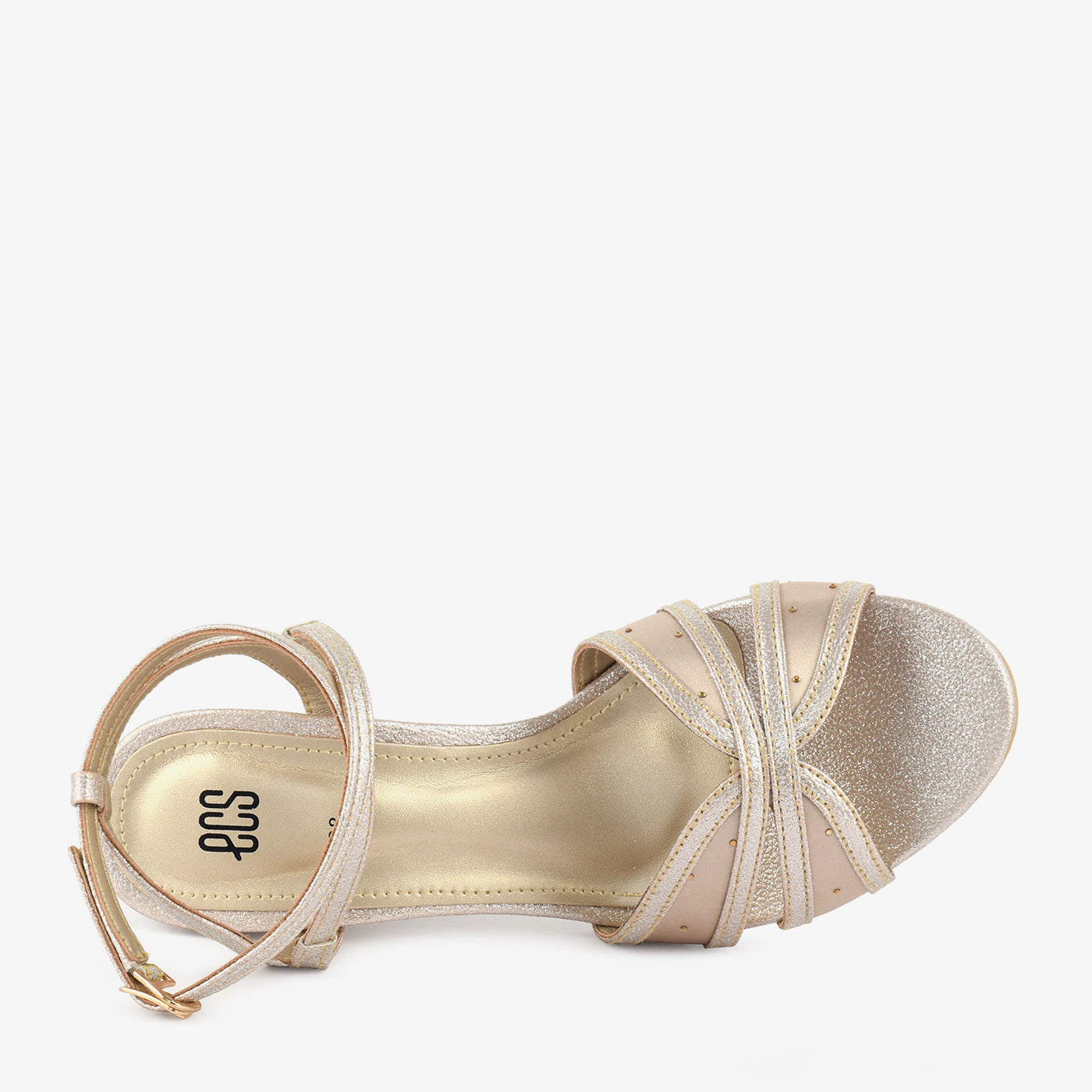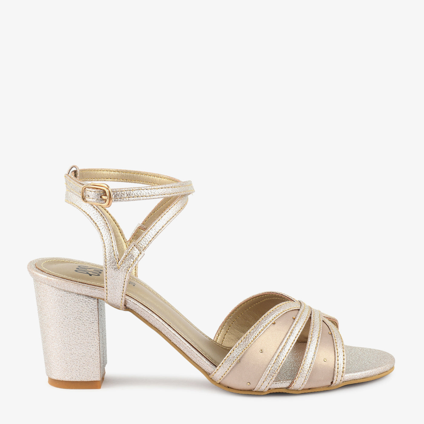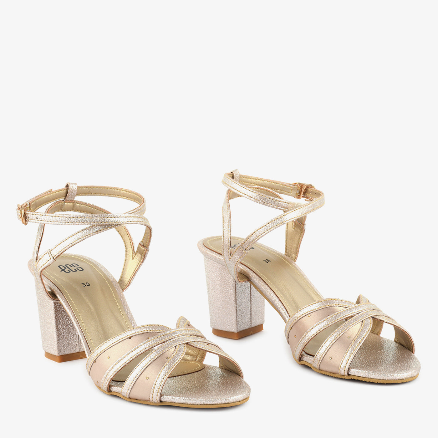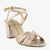 A glamorous sandal with crossover straps and a shimmery block heel. Perfect for weddings, parties, or festive occasions.