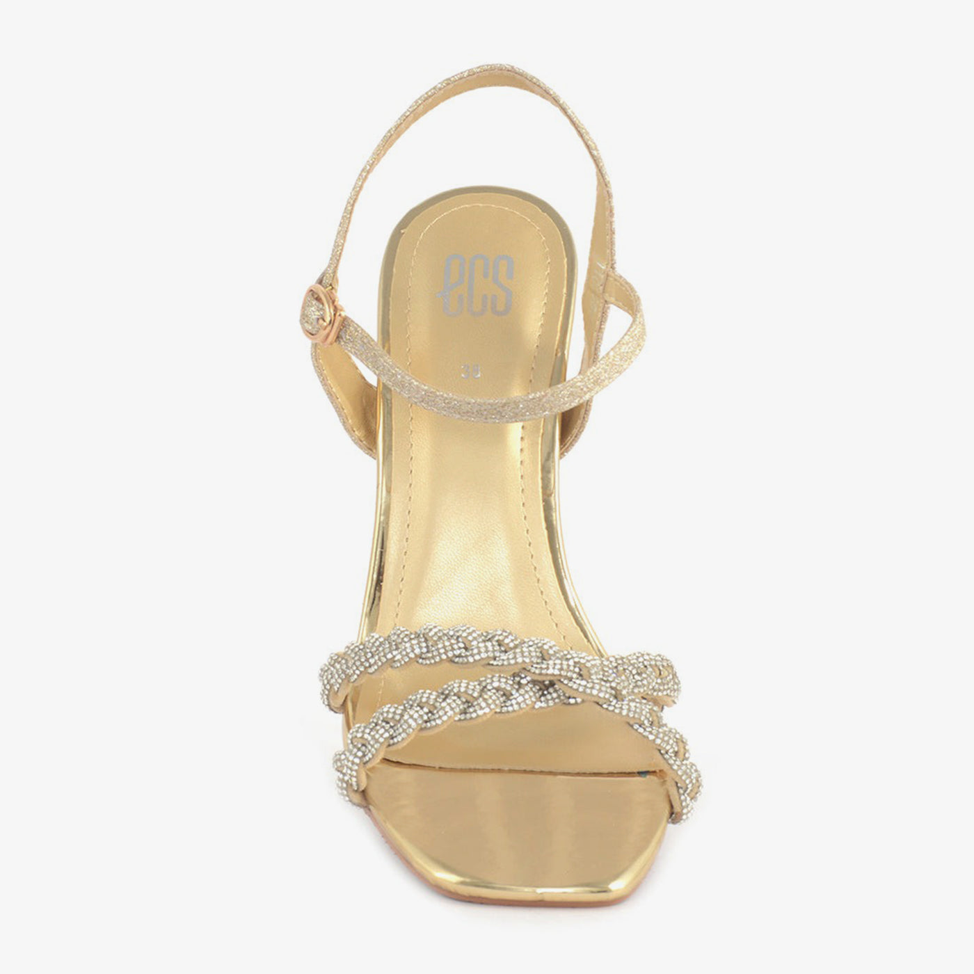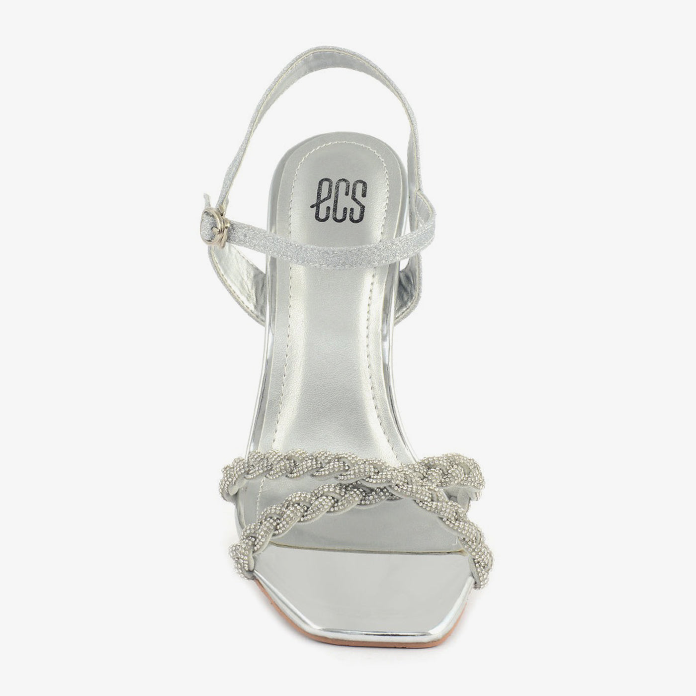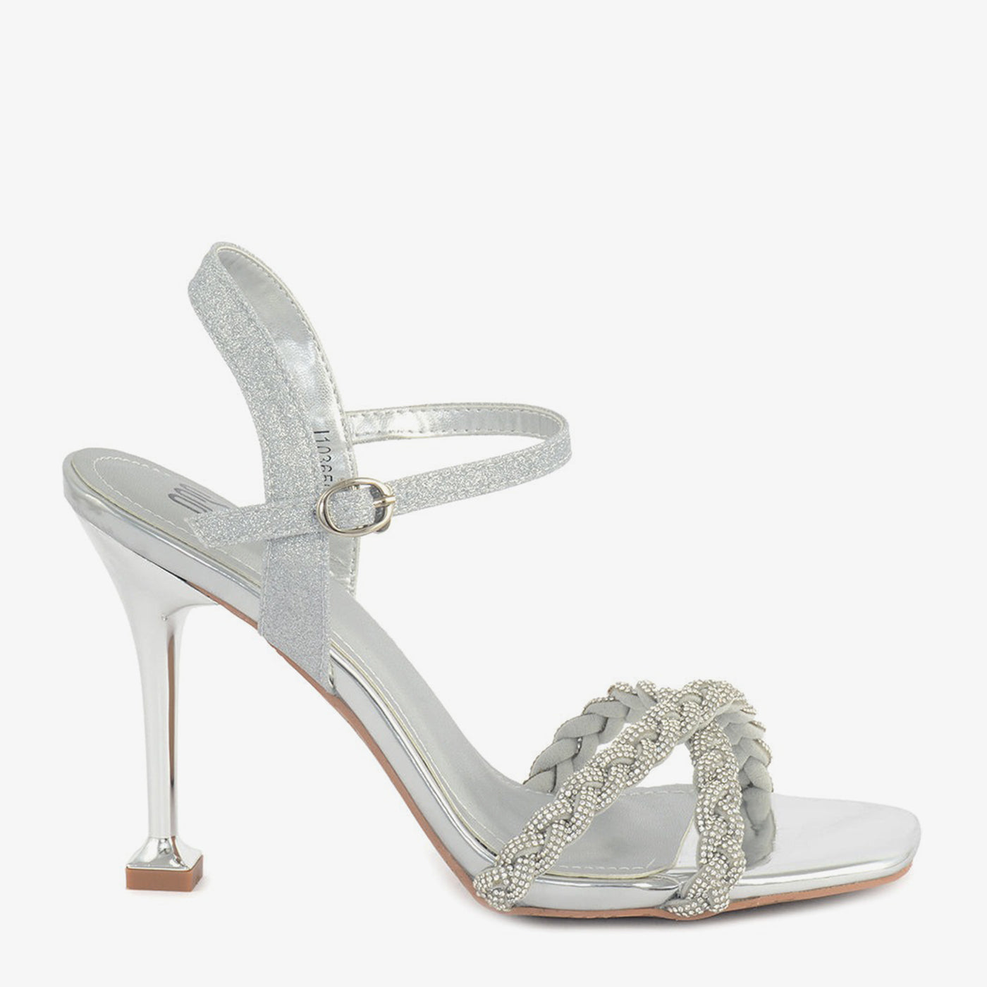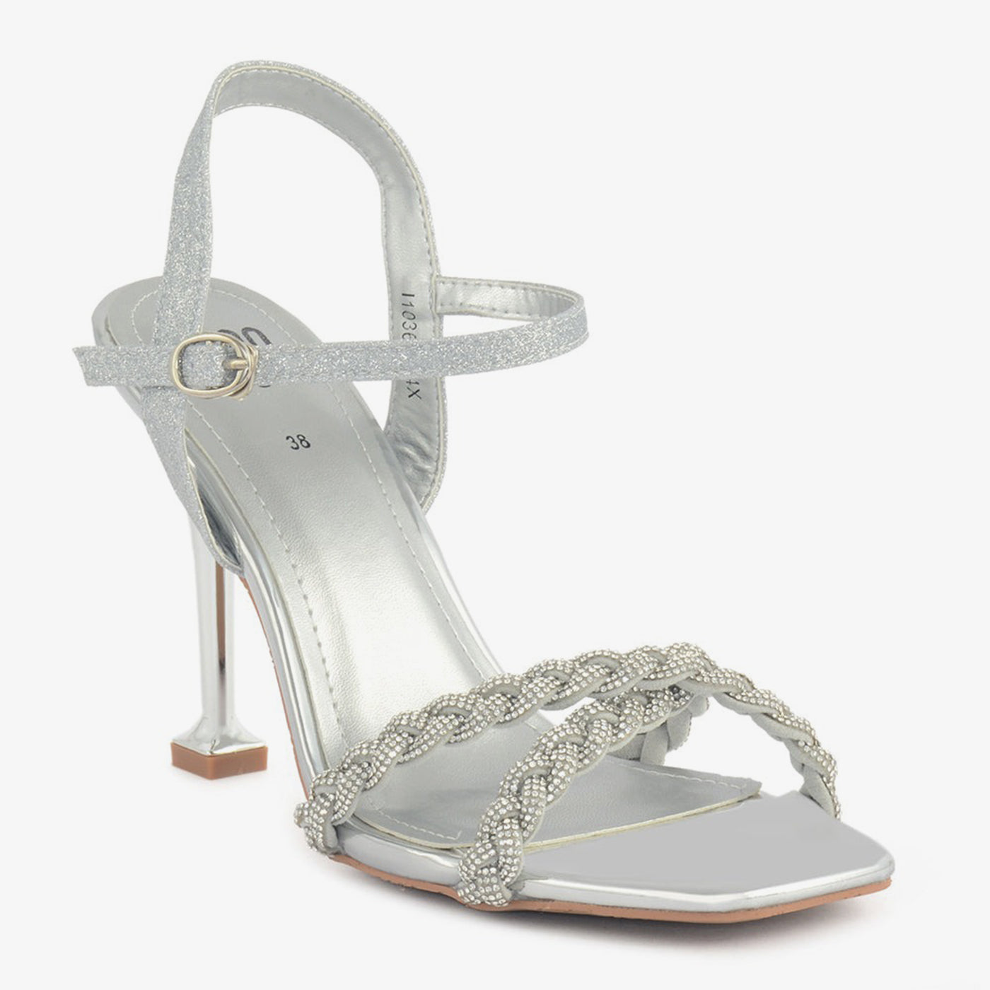 Chic high-heeled sandals featuring braided and crystal-embellished straps for a glamorous effect. The slender heel adds height while maintaining balance. Perfect for special events where elegance is key.