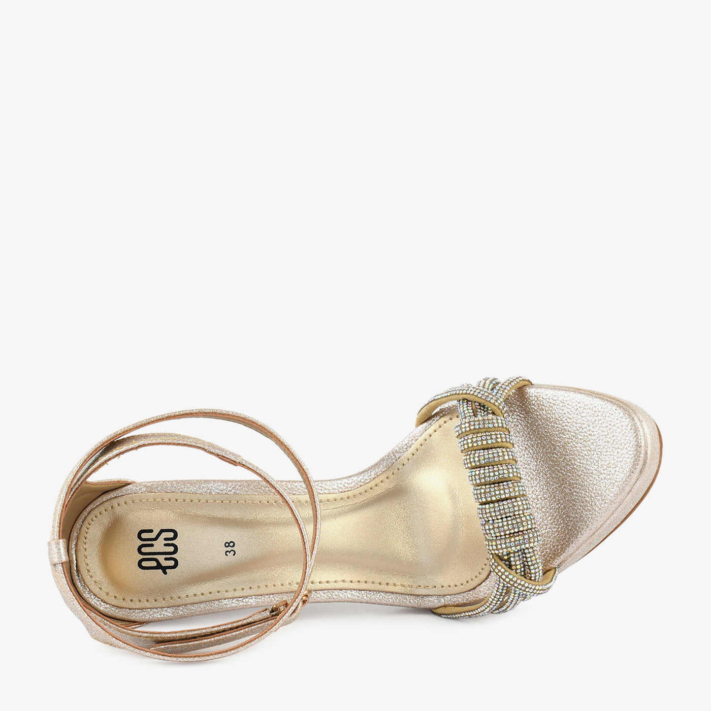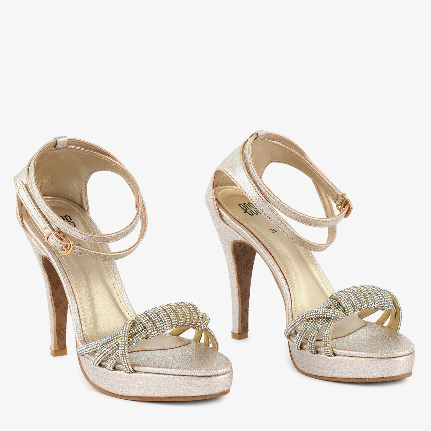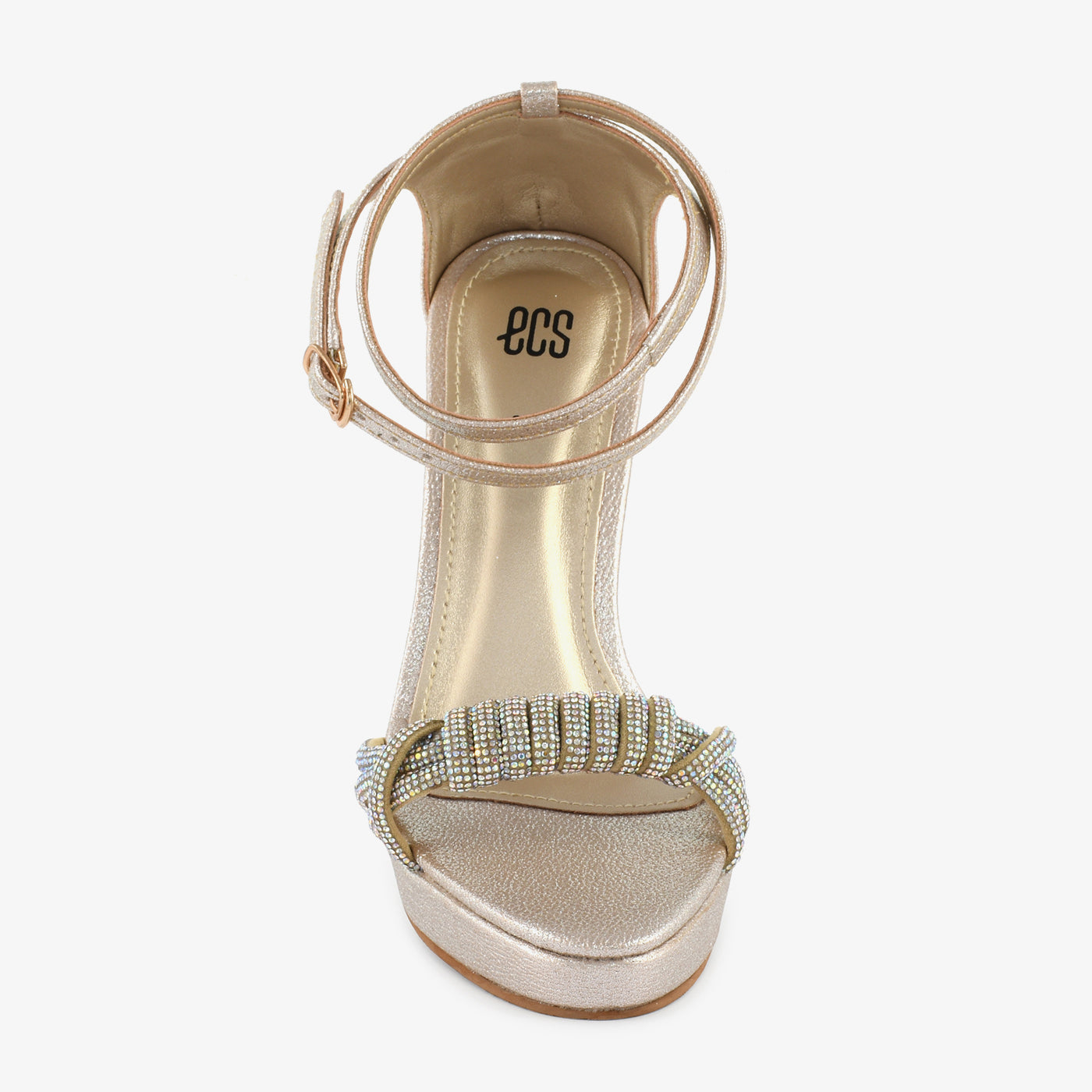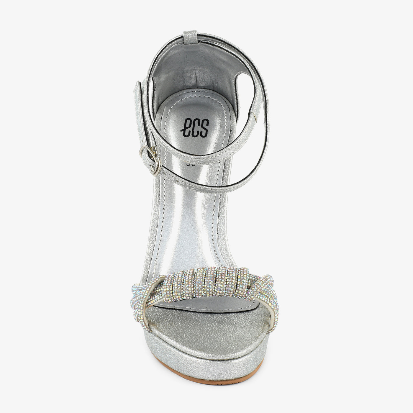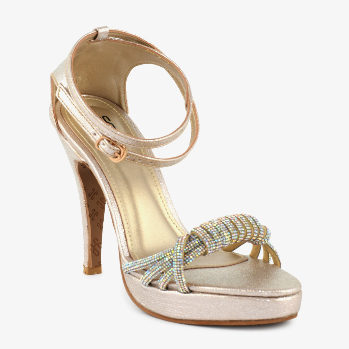 Elevate your evening style with this striking pair, designed with shimmering knotted straps that wrap gracefully across the front. The high stiletto heel and slight platform add dramatic height while maintaining comfort for extended wear. Finished with a secure double-ankle strap for added support.