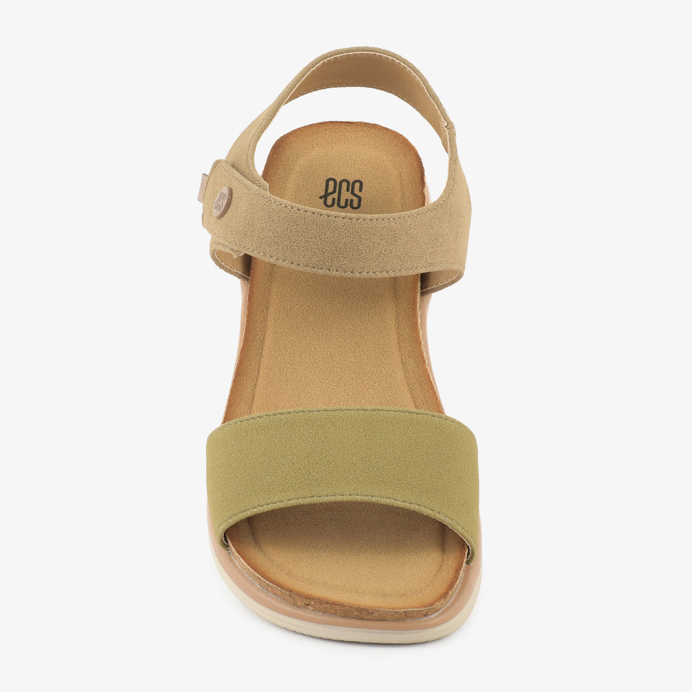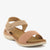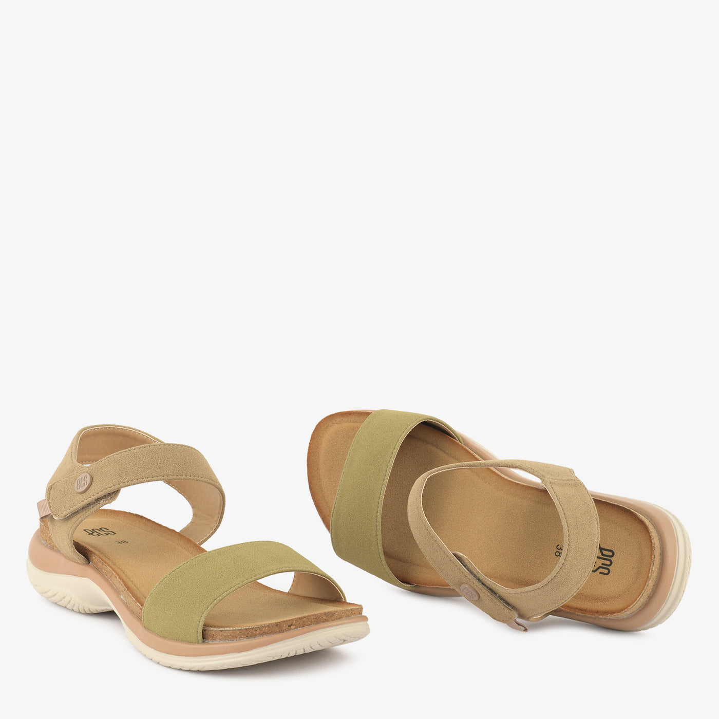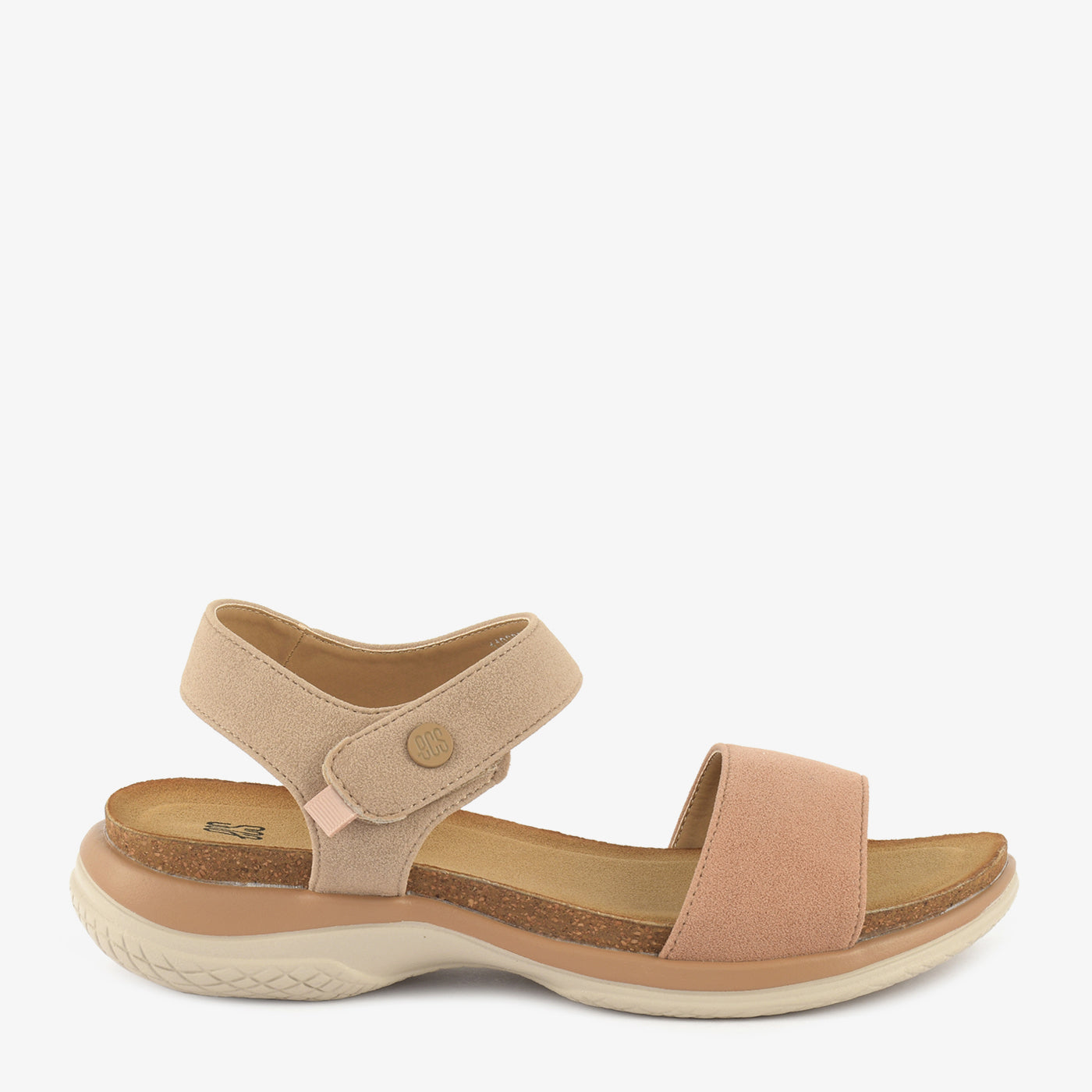 These comfortable sandals feature two adjustable straps for a customized fit. The front strap is a soft peach hue, while the ankle strap is a light beige with a hook-and-loop closure.