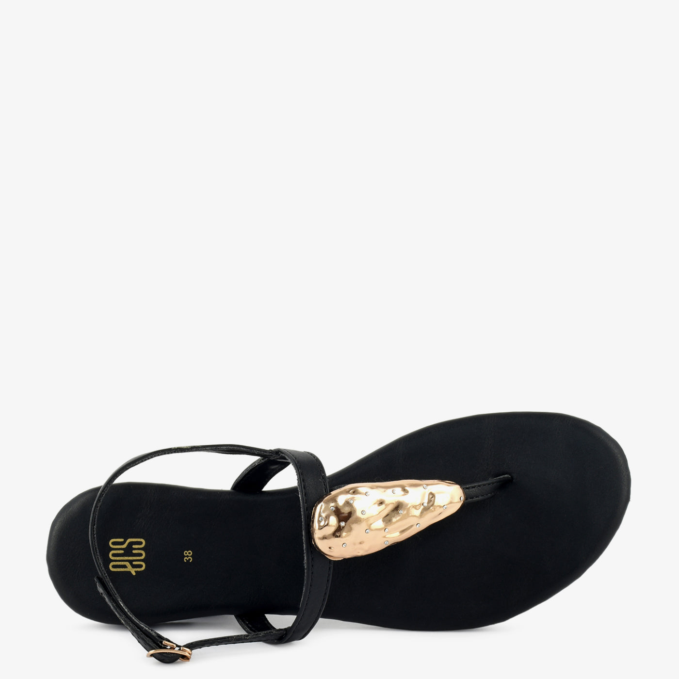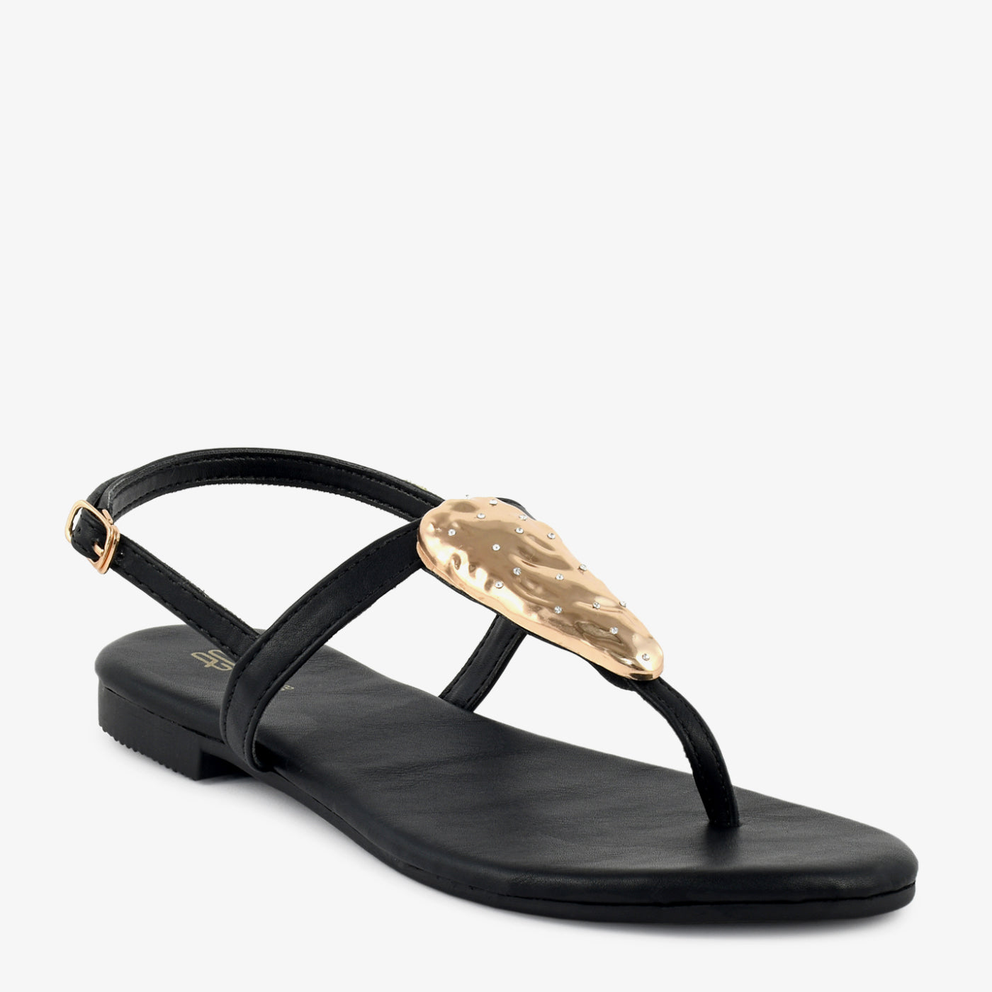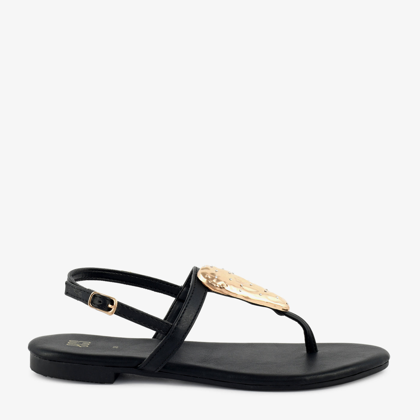- Design: Thong-style sandal with metallic accent and back strap