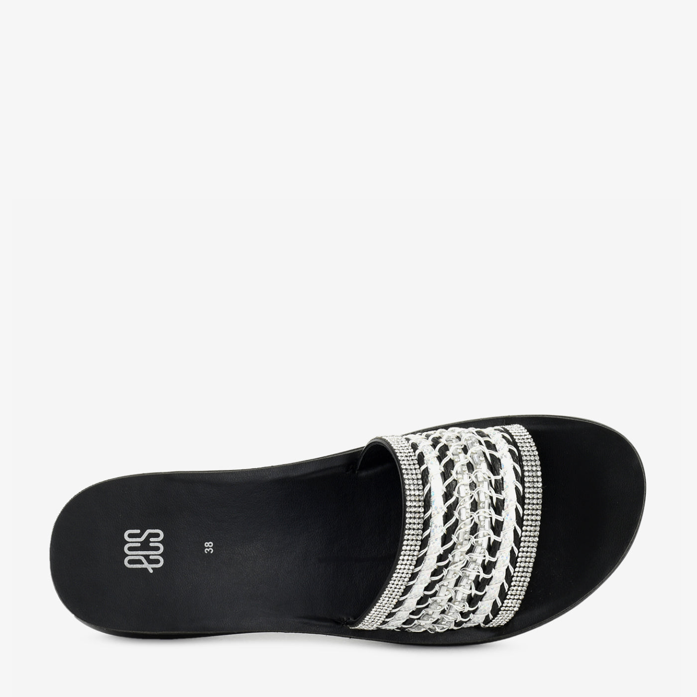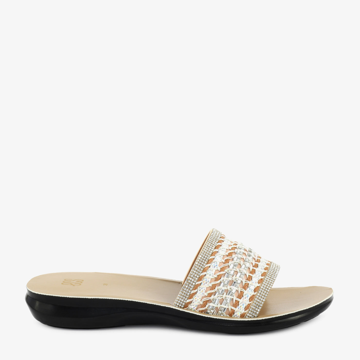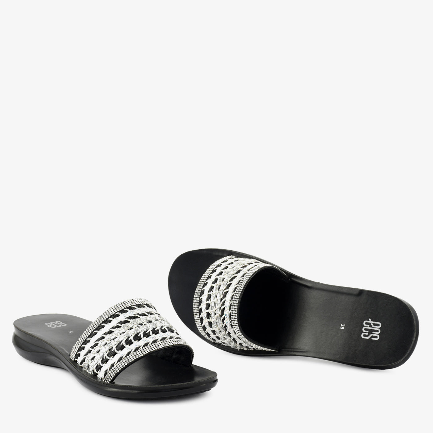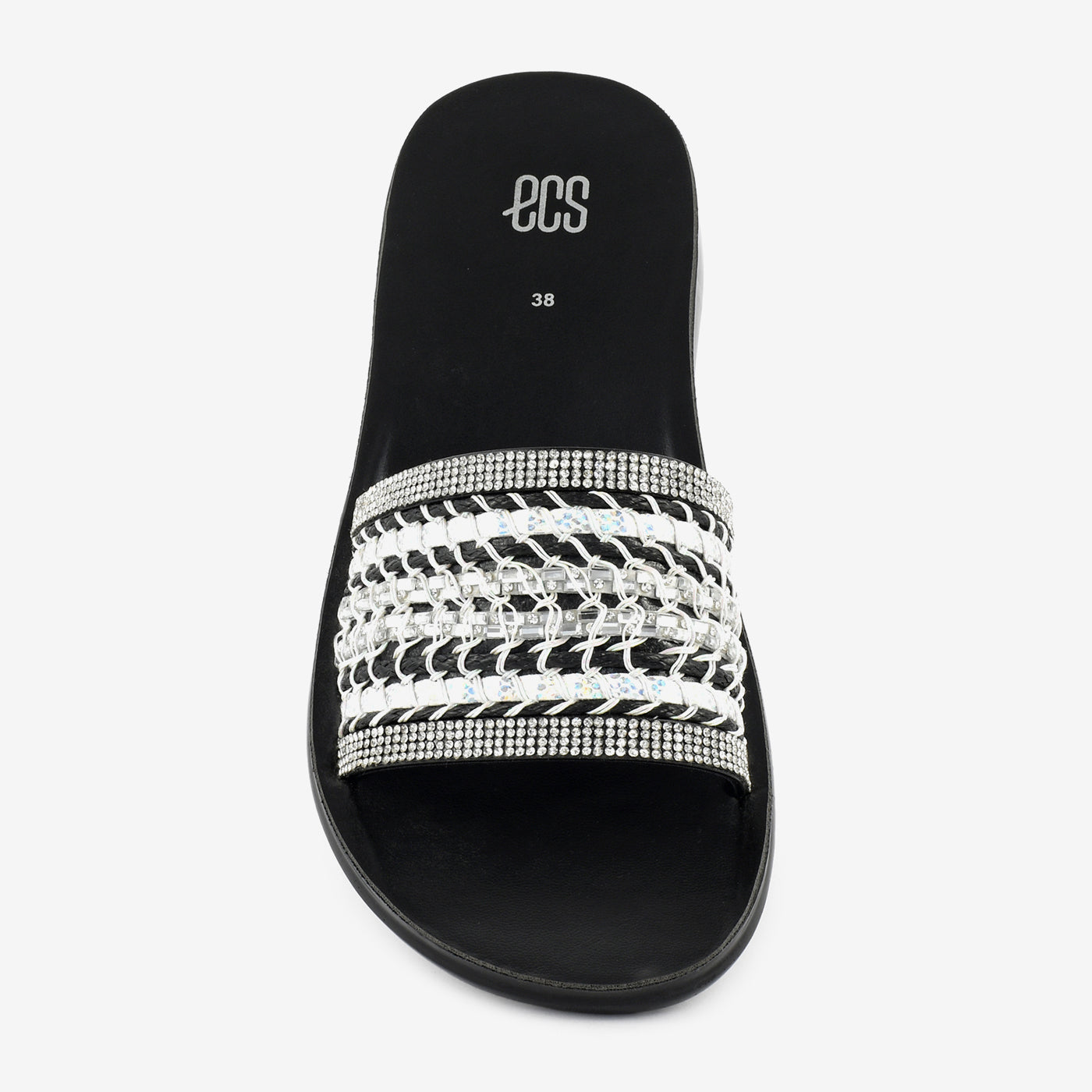 - Design: Wide-strap flat slipper with woven chain detail, crystal-set borders, and open square toe