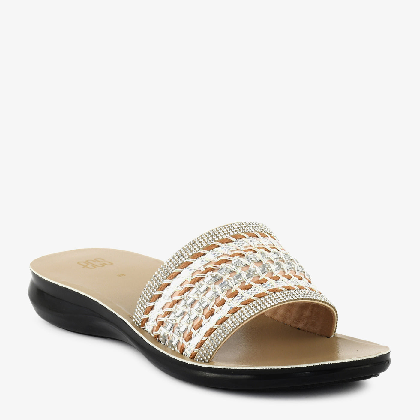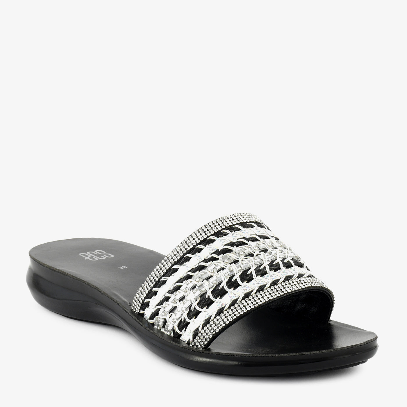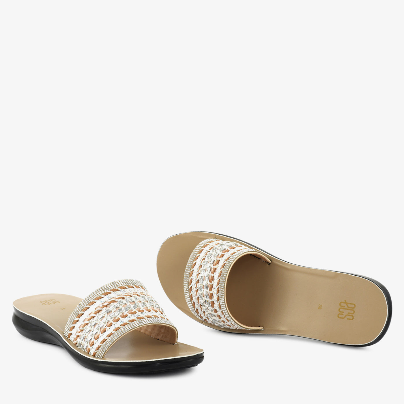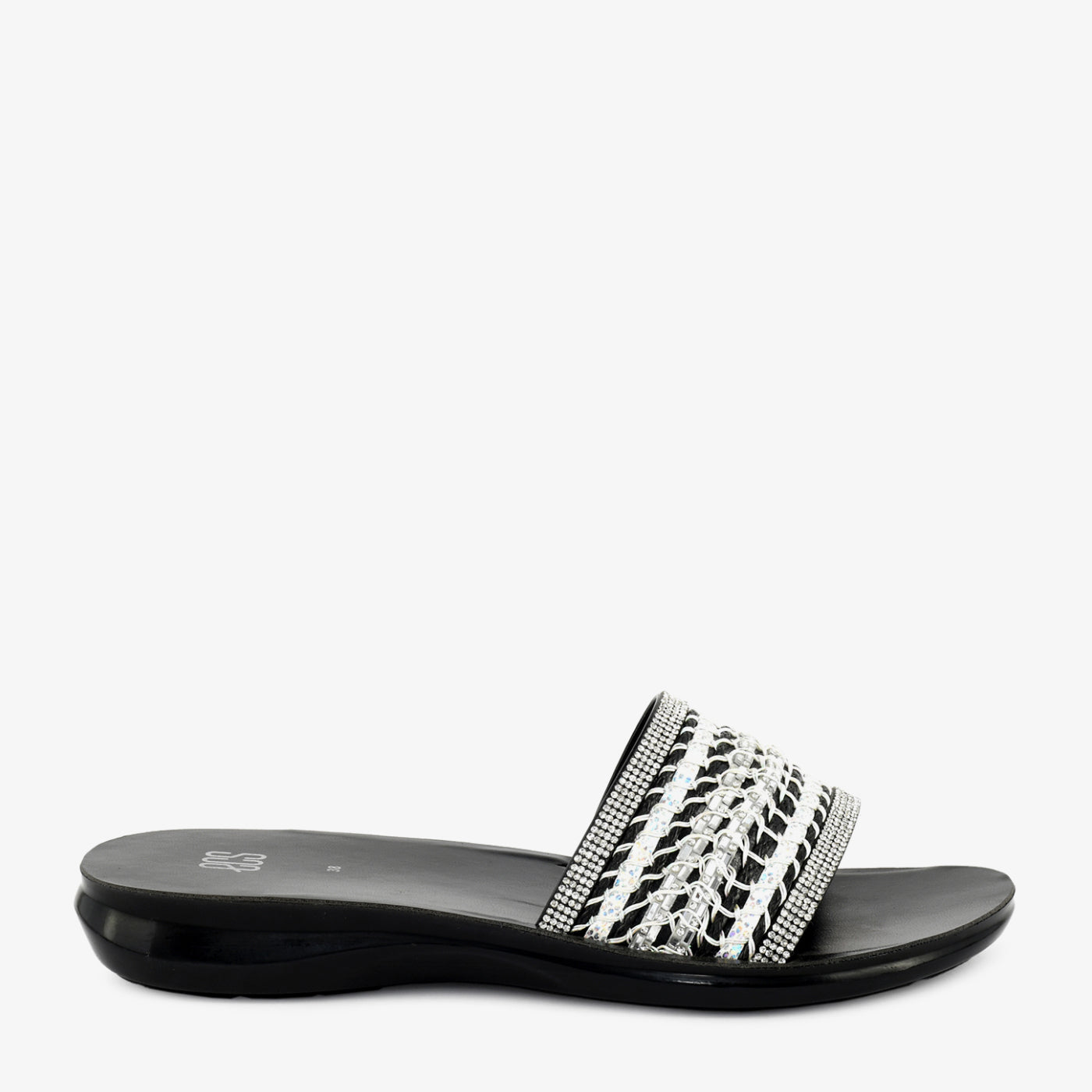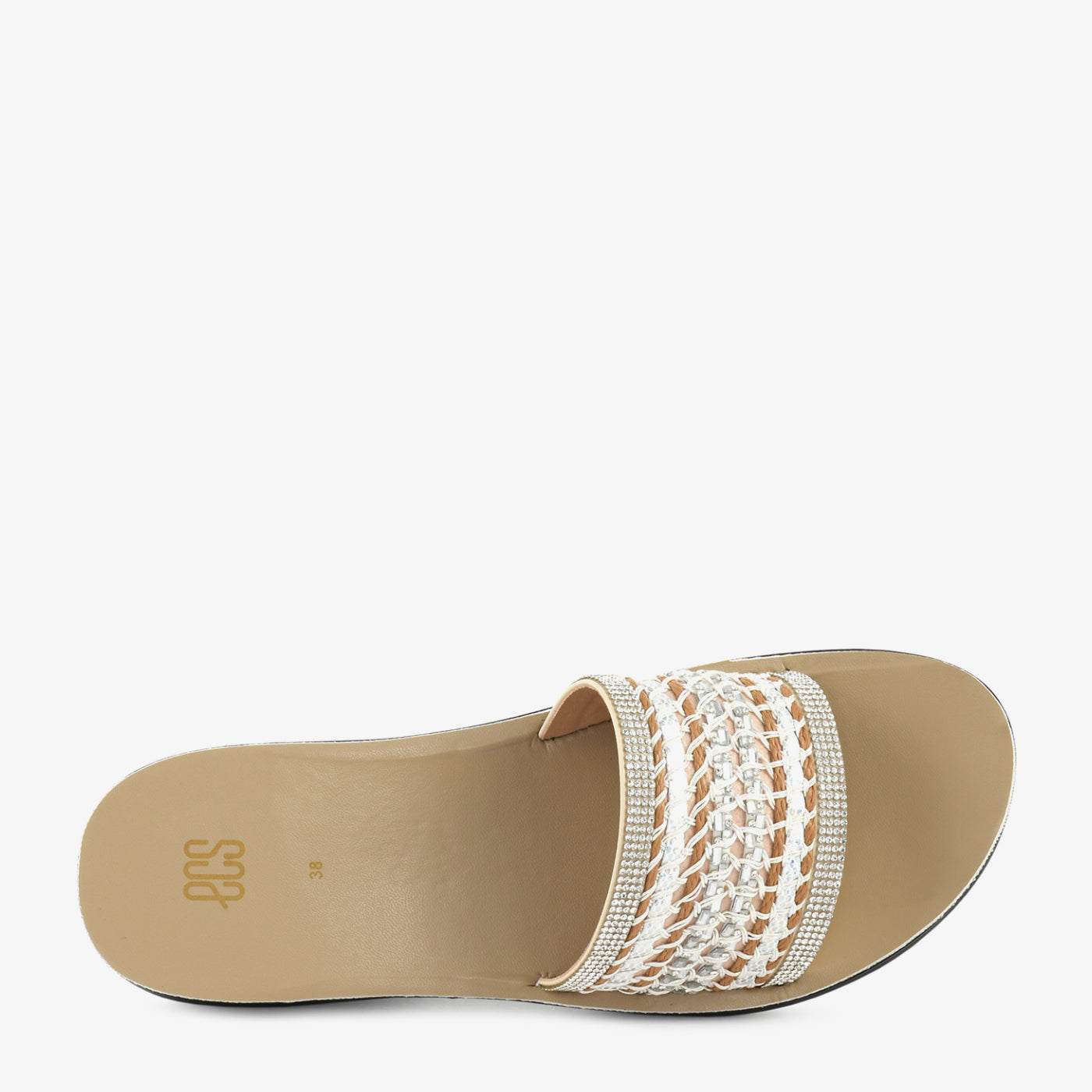 - Design: Wide-strap flat slipper with woven chain detail, crystal-set borders, and open square toe