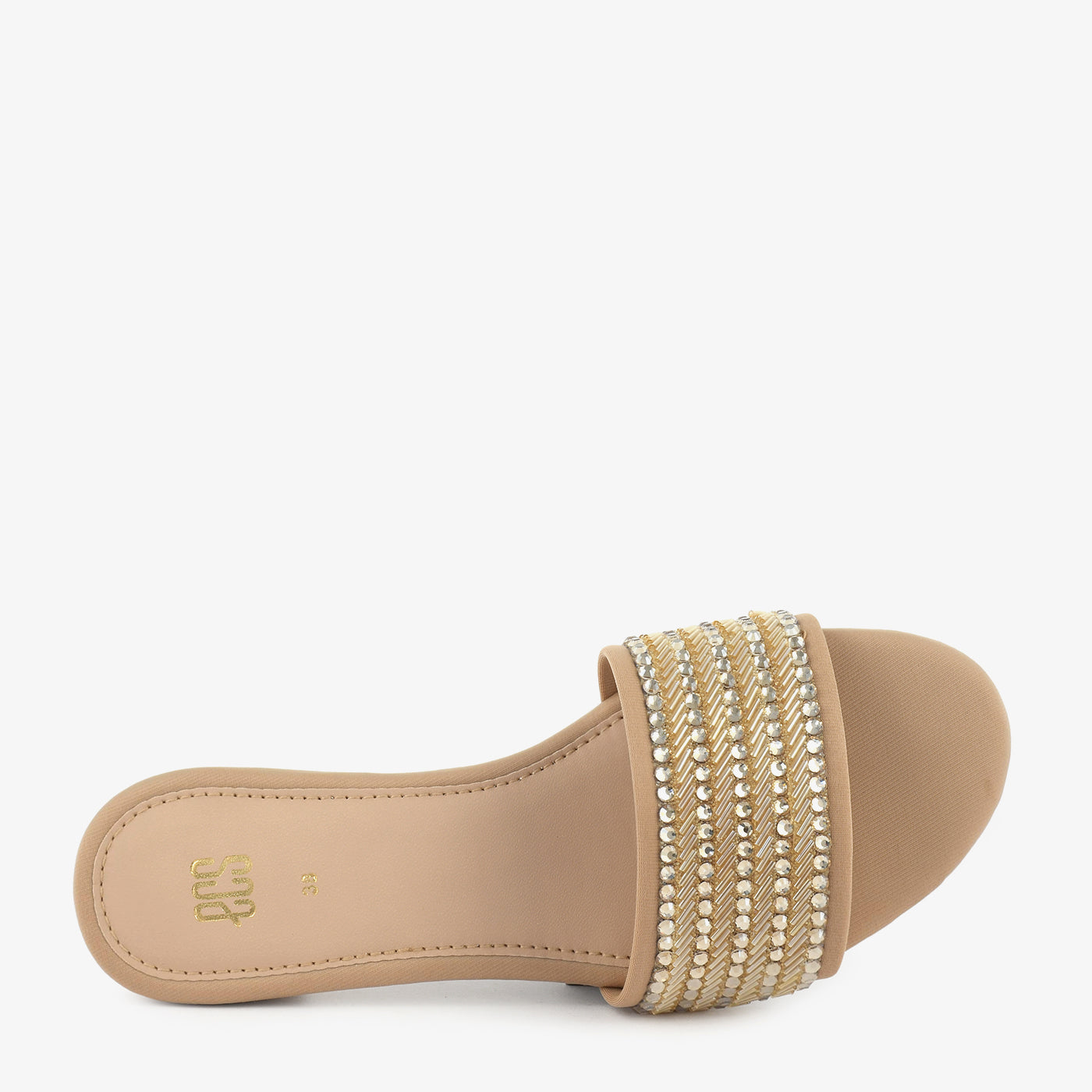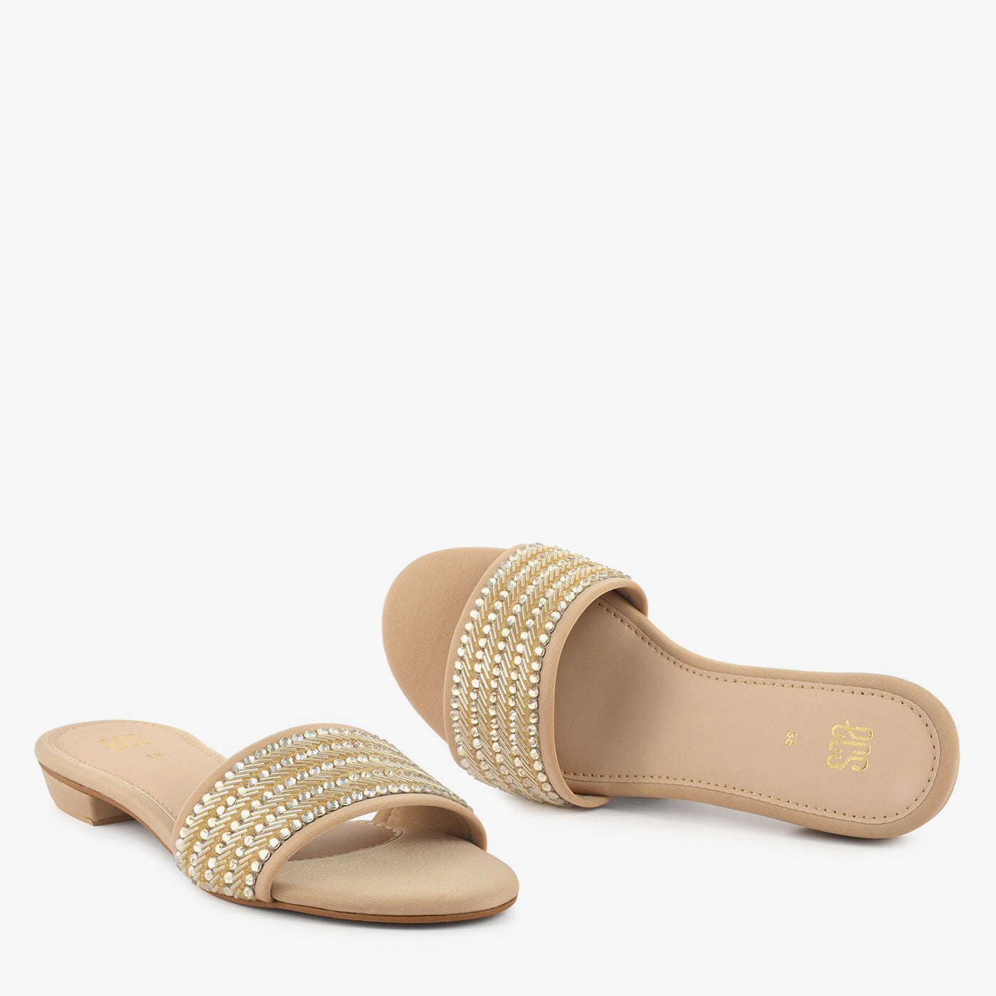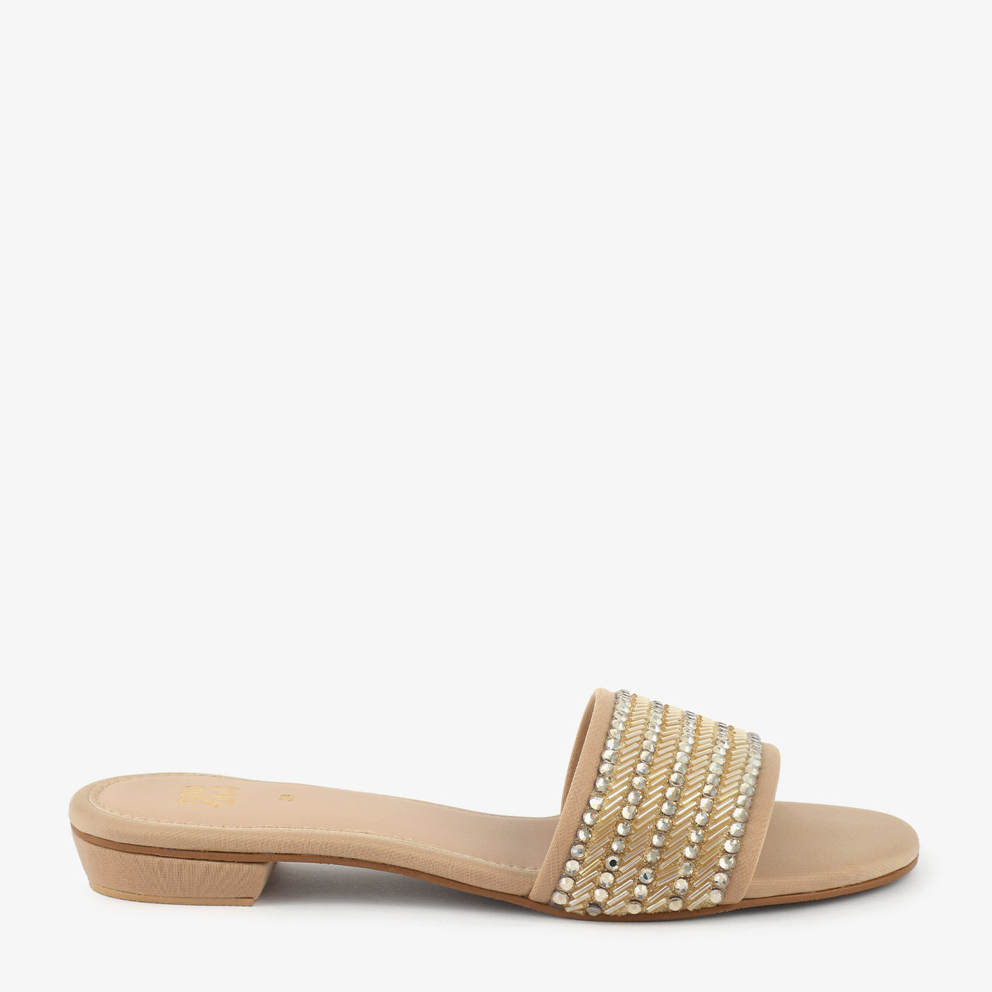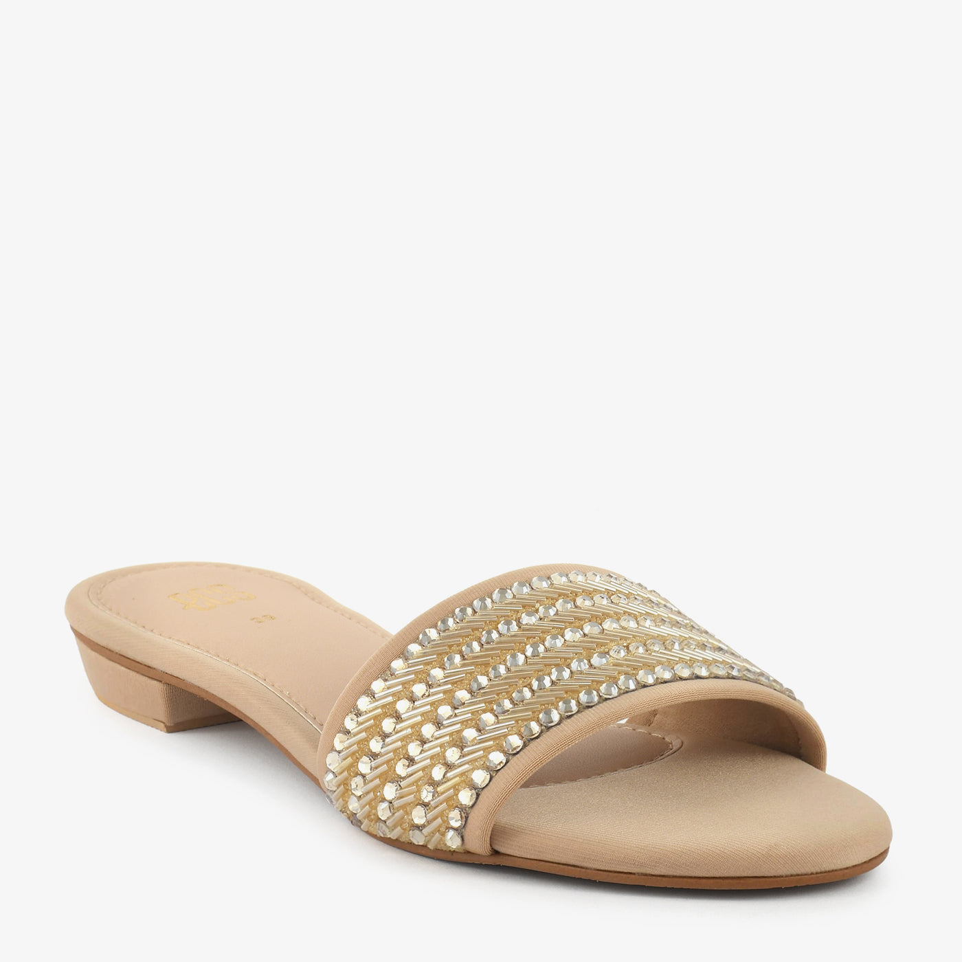 - Design: Embellished front strap slip on slipper with low heel