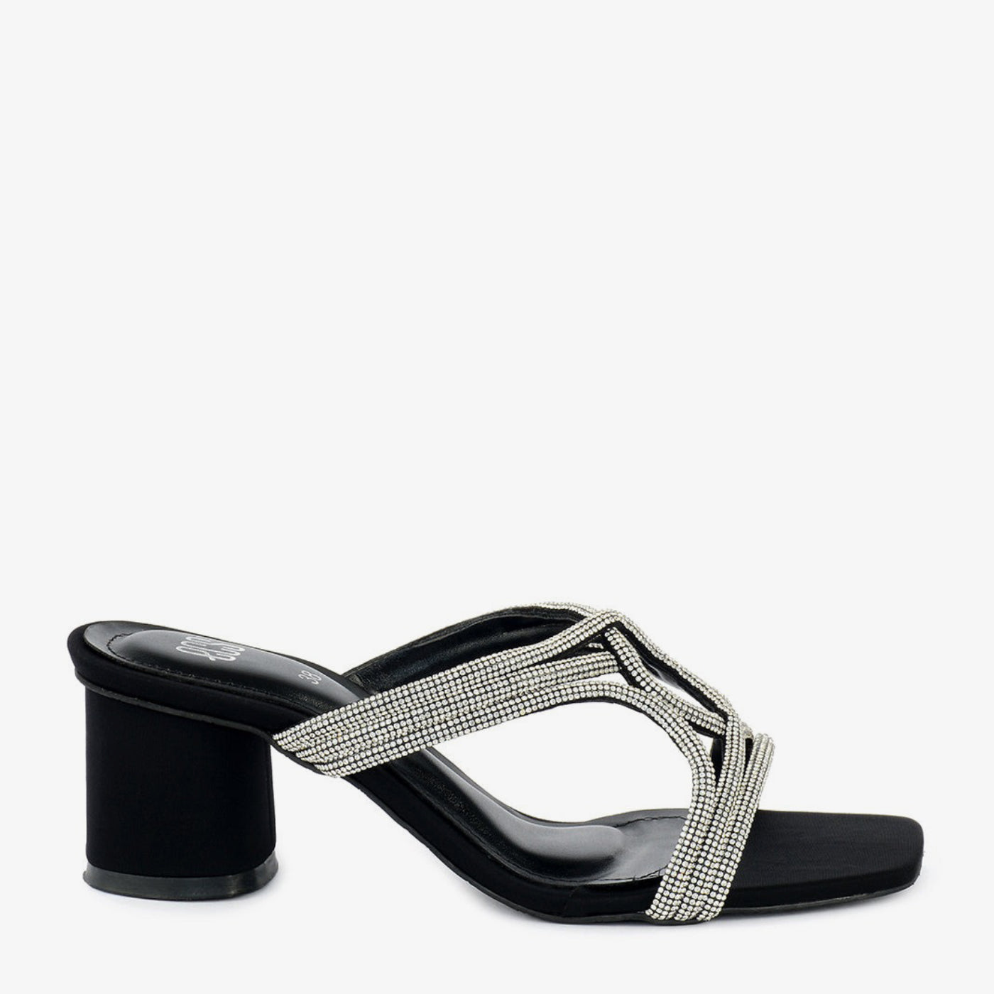 A stylish slipper with a square toe and a low block heel. The upper features an intricate lattice design adorned with numerous small, sparkling embellishments.