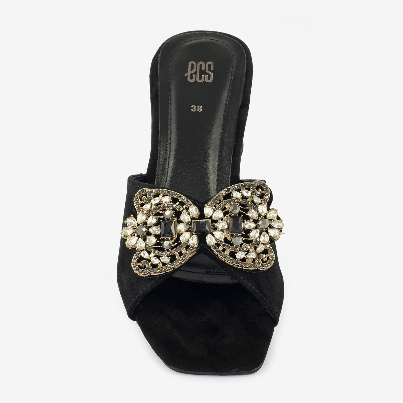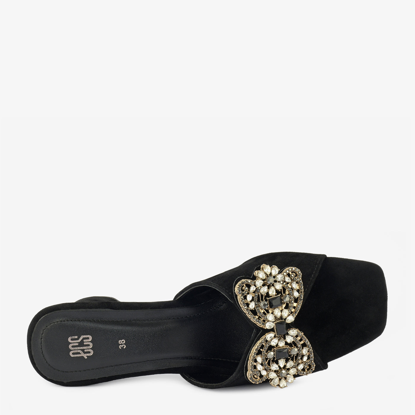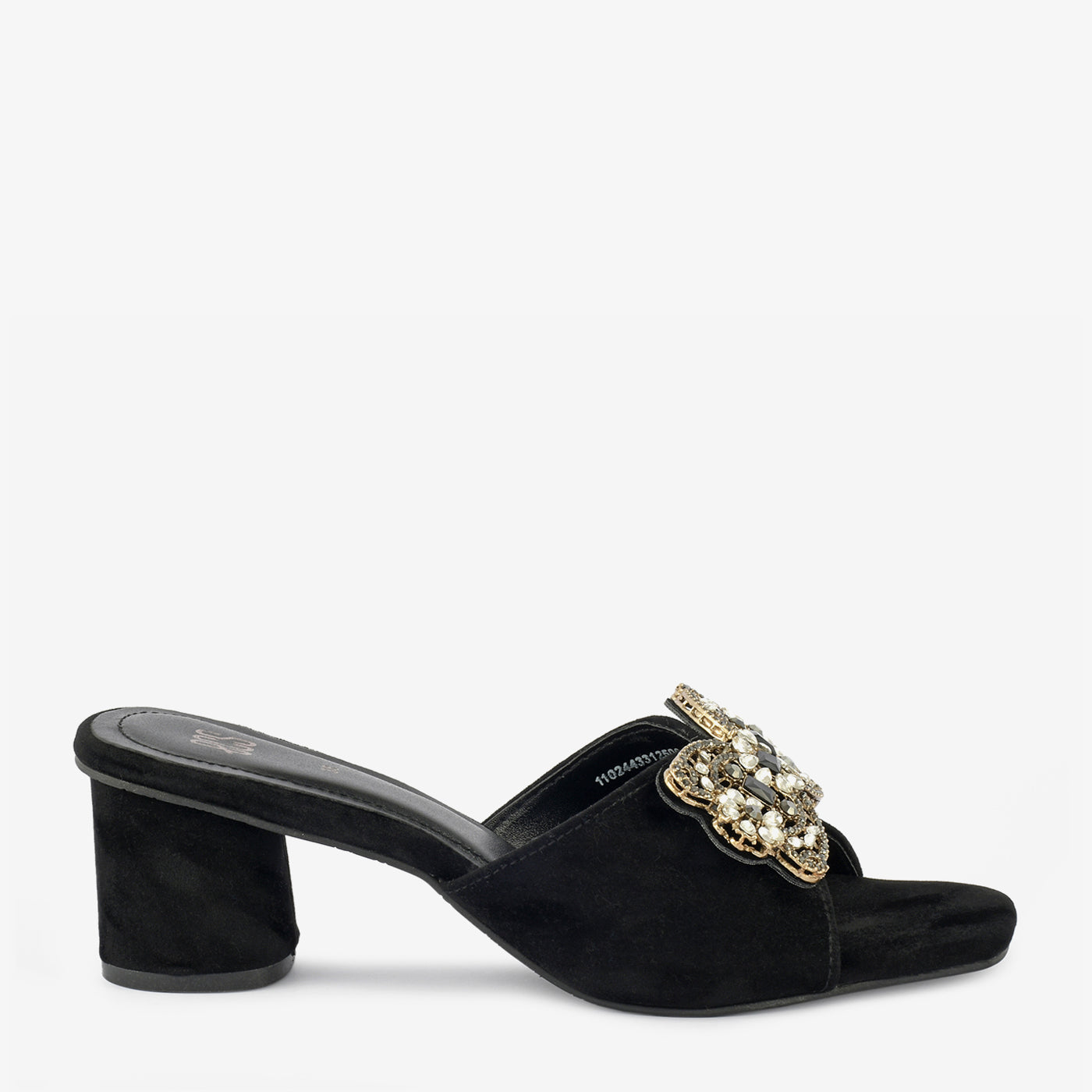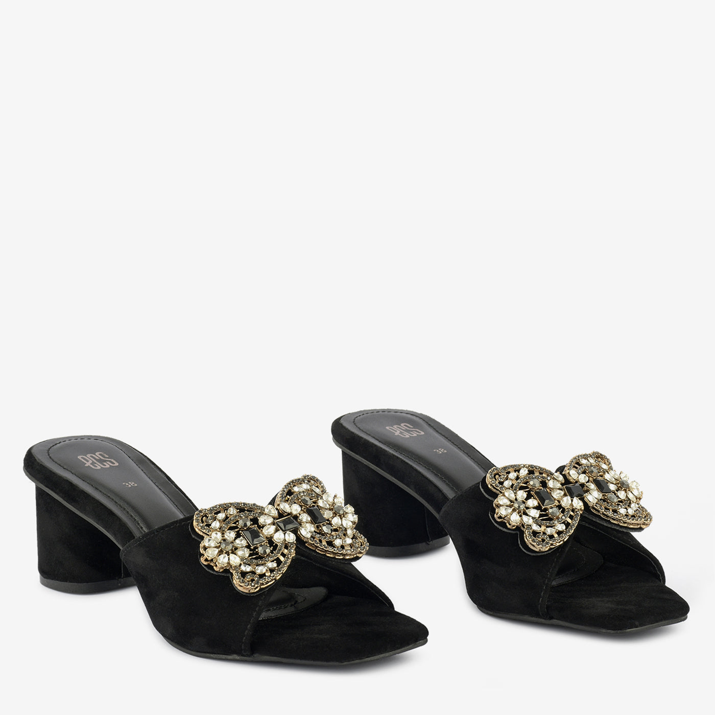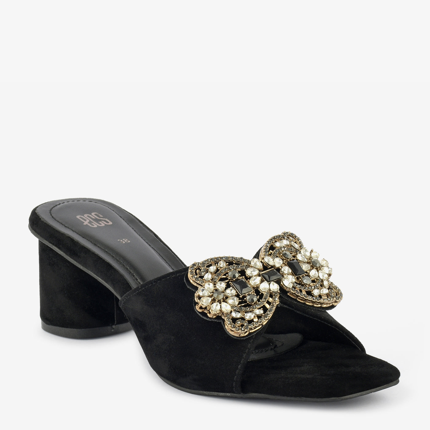 Jeweled Bow Block heel offer a touch of sophisticated glamour with their unique design. These black heel feature a comfortable block heel and a plush suede-like finish, complemented by a striking jeweled bow that adds a focal point of elegance. The slip-on design makes them perfect for adding a touch of refinement to your evening or special occasion looks.