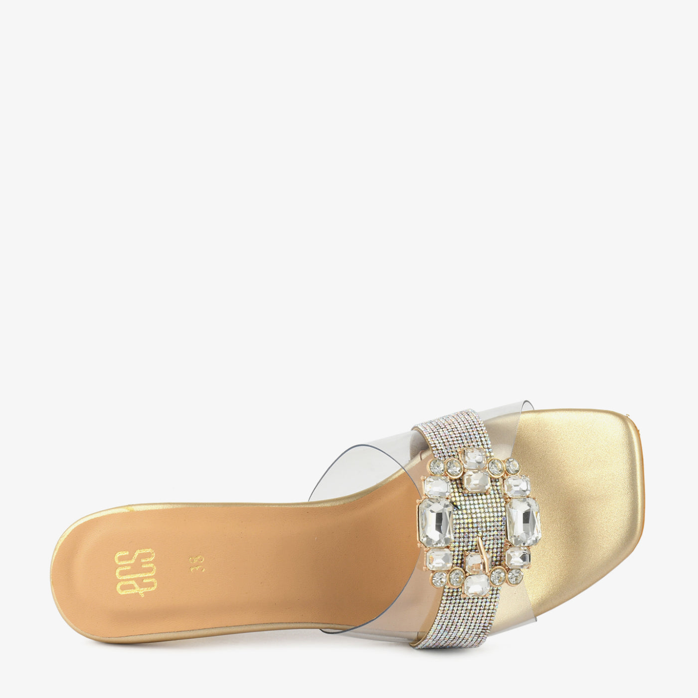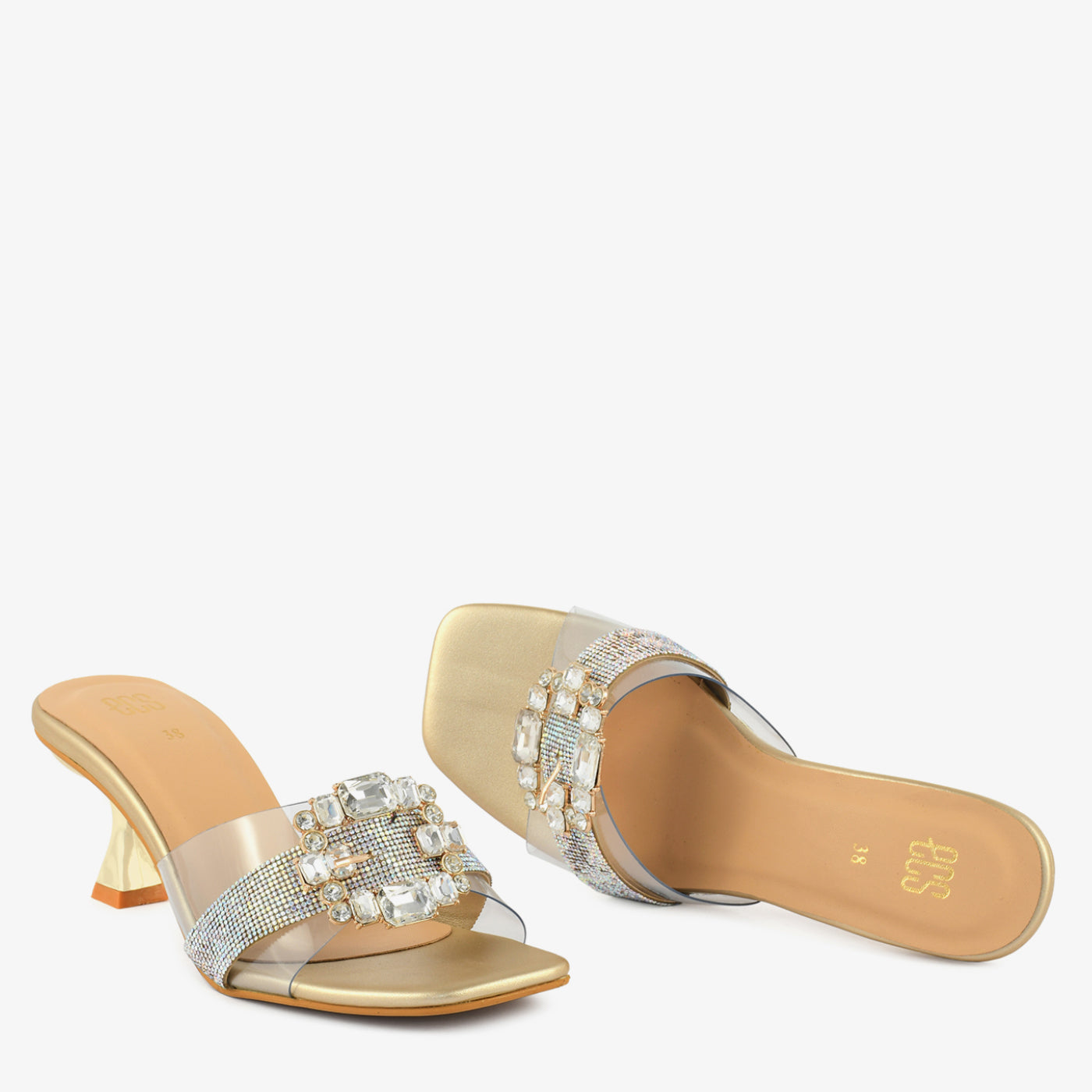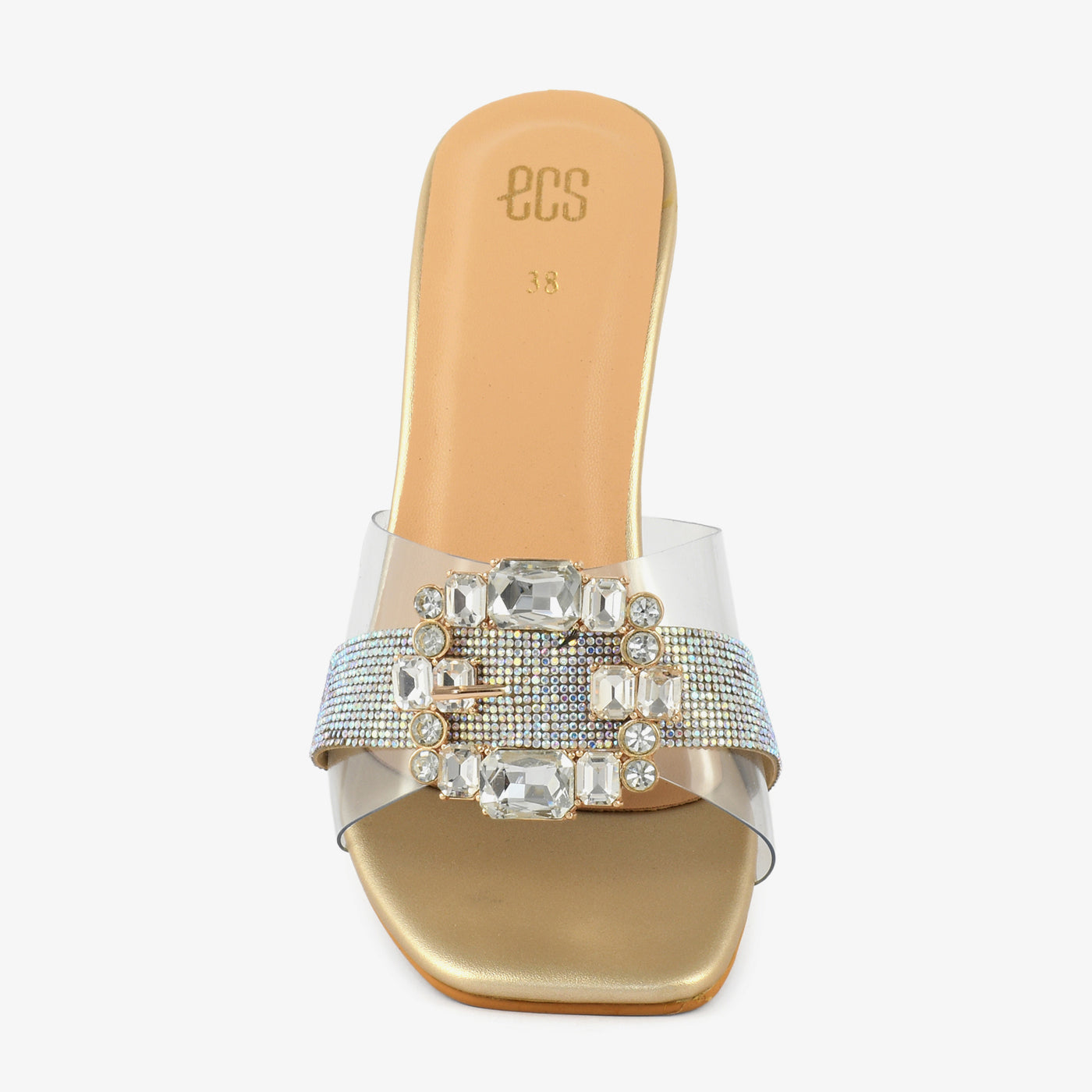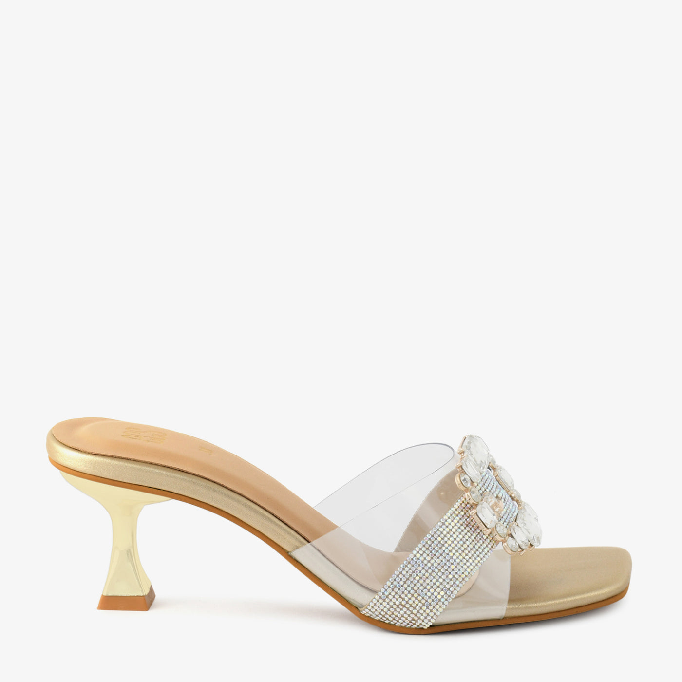 A radiant transparent mule with a dazzling crystal buckle and shimmering band. Its sleek silhouette adds grace to party outfits, while the cushioned base ensures comfort. The gleaming finish gives your steps a refined sparkle, ideal for festive or formal wear.