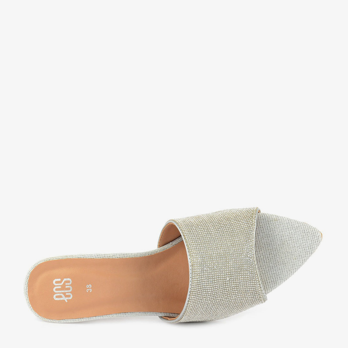 Introducing the Glimmer Point Slippers, crafted to bring elegance and shine to your look. Made from high-quality synthetic PU, these slippers feature a sophisticated pointy toe shape and are set on a classic French heel for a touch of refinement. The glittery finish adds a sparkling allure, making them perfect for special occasions or an elevated everyday style. With a sleek design and sheet sole, these slippers provide a chic, slip-on experience.