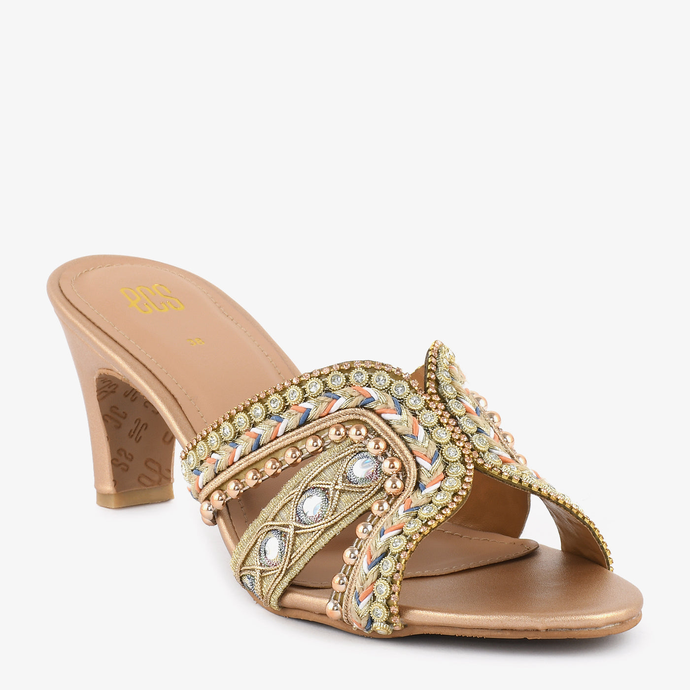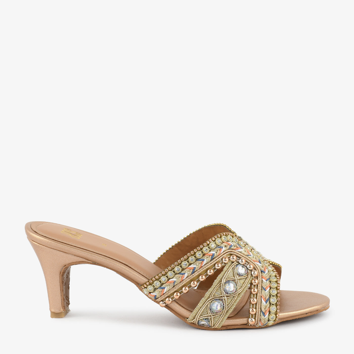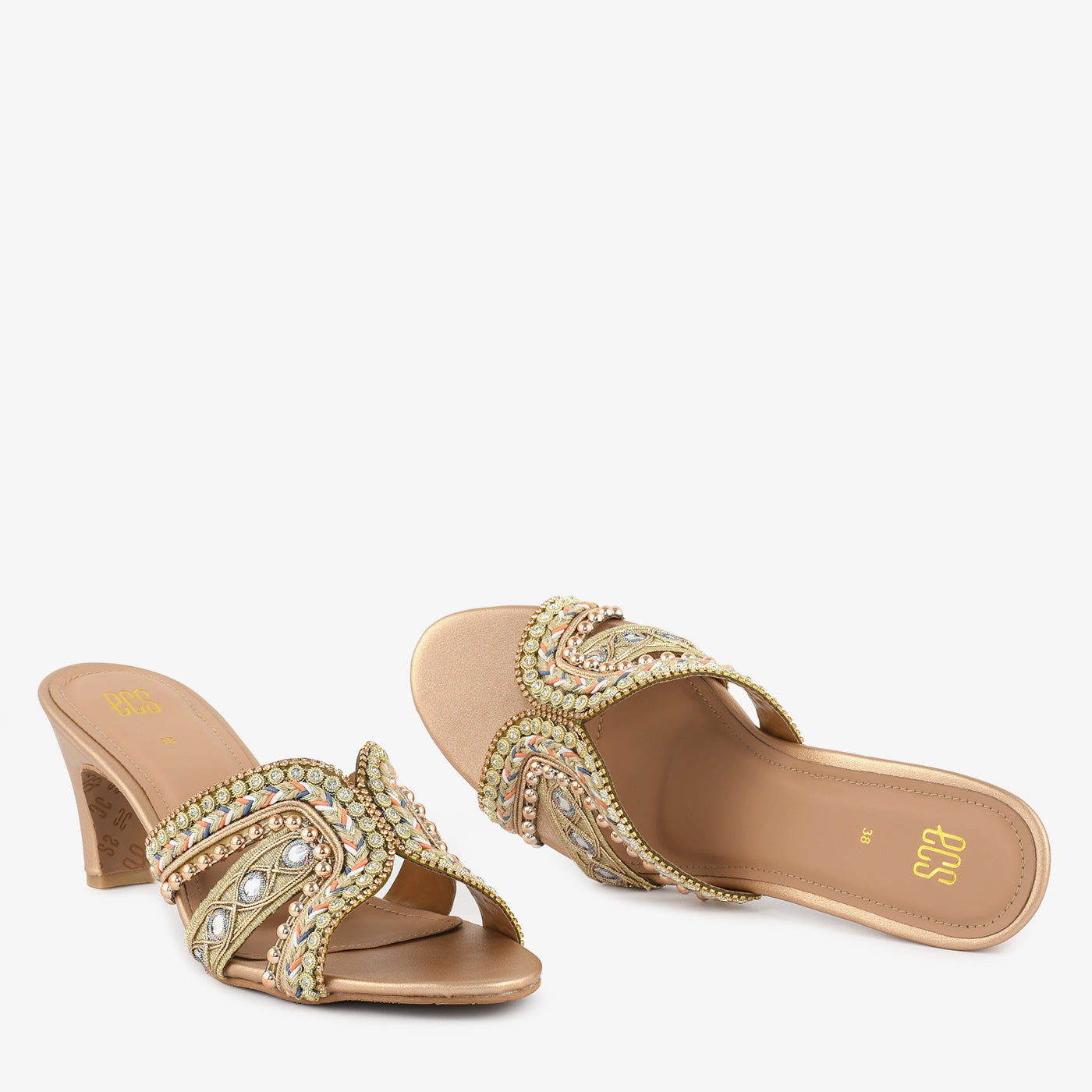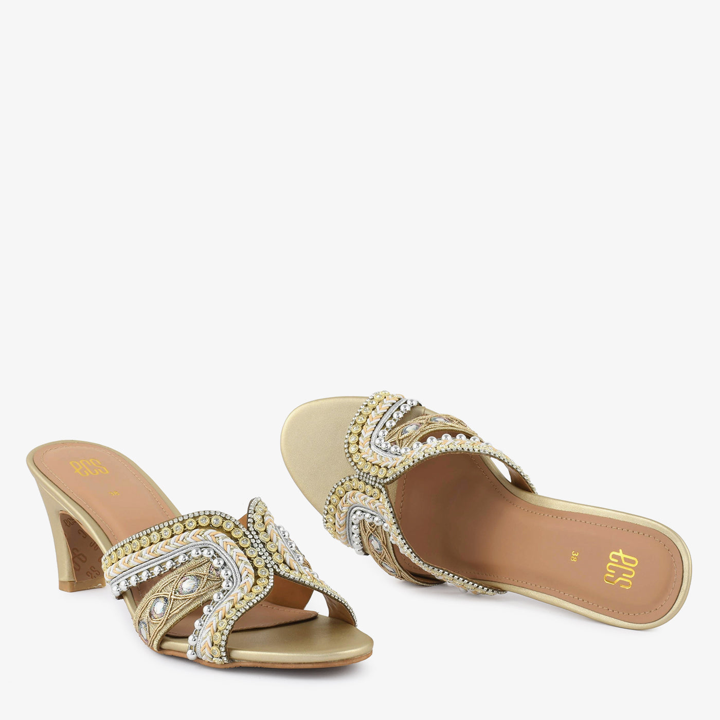 An exquisite mule heel designed with detailed beadwork and textured embroidery. The embellished crossover straps add sophistication, making it an ideal pick for festive or celebratory occasions. Crafted for comfort and poise, it blends tradition with contemporary style.