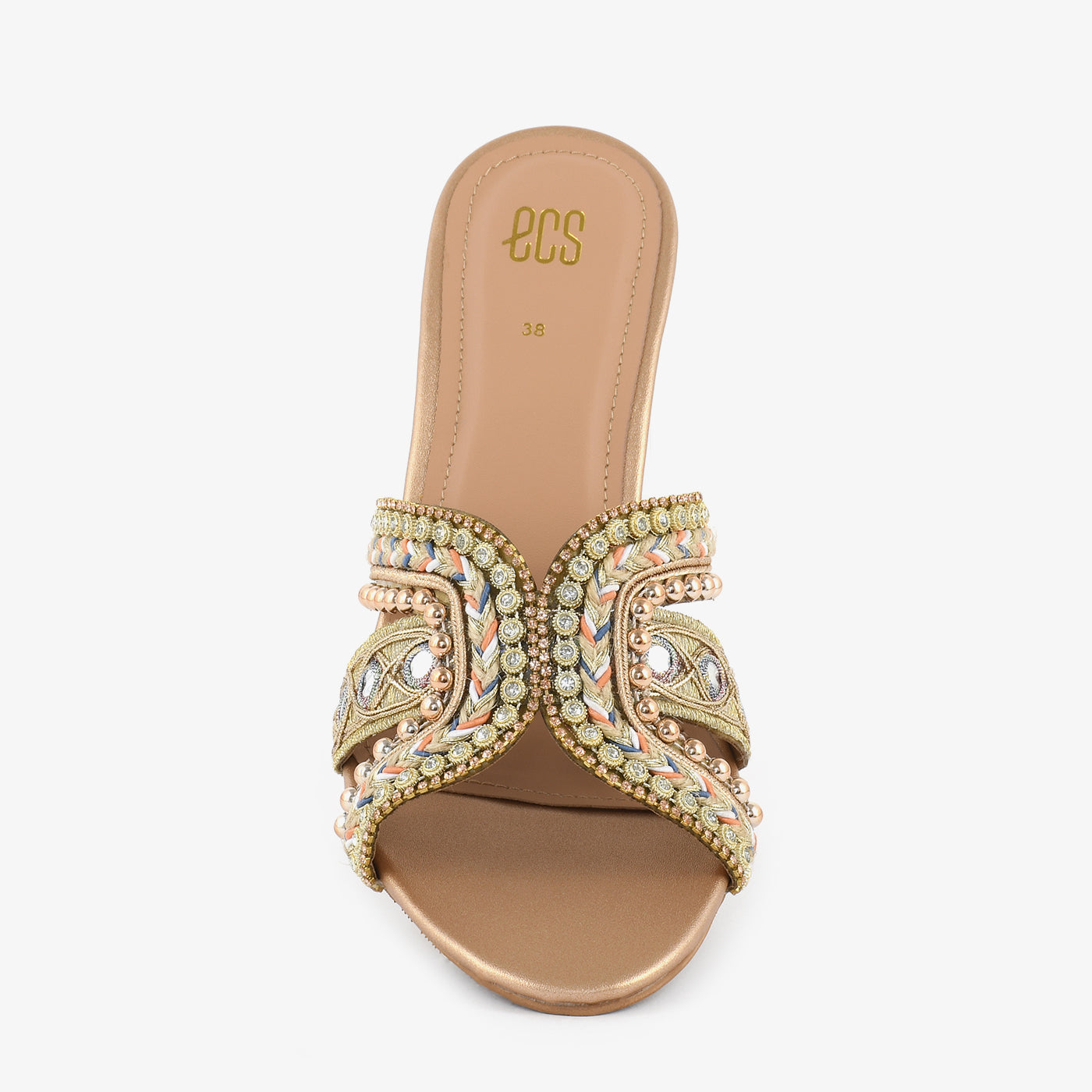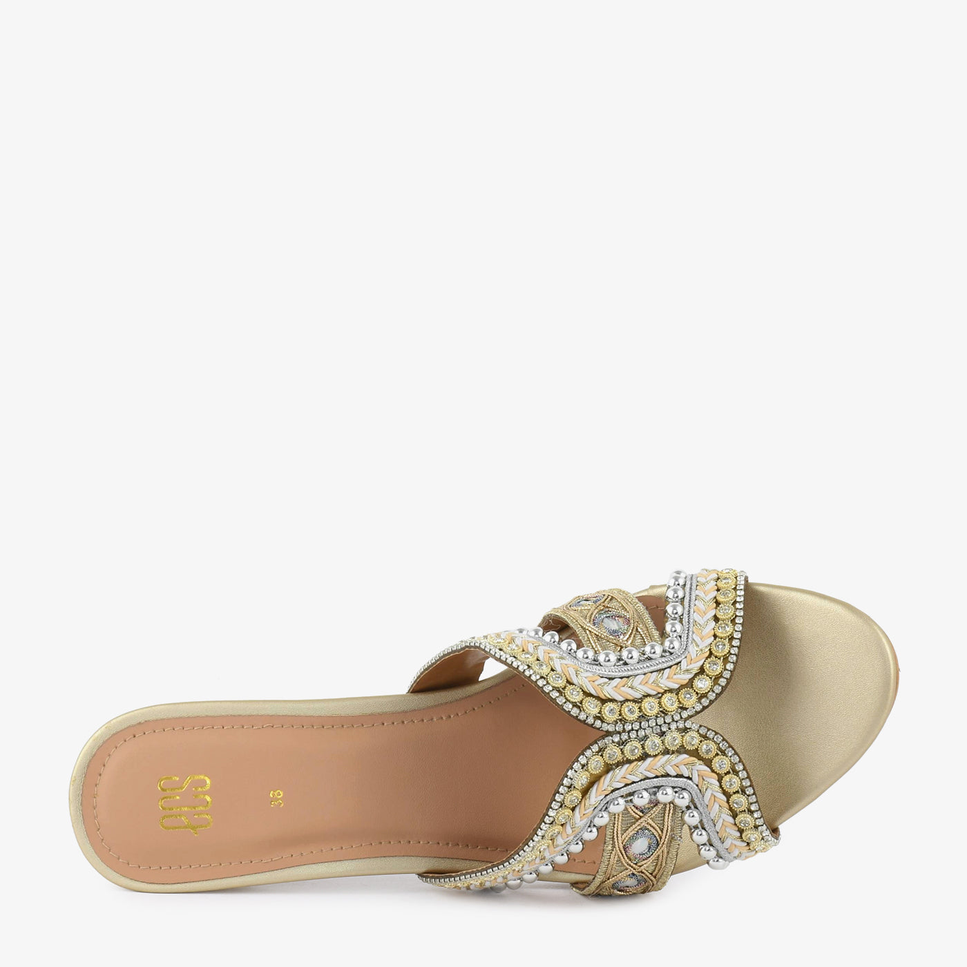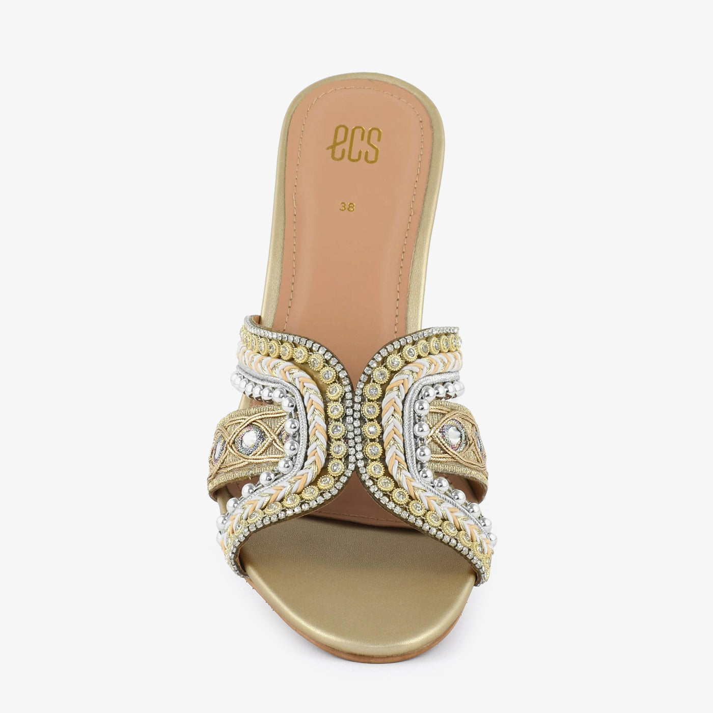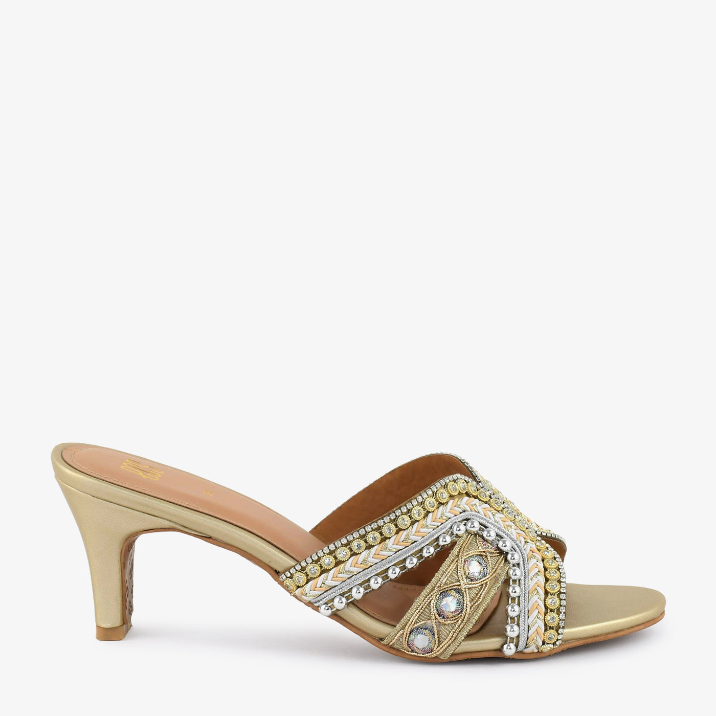 An exquisite mule heel designed with detailed beadwork and textured embroidery. The embellished crossover straps add sophistication, making it an ideal pick for festive or celebratory occasions. Crafted for comfort and poise, it blends tradition with contemporary style.