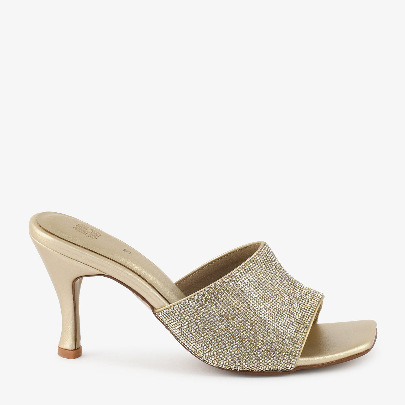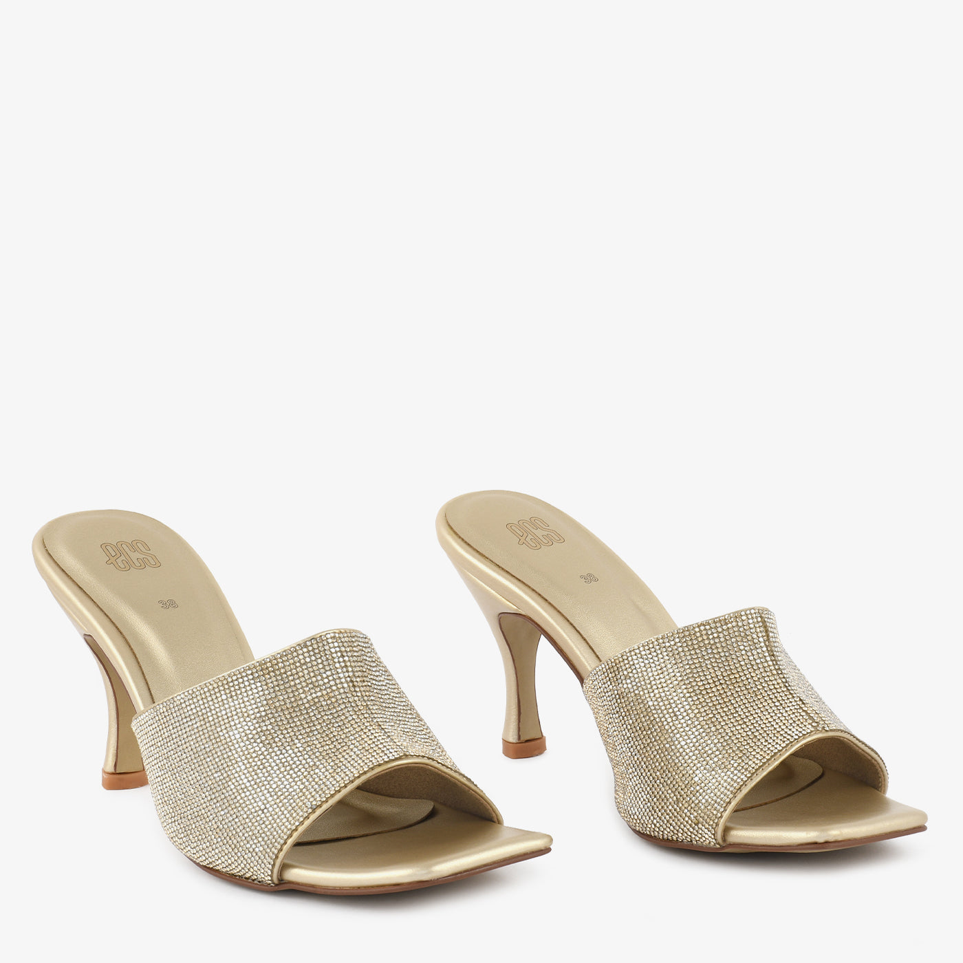 A dazzling mule heel crafted with a sleek, crystal-studded upper that captures light beautifully. The minimalist silhouette and smooth finish make it an elegant addition to any party or evening look. Designed for both comfort and sophistication.