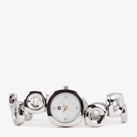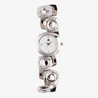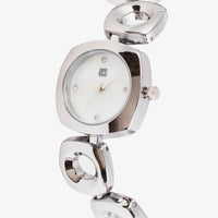 Adorn your wrist with this uniquely designed women's watch. It features a subtly cushioned square dial with minimal hour markers and a polished finish, housed within a contoured case. The distinctive bracelet is composed of large, interlocking geometric links with circular cutouts, creating a modern and eye-catching design.