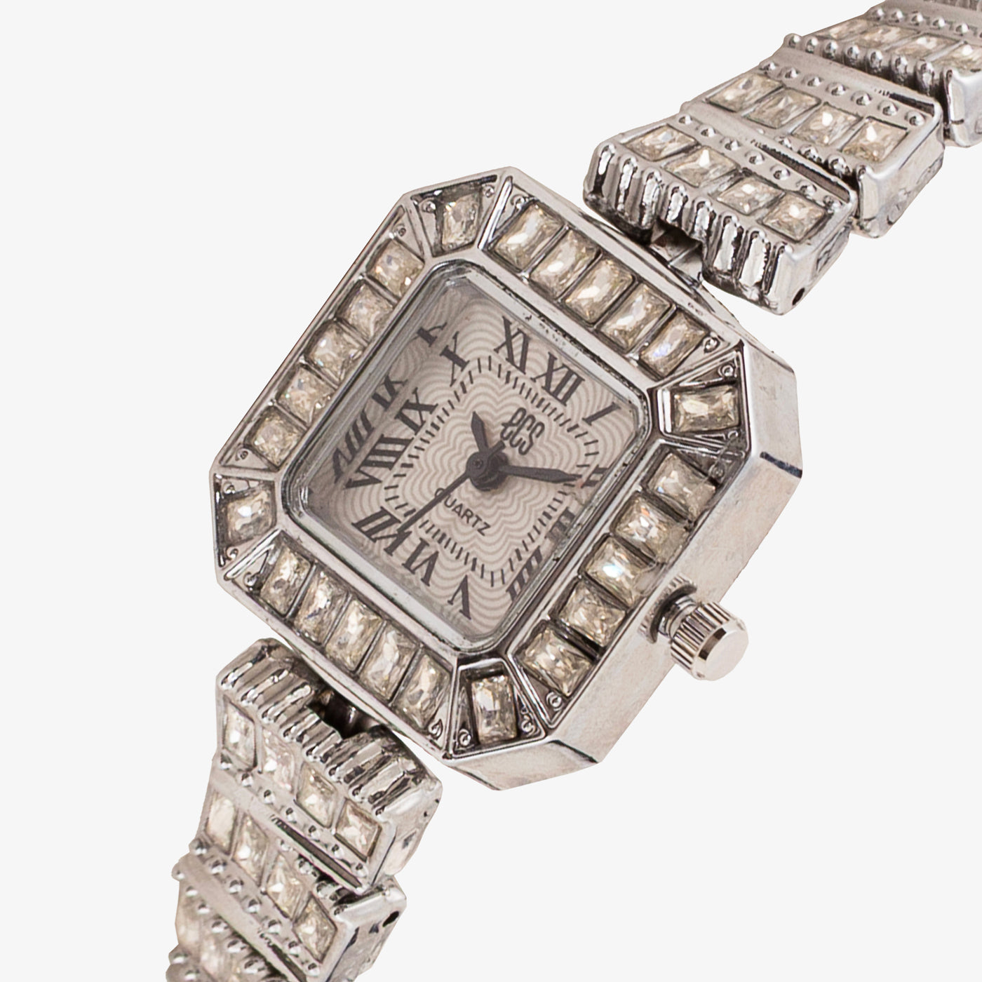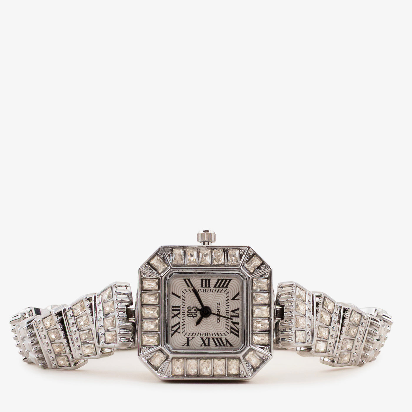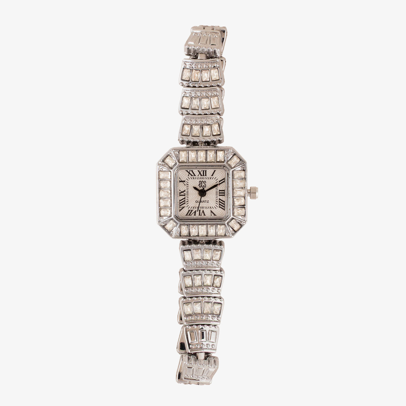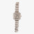 - Design: Square dial with classic numerals and ornate bracelet-style strap
