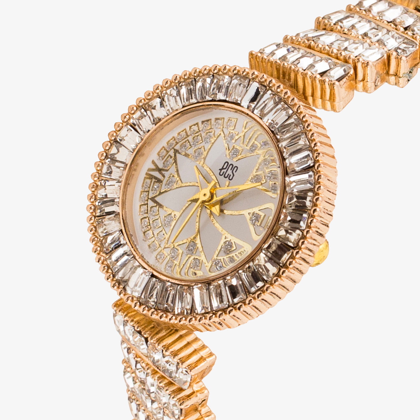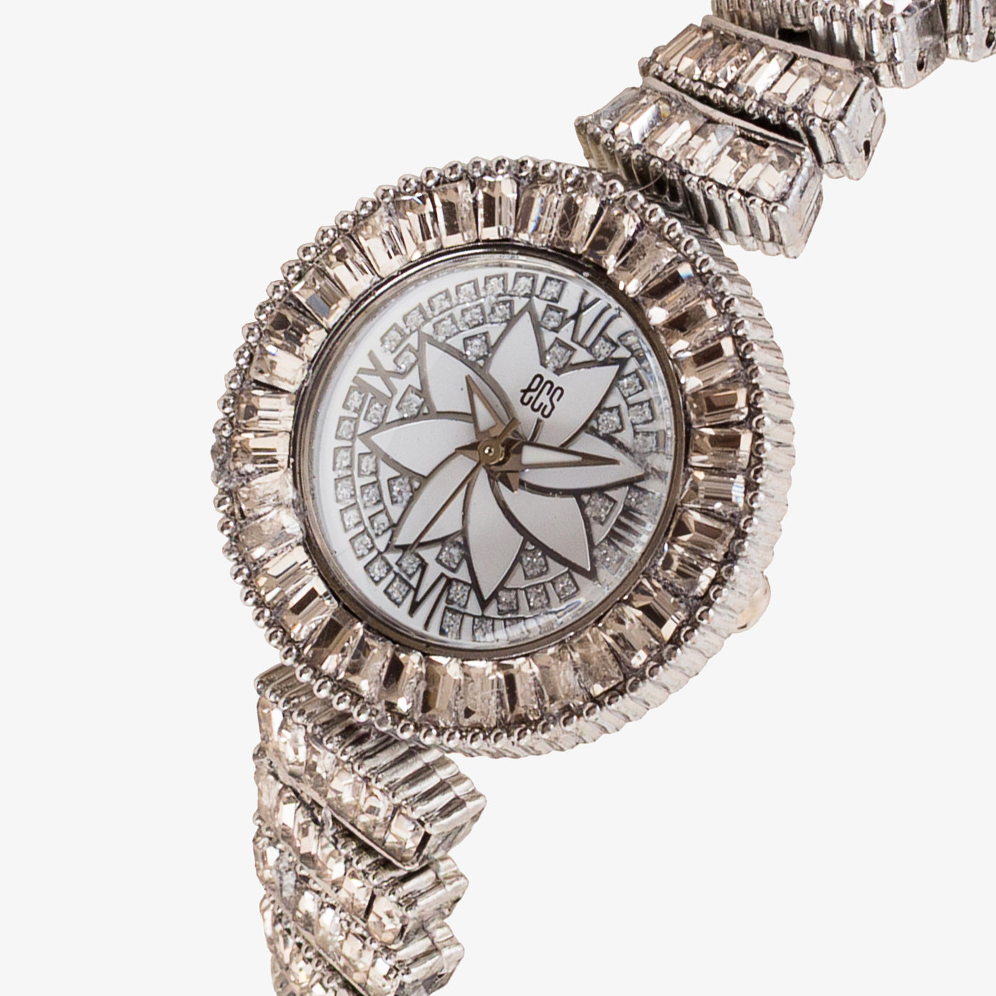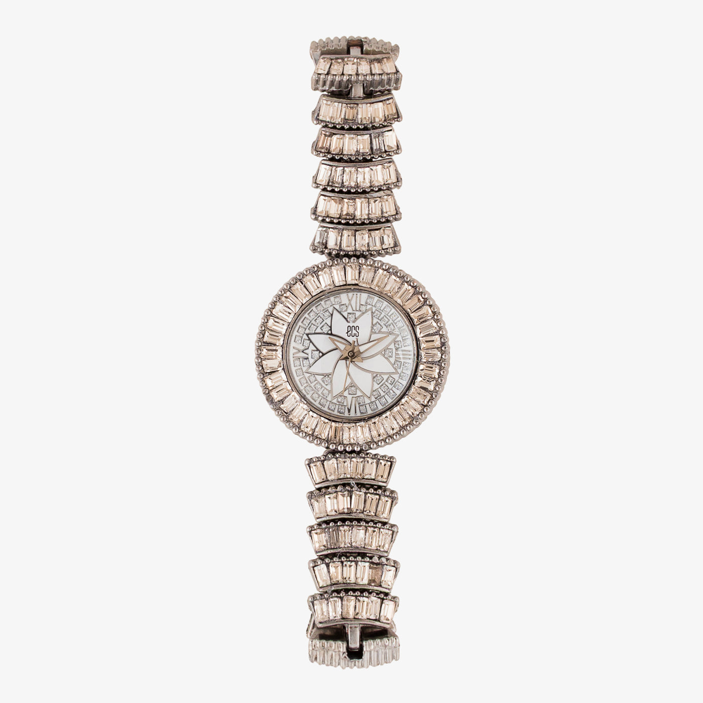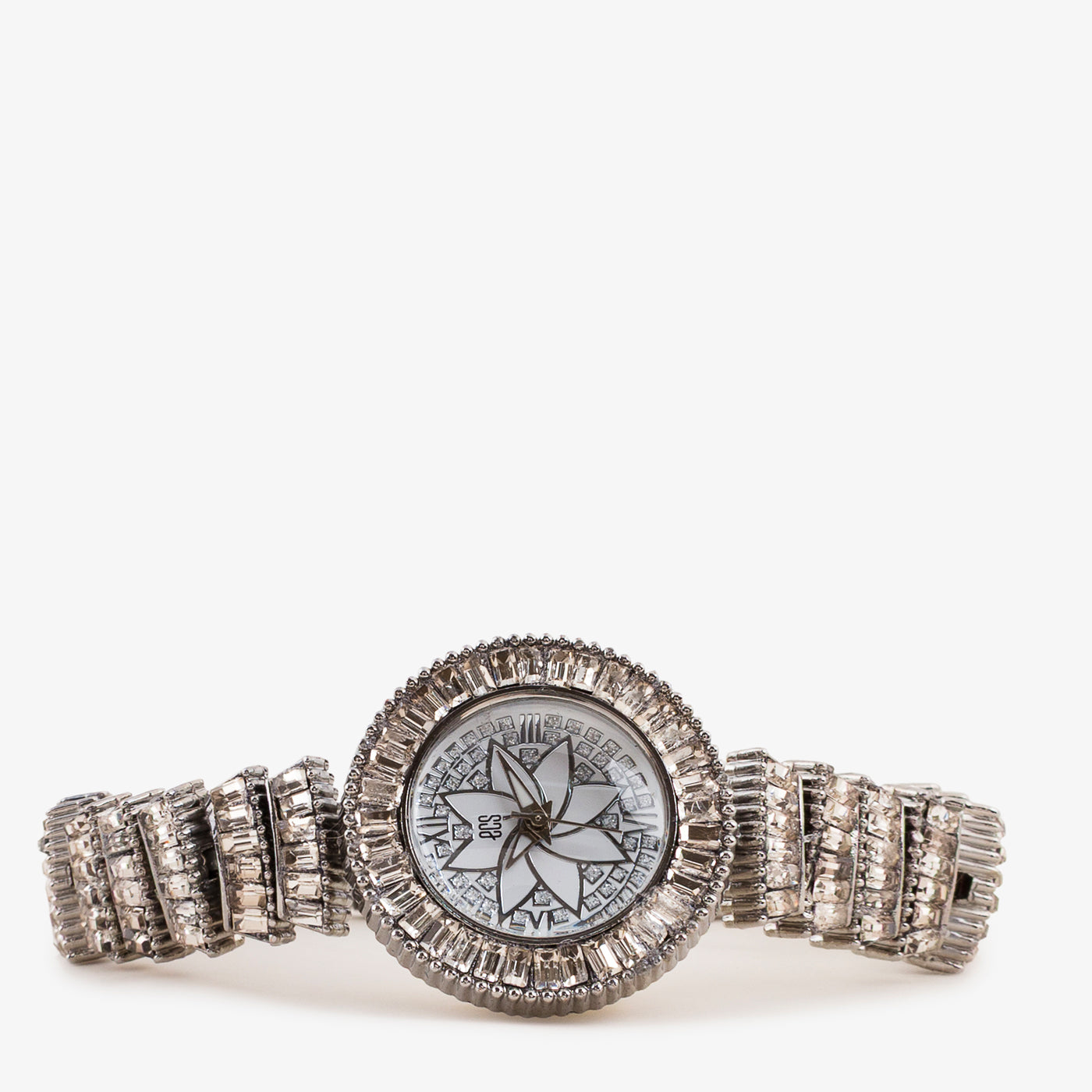 This beautifully crafted wristwatch is designed to make a statement with its intricate detailing and refined elegance. The round dial features a graceful floral-inspired motif at the center, creating a distinctive and artistic look. Surrounded by carefully set crystal accents, the bezel adds depth and sophistication, while the structured bracelet enhances durability and comfort. Thoughtfully designed for both style and practicality, this watch is perfect for those who appreciate standout accessories with timeless charm.