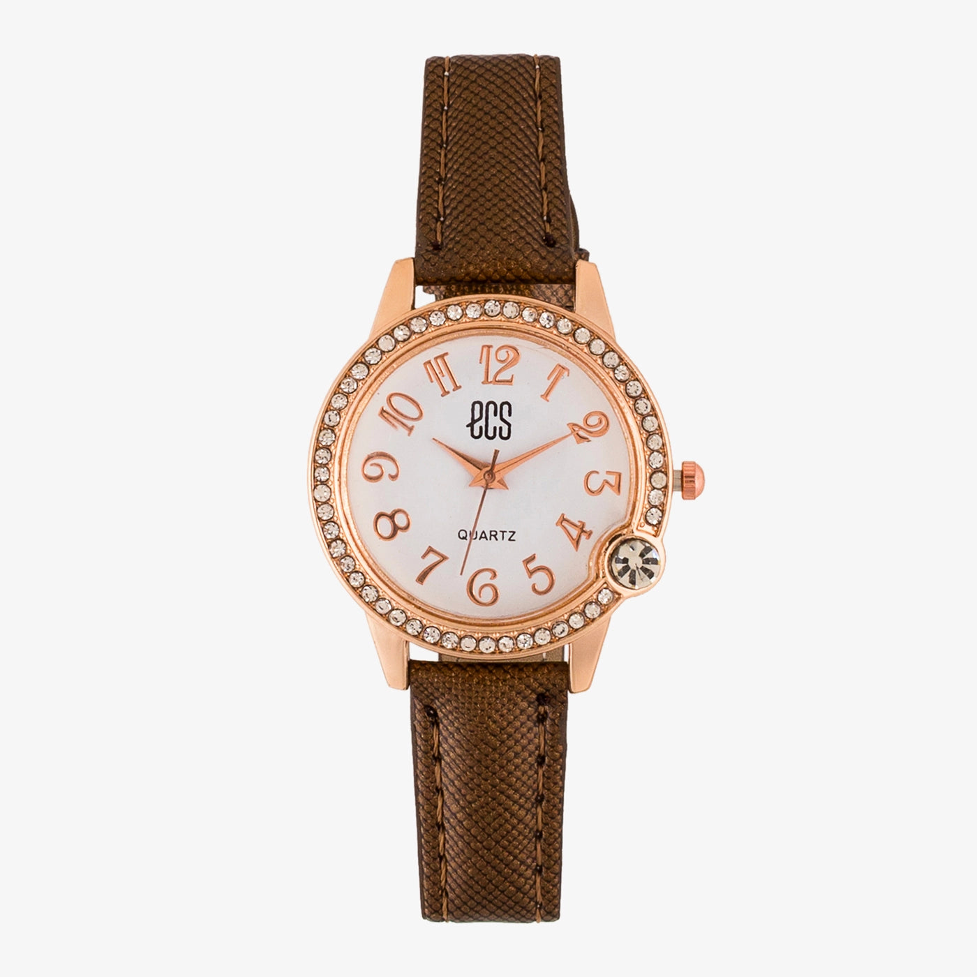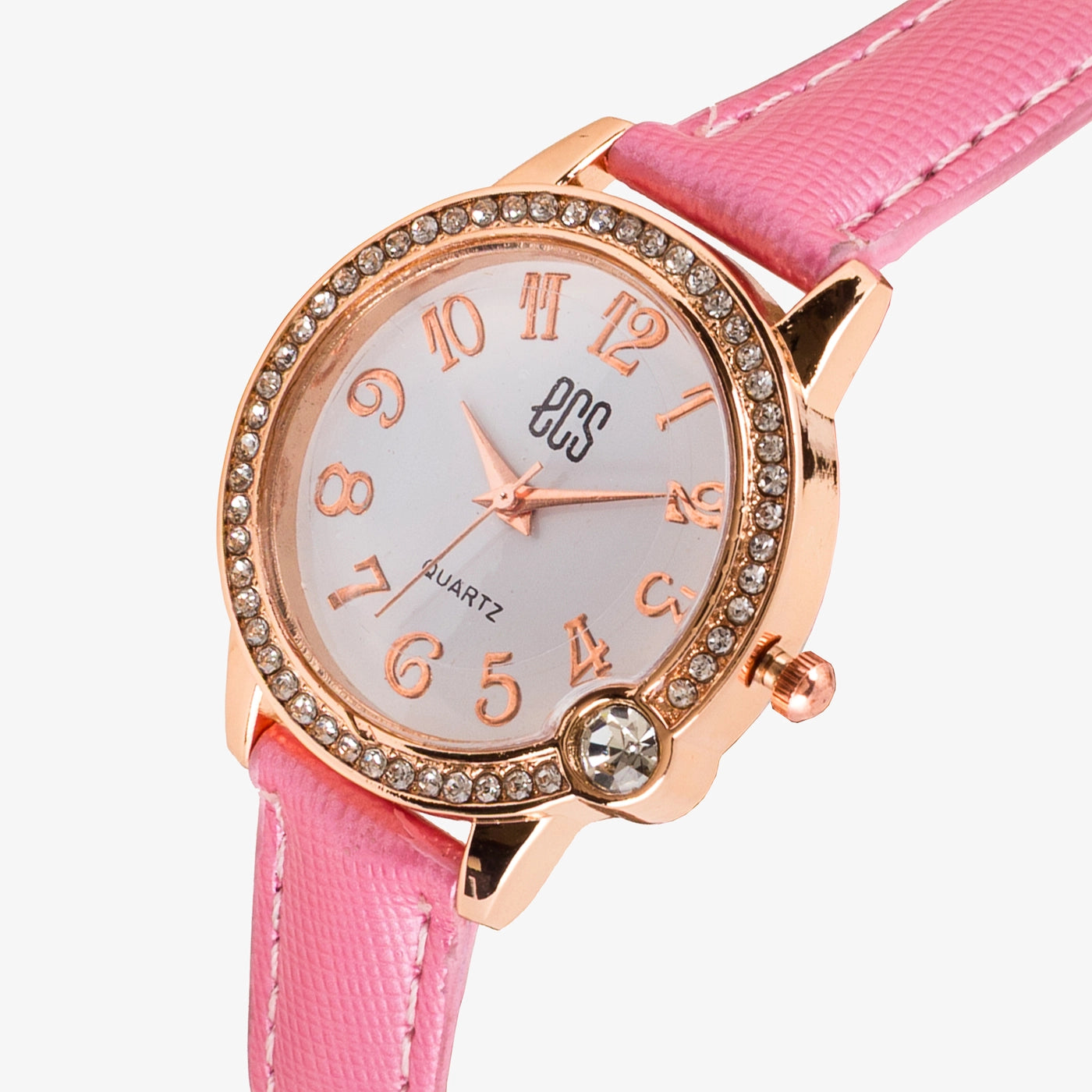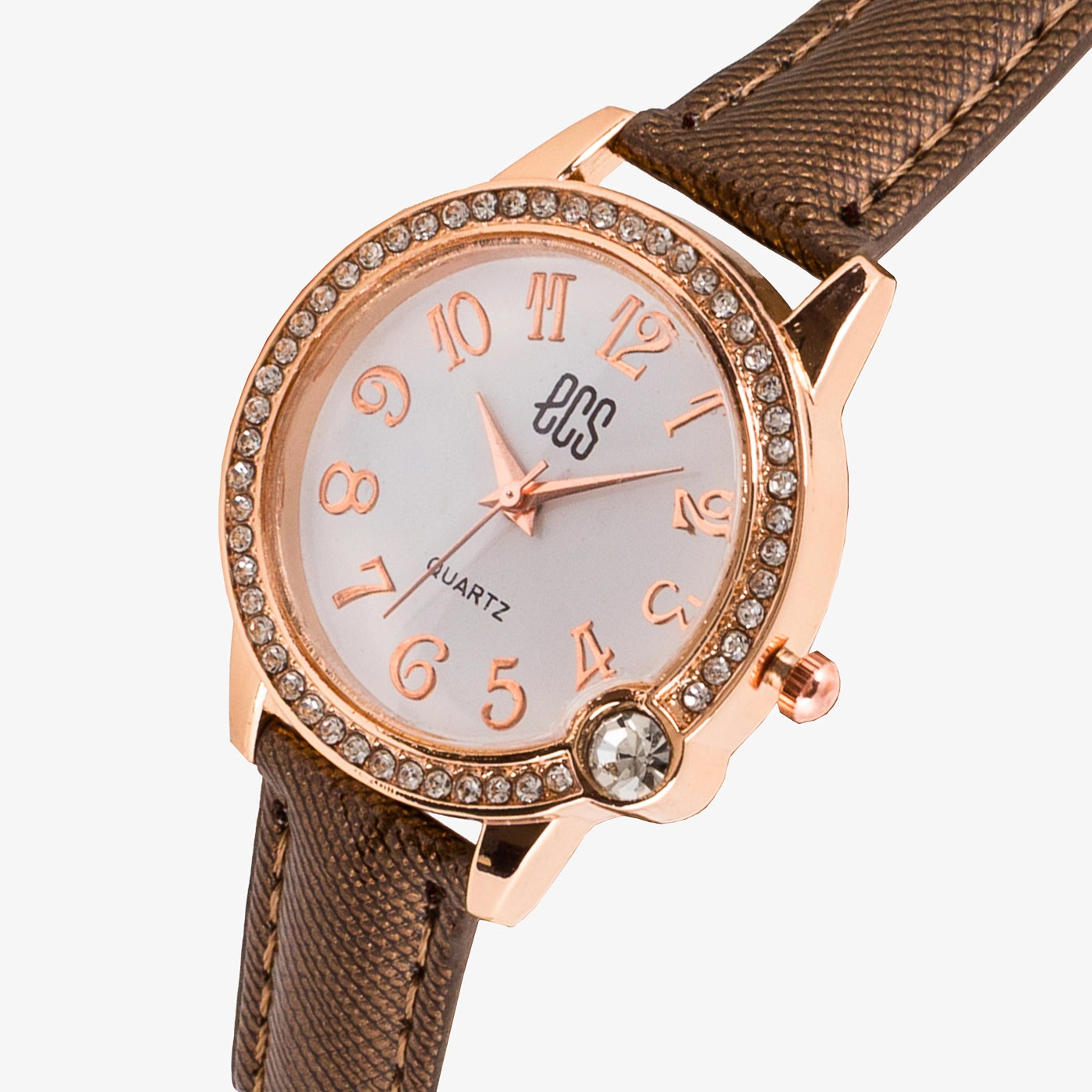 This elegant wristwatch is thoughtfully designed to blend classic charm with everyday sophistication. The round dial features clear numeric markers for easy readability, framed by delicate crystal detailing that adds a refined decorative touch. A smooth, comfortable strap ensures a secure fit for all-day wear, while the precise quartz movement offers reliable and accurate timekeeping. Ideal for both daily use and special moments, this watch is a graceful addition to any accessory collection.