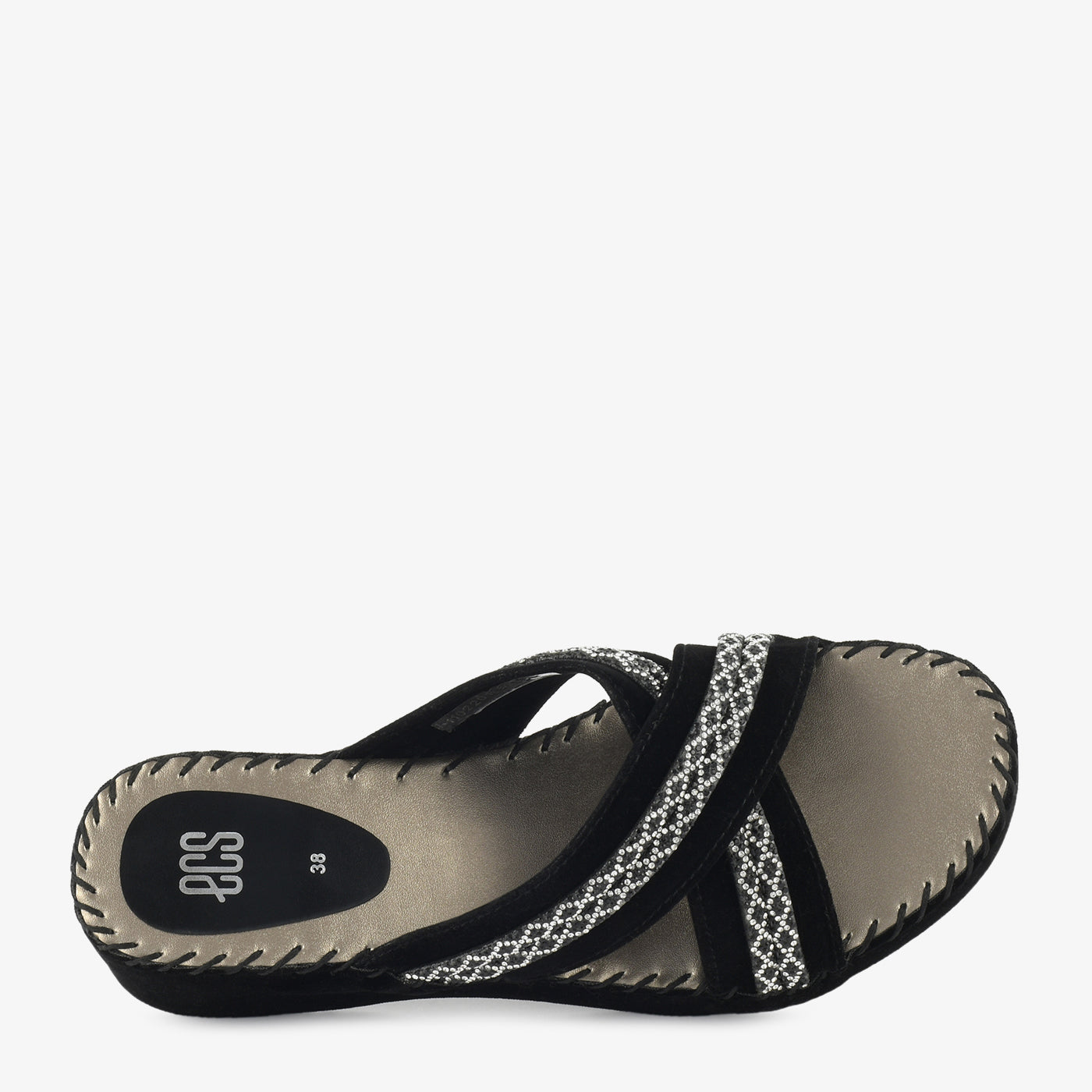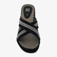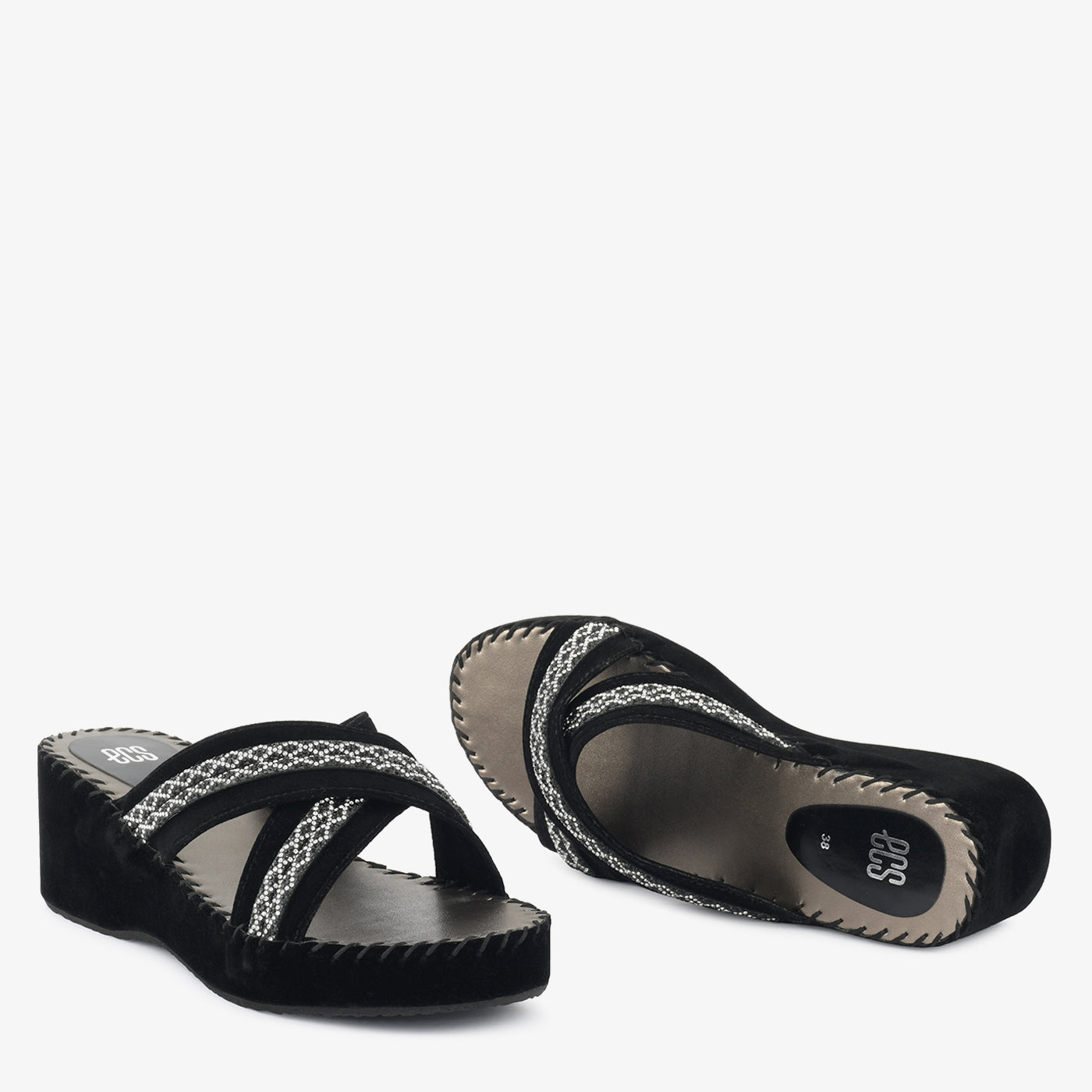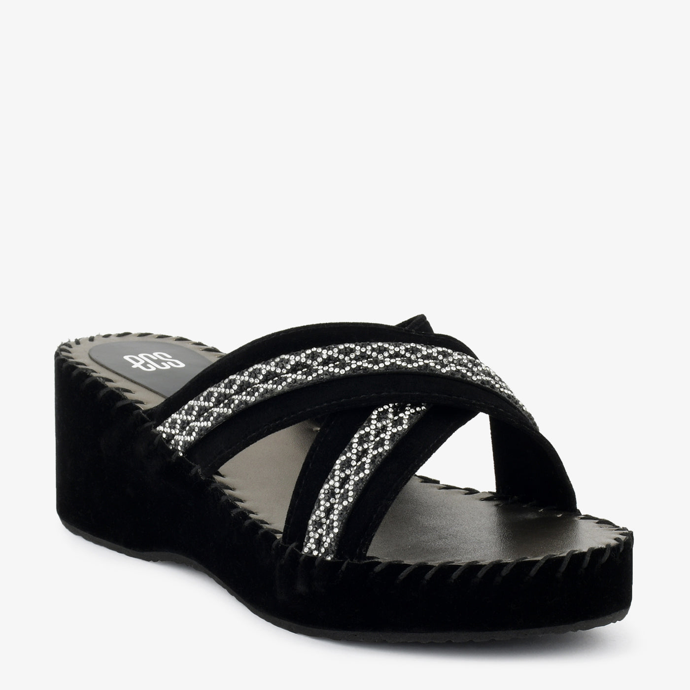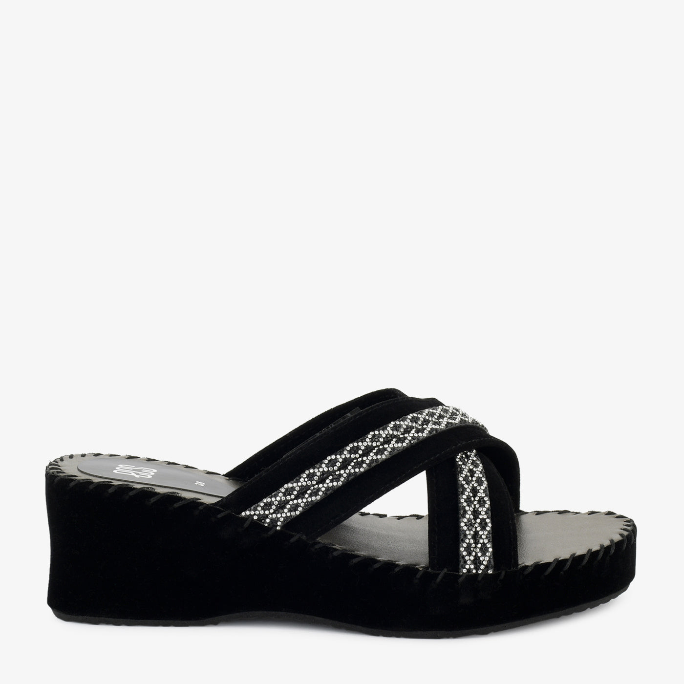Step out in style with these black wedge slippers. Featuring crisscrossing straps adorned with sparkling embellishments. The comfortable wedge heel provides a bit of lift. Ideal for adding a touch of glamour to your everyday wear.