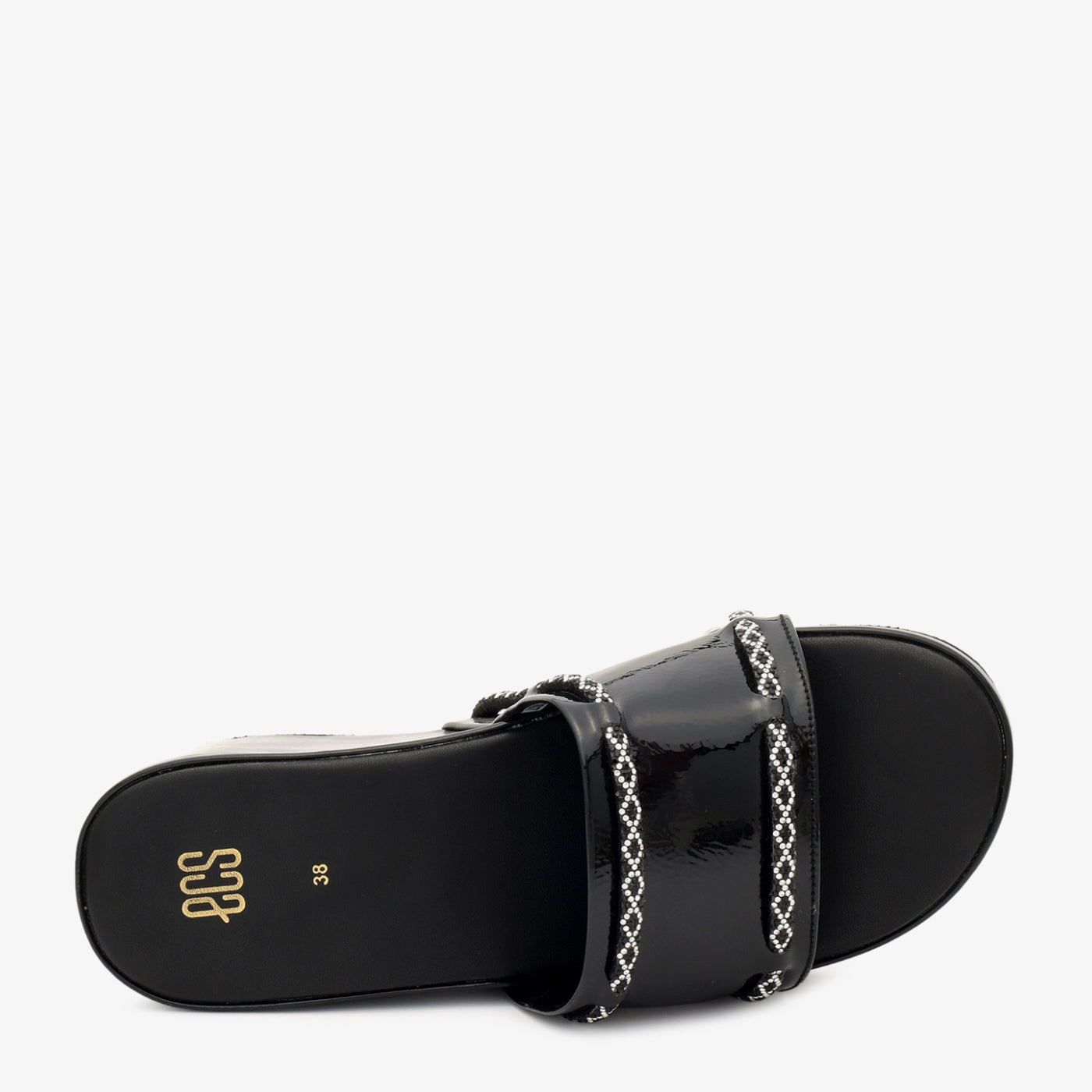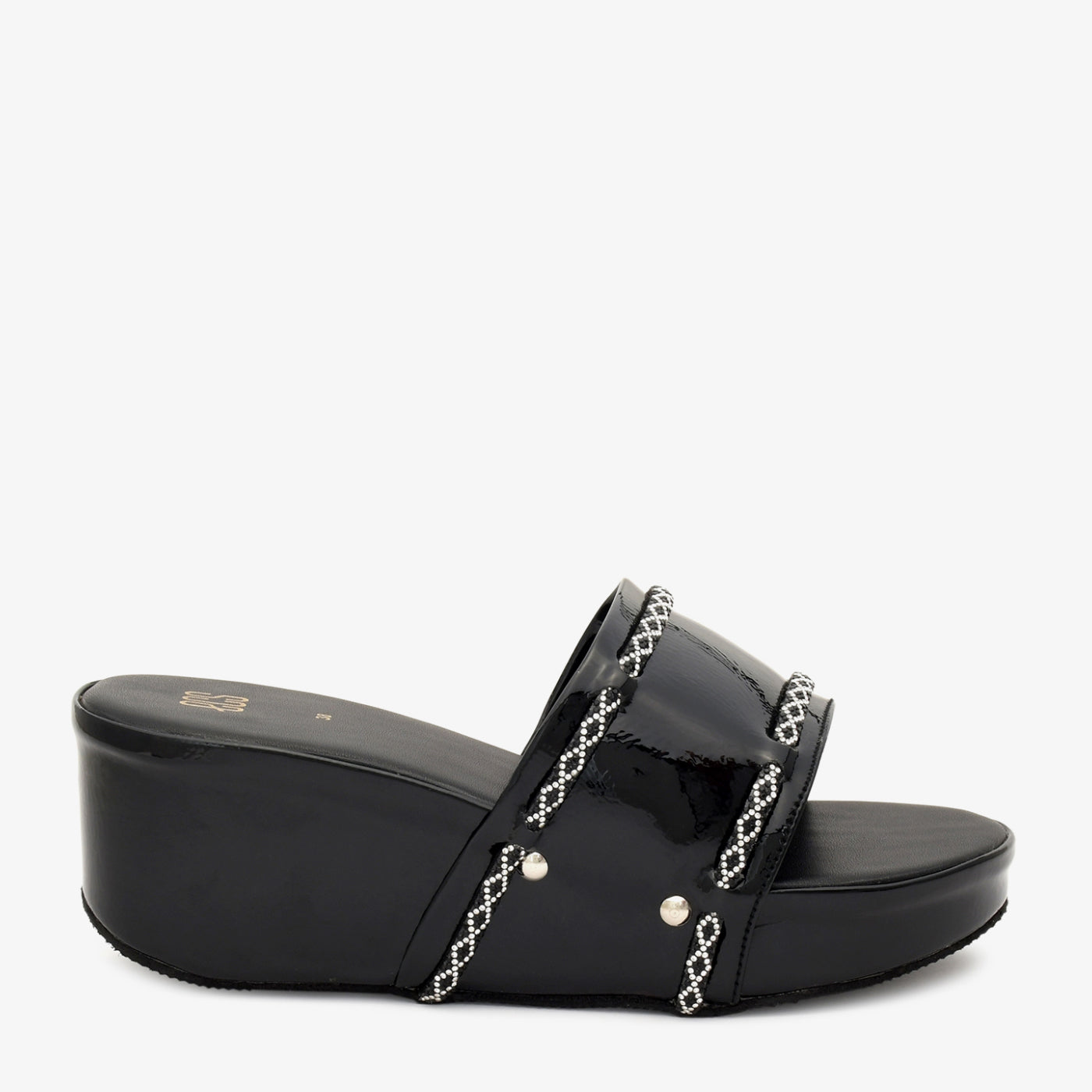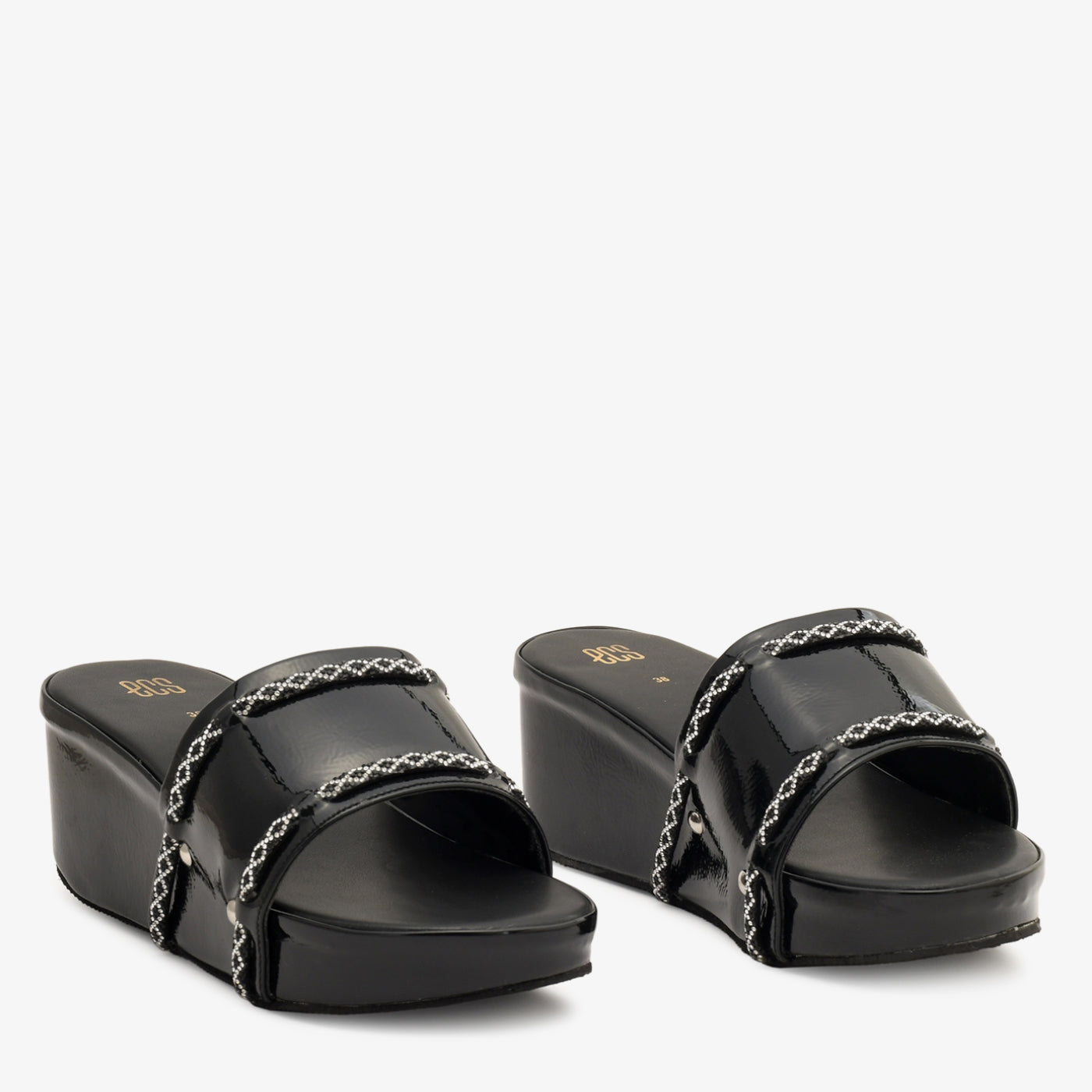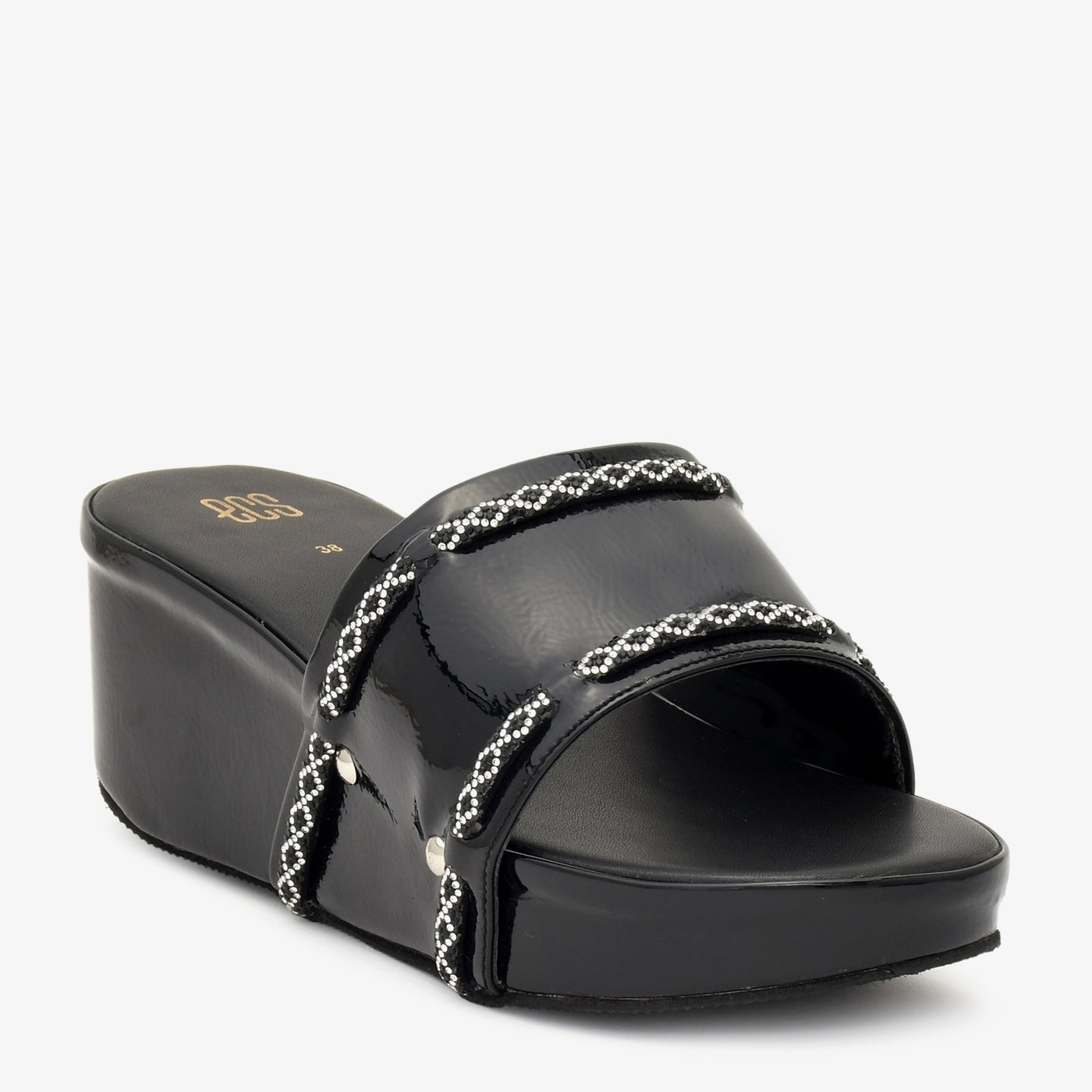 Step into bold style with these black platform wedge slippers. The square toe and chunky platform add a modern, edgy touch. The sleek black finish is versatile, while the embellished straps add a touch of glamour, perfect for making a stylish statement.