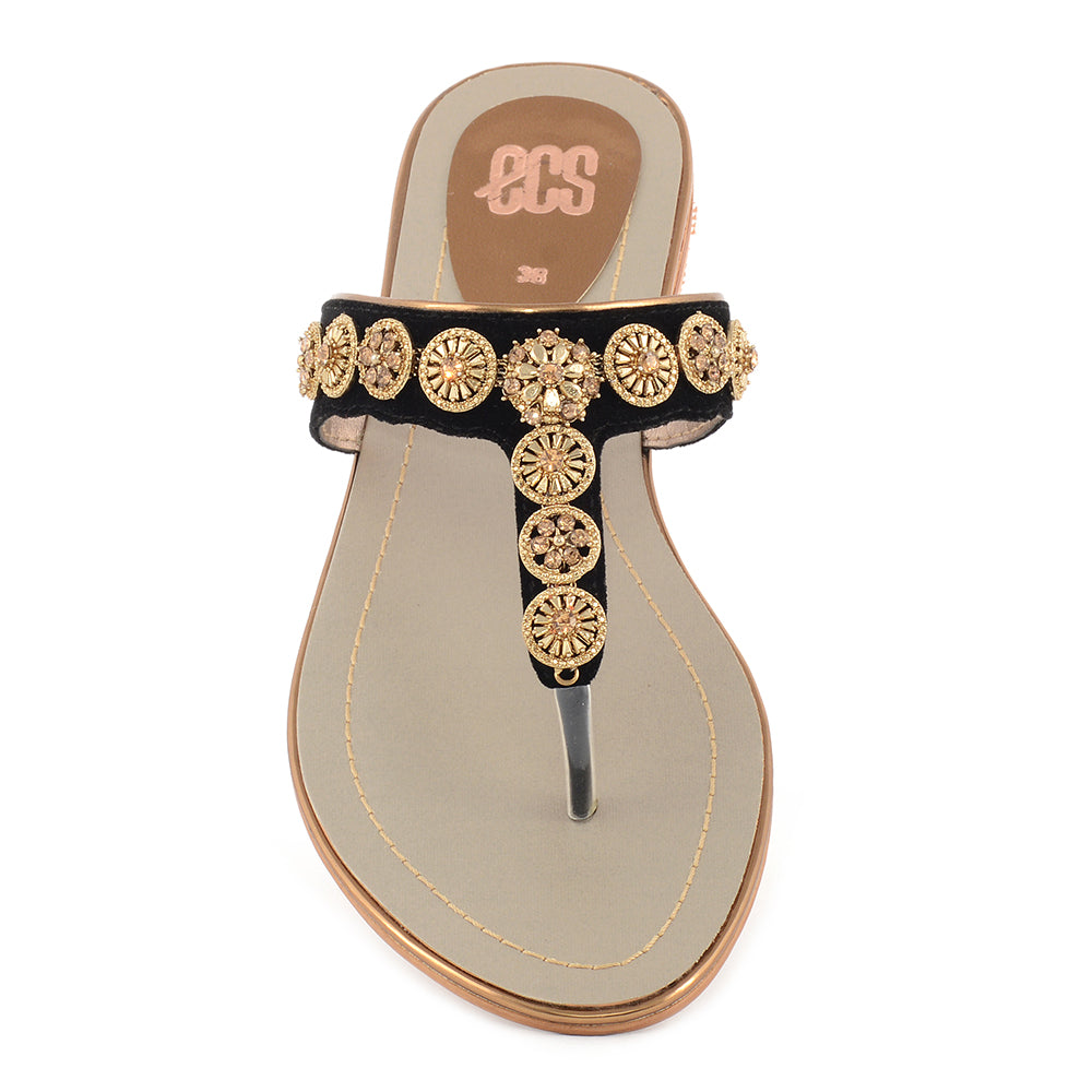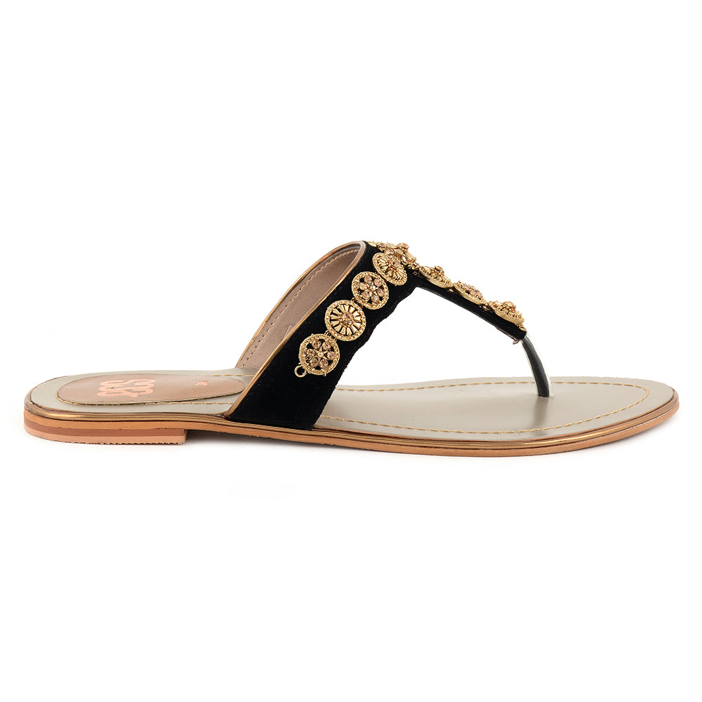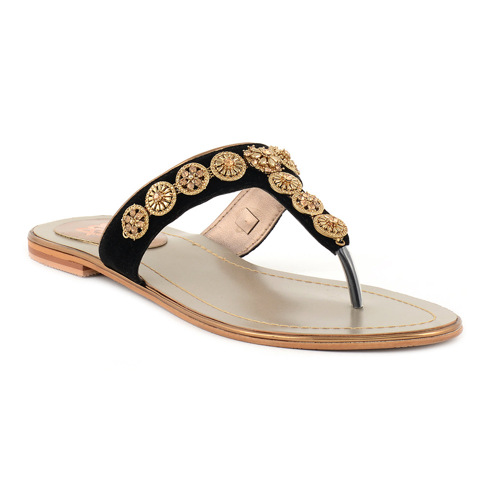 Our chappal adorns you with the delightful appeal of buckle chain, beaming with a brightness that enkindles something beautiful. It is produced from suede fabric and rubber sole for excellent resilience and flexibility. Its modern round toe urges to add it to the cart. Wear this chappal with your formal dresses.