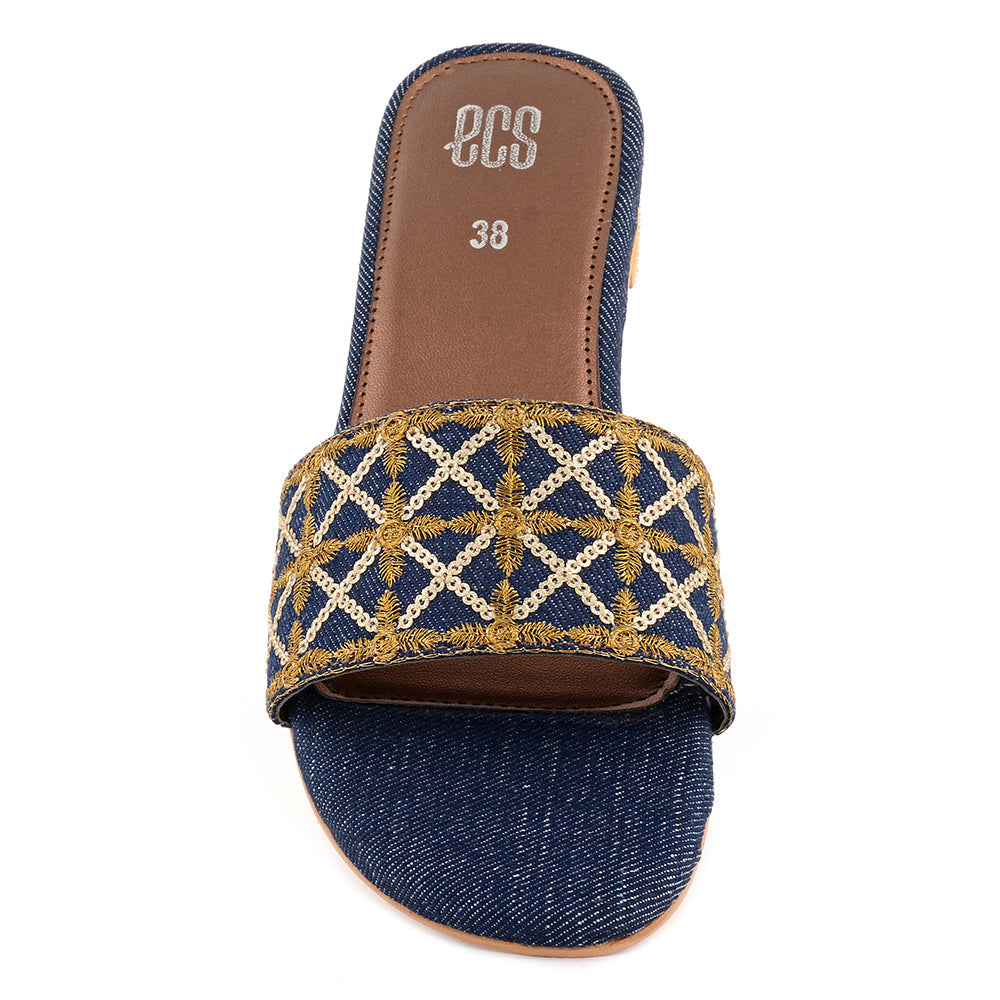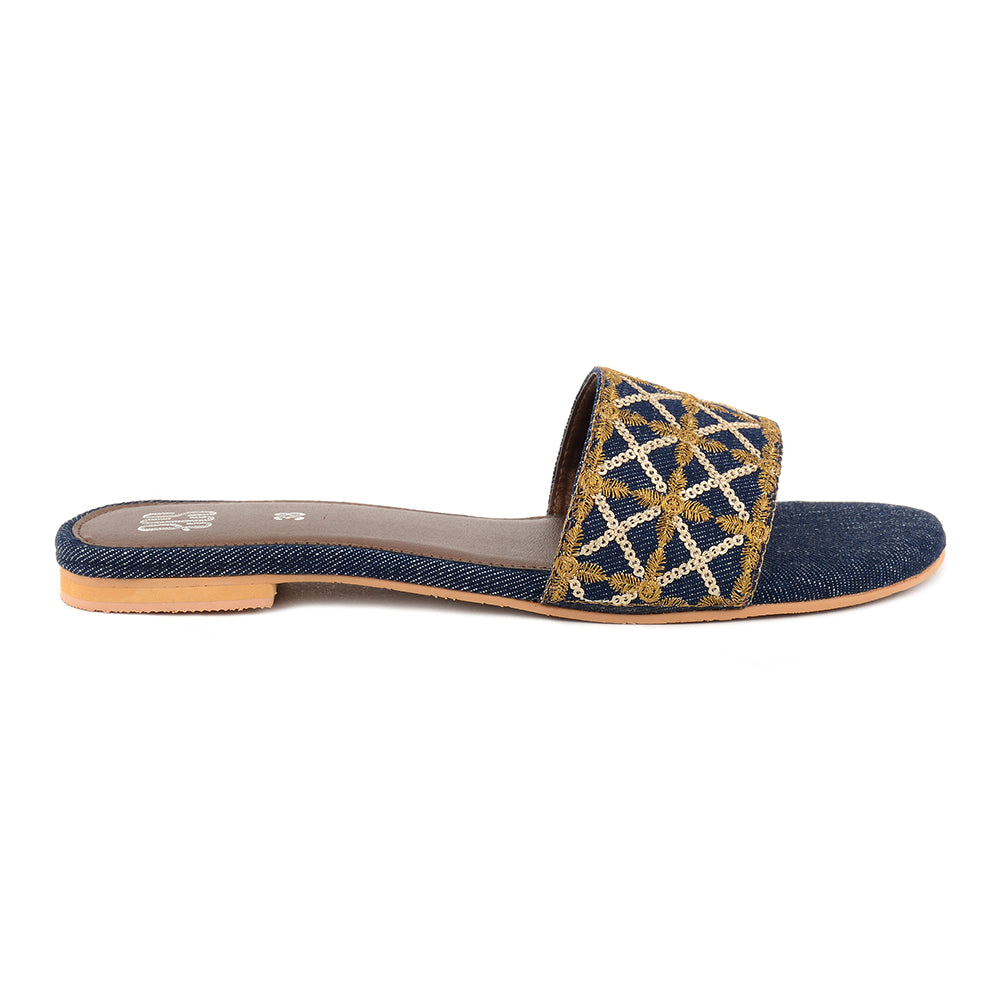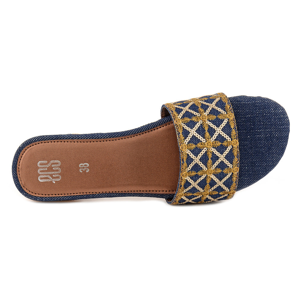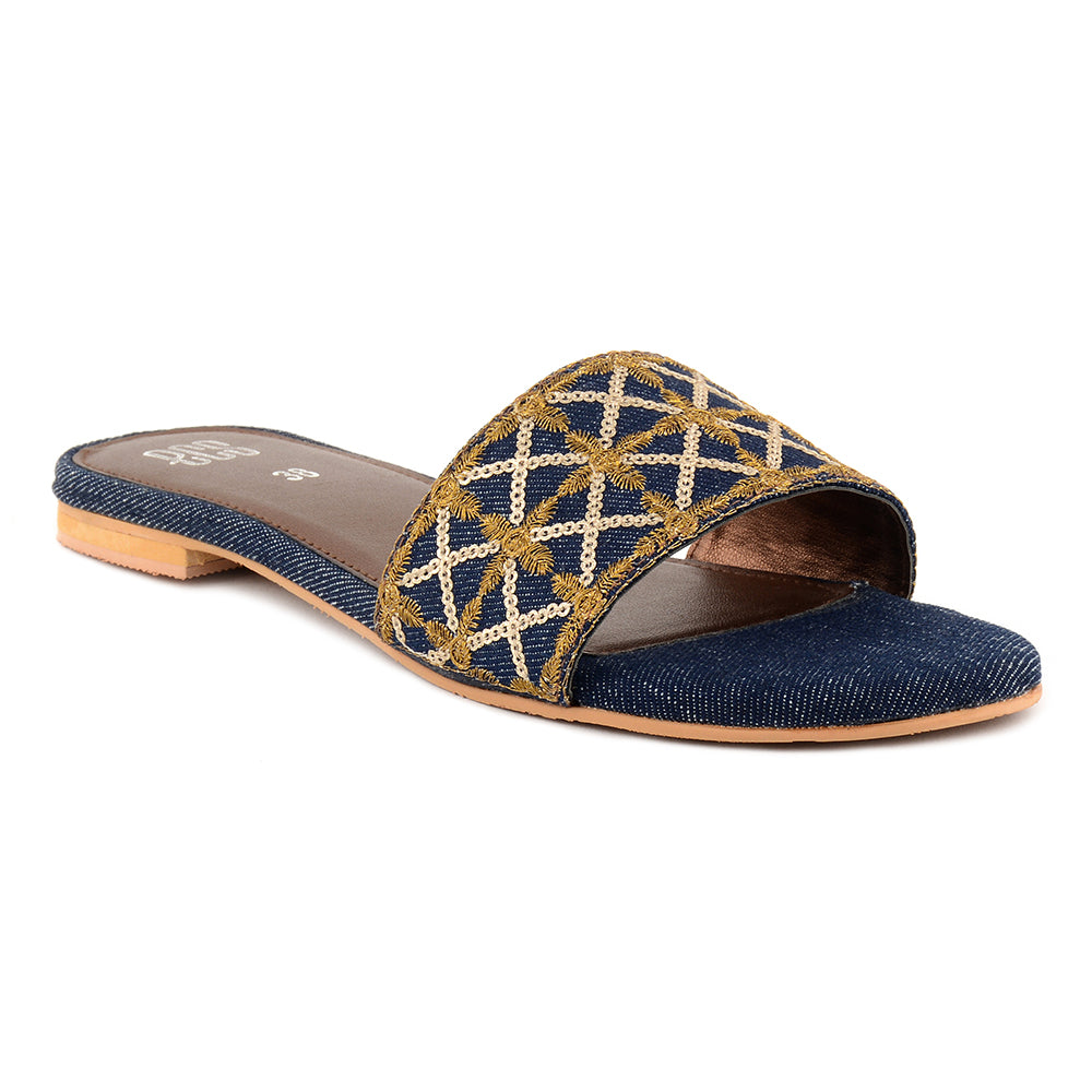 Exquisite embroidery details of our formal slipper want to accompany you into a day to be marked on the freshly turned page of your journal. It is fabricated from denim fabric to enhance resilience. Its round toe is crafted from a soft rubber sole. You can style this slipper with your everyday go-to clothes.