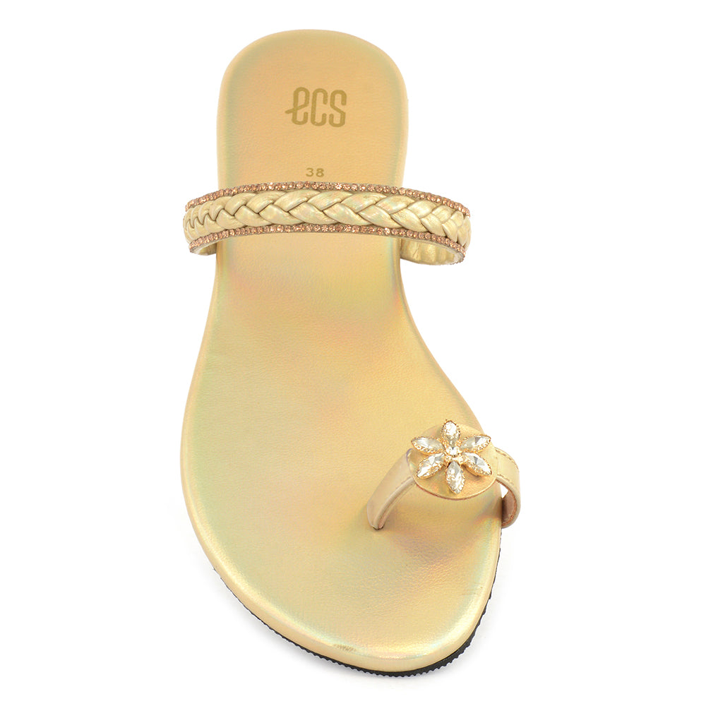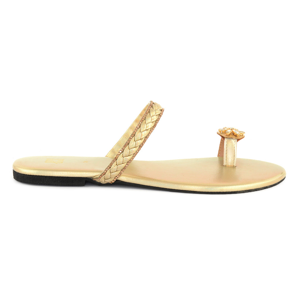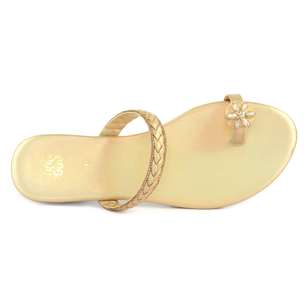 An elegant flat featuring a braided strap adorned with delicate embellishments. The floral accent on the toe loop adds a touch of luxury. Perfect for both festive and semi-formal occasions.