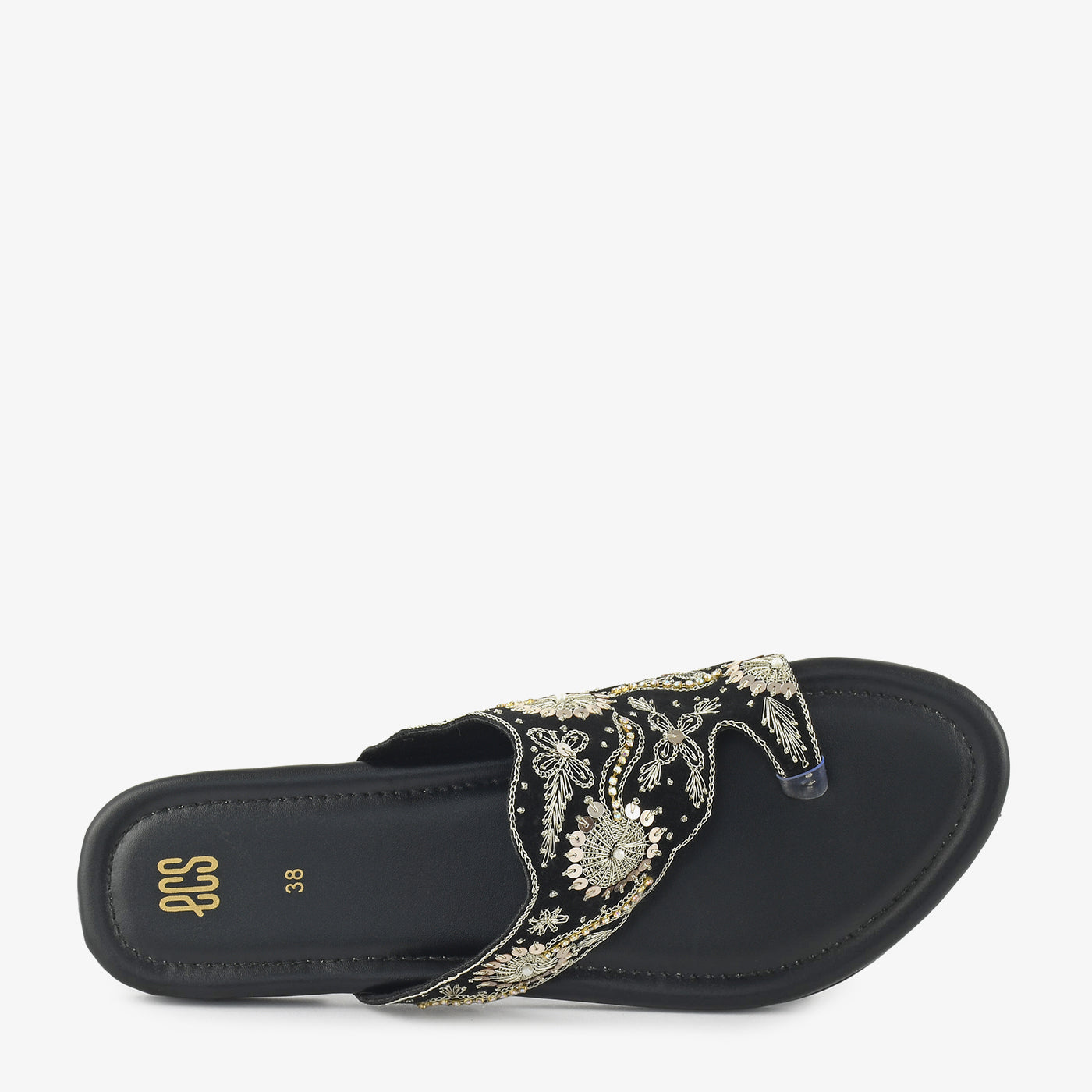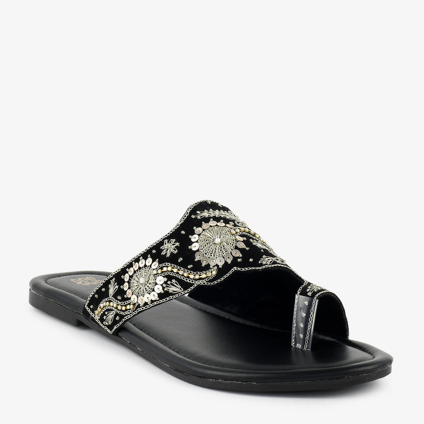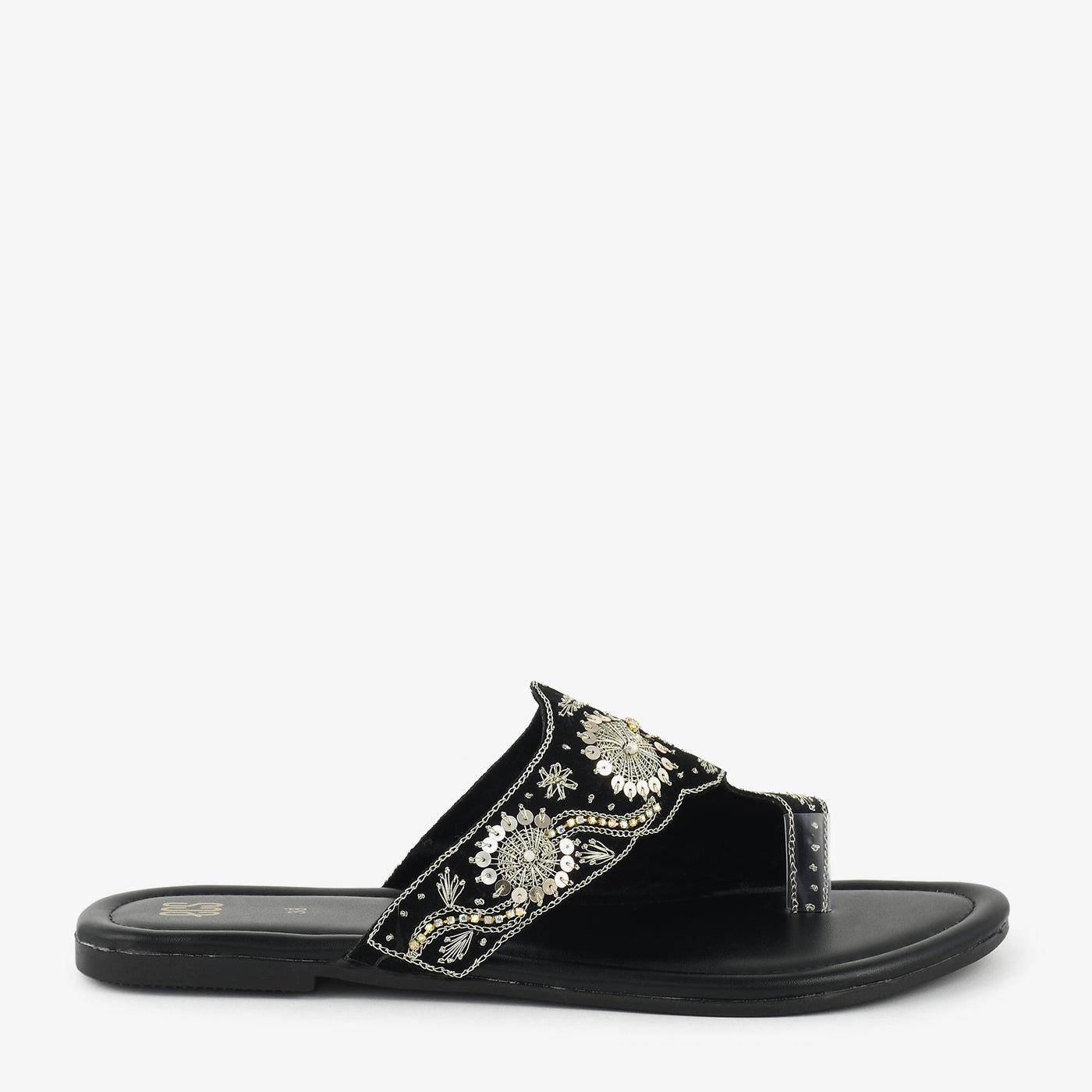- Material: Velvet upper with metallic embroidery and cushioned footbed