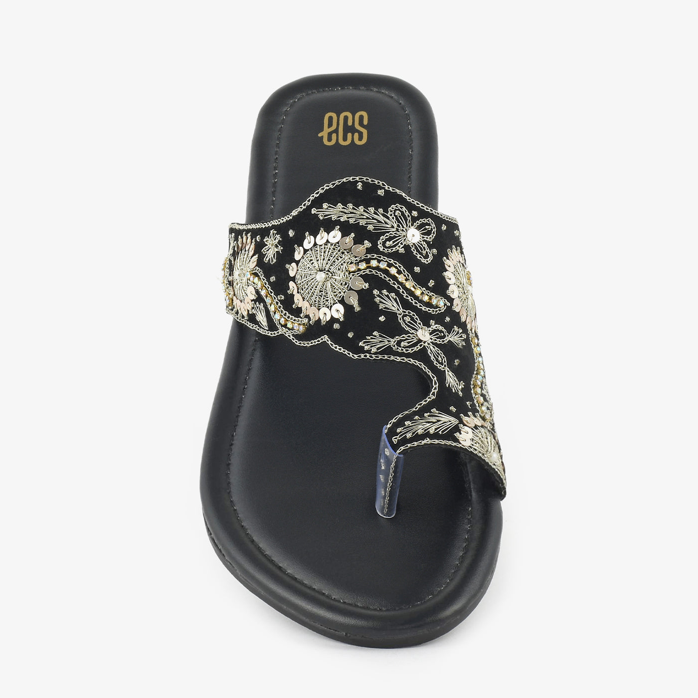 Flat chappal with a wide velvet strap featuring intricate embroidery in metallic threadwork and floral motifs. The crossover design provides a secure fit for all-day wear and casual activities. Crafted with a cushioned footbed that ensures comfort throughout extended periods. Contrast piping along the edges adds refined detailing to the silhouette. Perfect for occasions that call for traditional craftsmanship with contemporary wearability. A distinctive piece that pairs well with both casual and semi-formal ensembles.