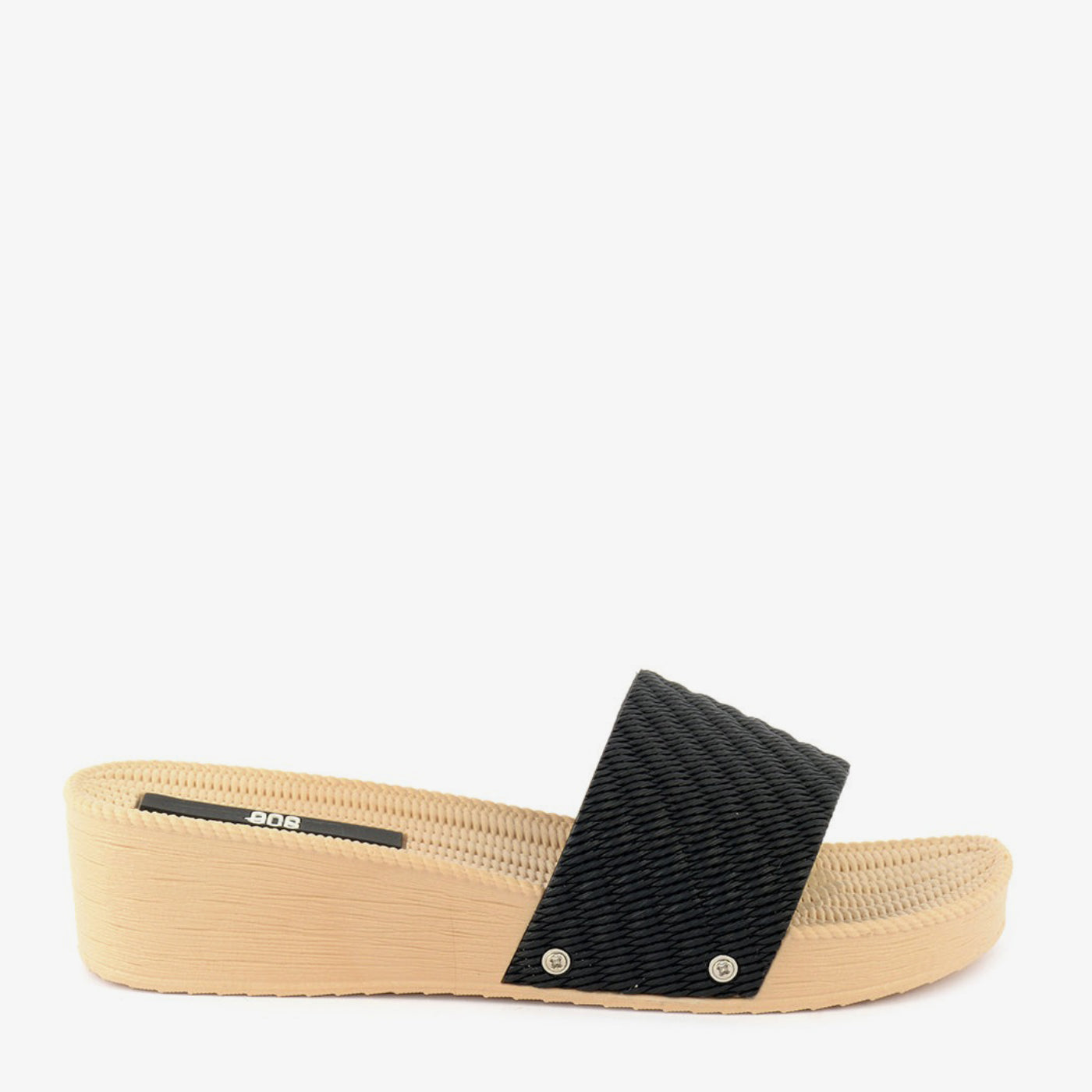 These stylish slides feature a rubber upper with a round toe and 2-inch wedge heel for added height. The PVC sole ensures durability and stability. The matte finish provides a chic look suitable for various occasions. Clean with a damp cloth and avoid direct heat exposure.