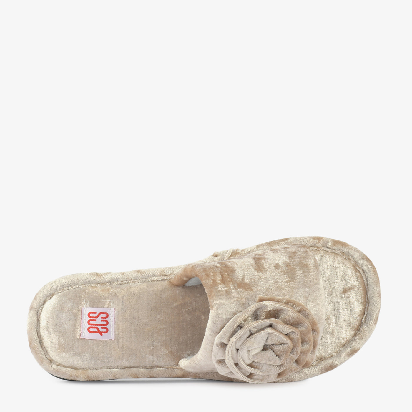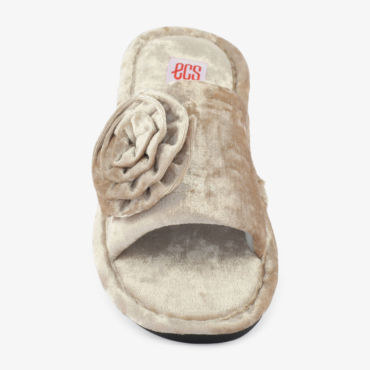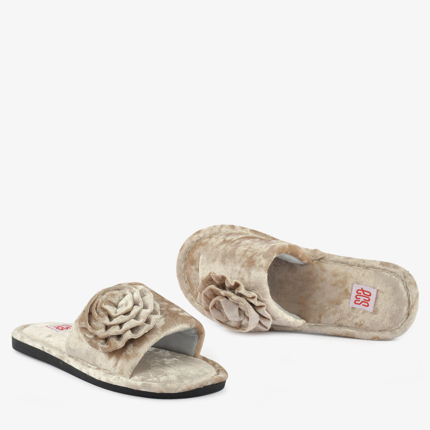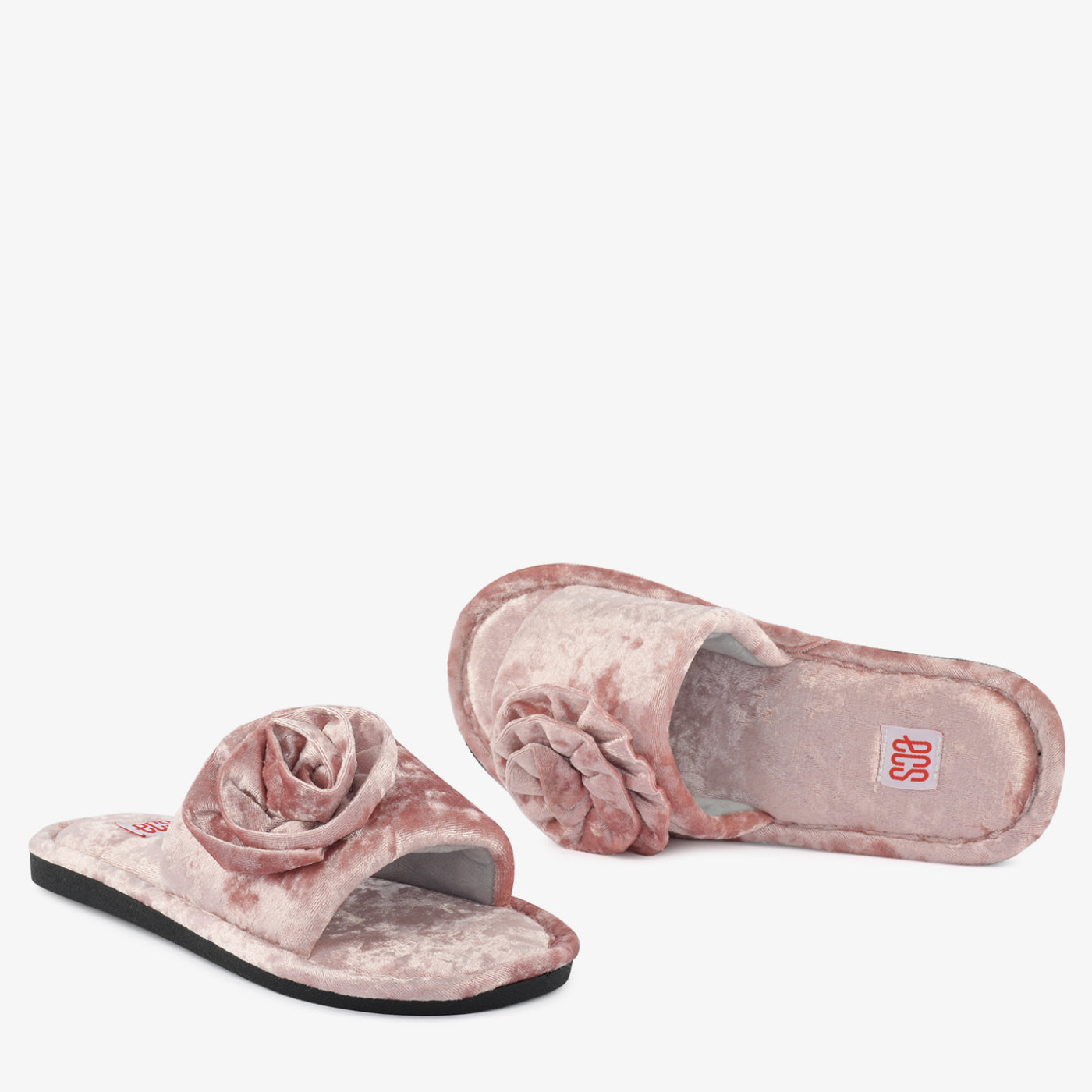 Experience soft comfort with this flat slipper, featuring a luxurious velvet upper adorned with a delicate, tonal rose detail. Perfect for adding a touch of subtle elegance to your relaxation at home.