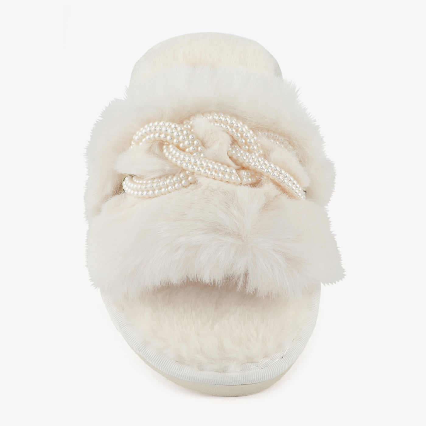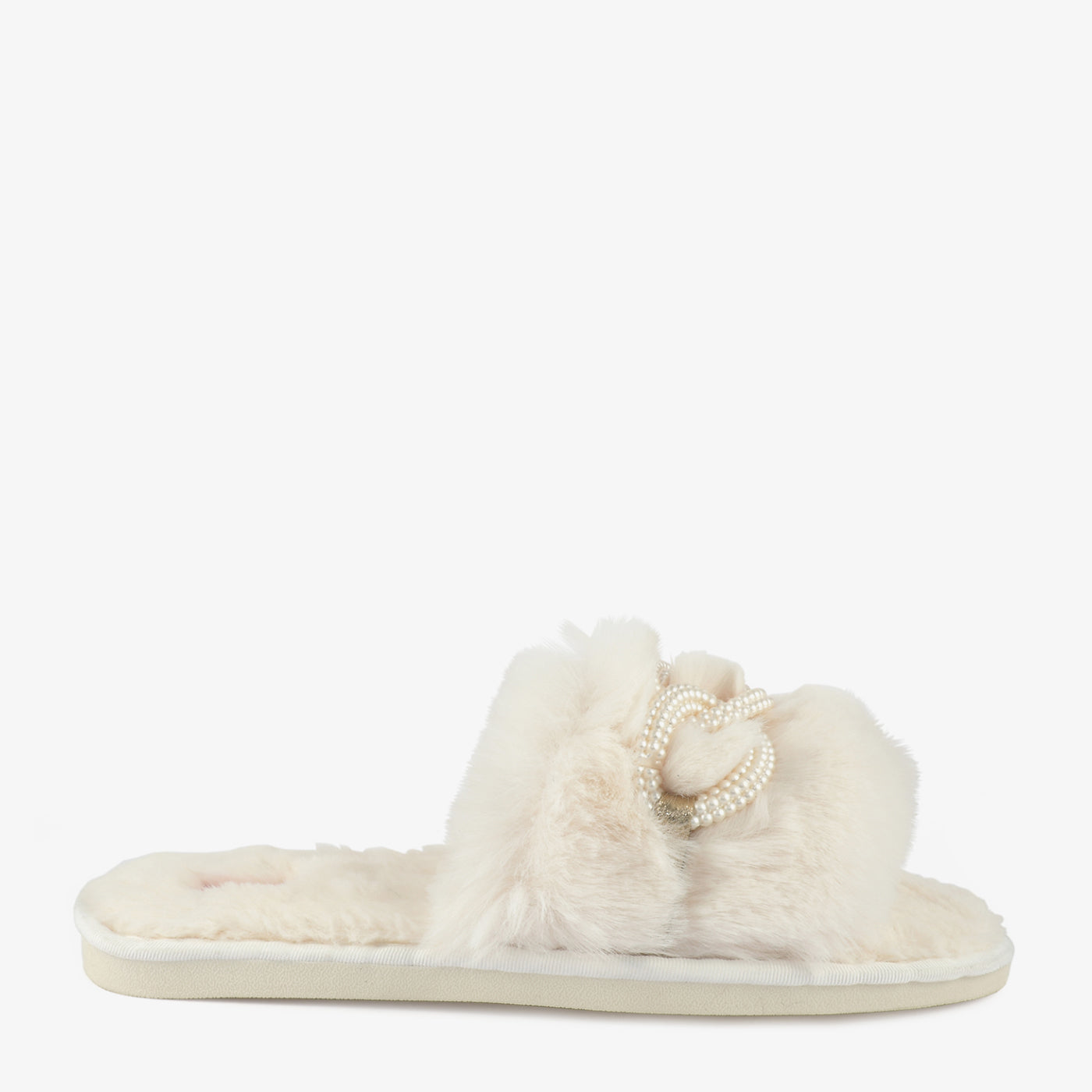 - Design: Open-toe, Wide faux fur strap, Faux pearl bow embellishment
