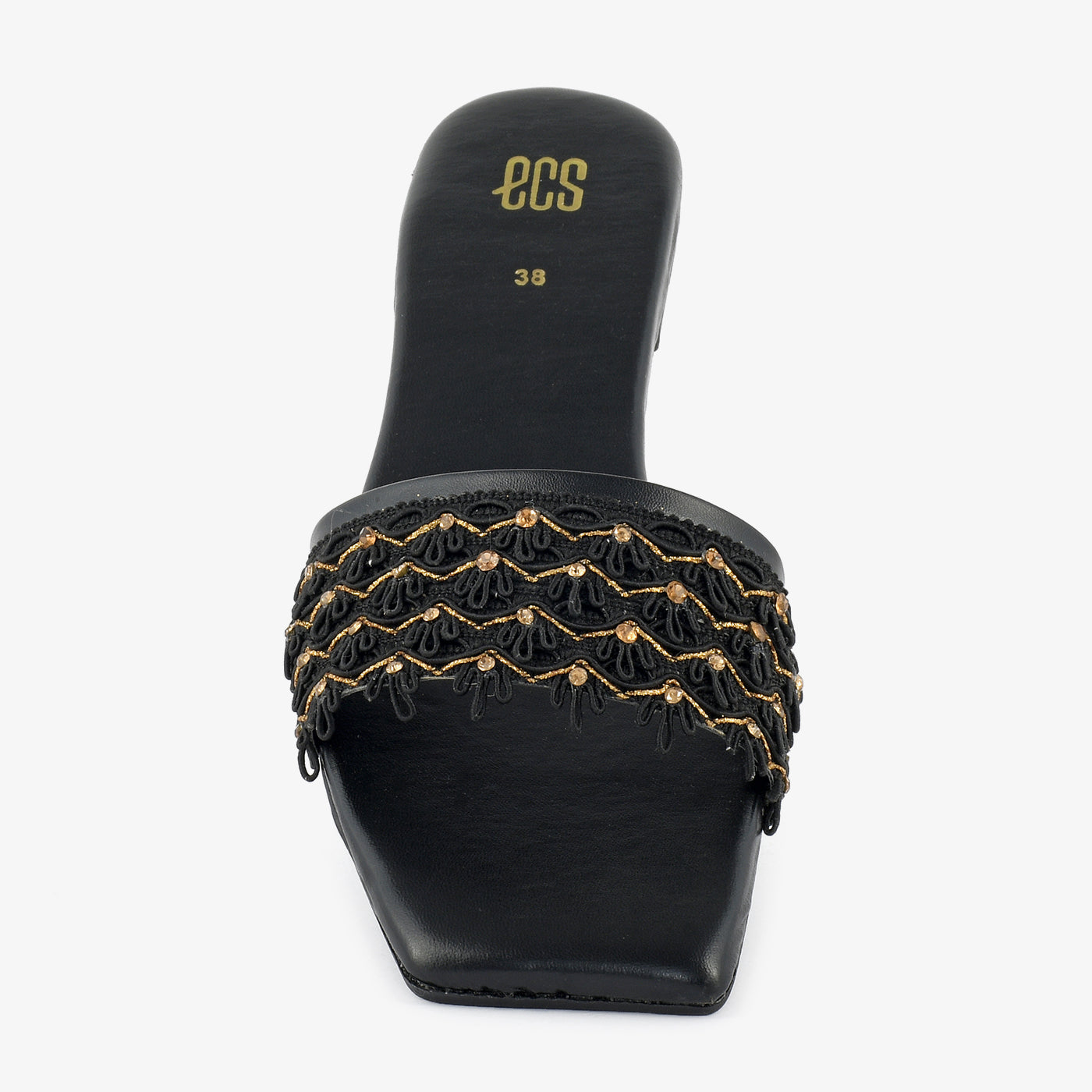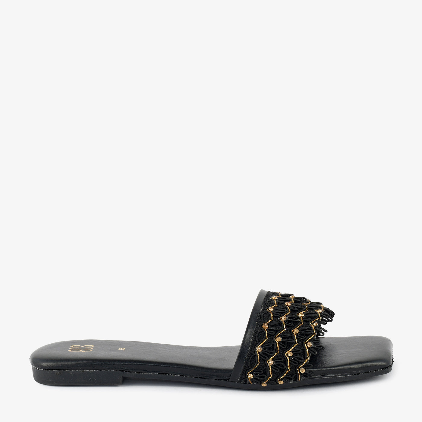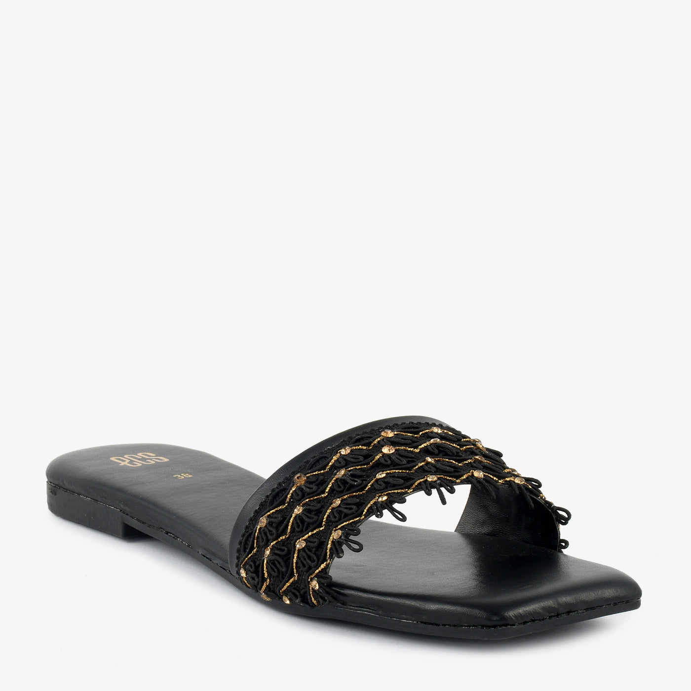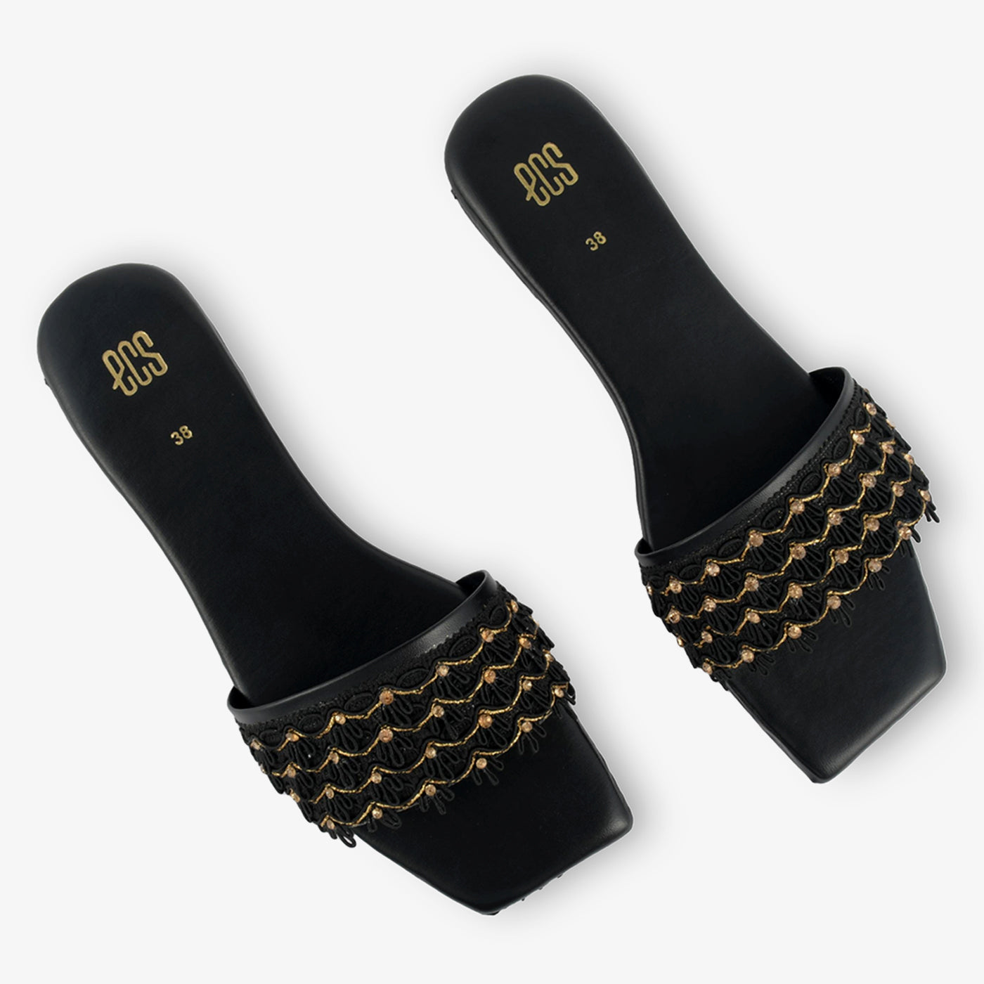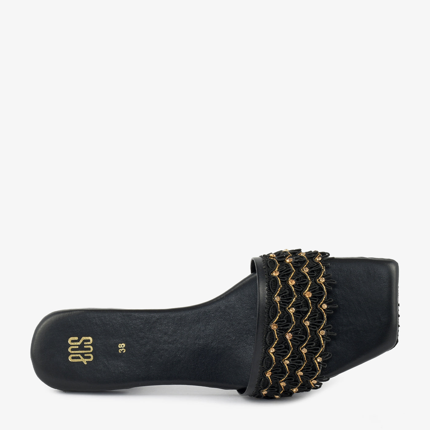 Step into elegant detail with the Embellished Waves. These sleek flats feature a wide strap adorned with wavy lines and small, shimmering embellishments. The flat sole offers a comfortable and stylish look for various occasions.