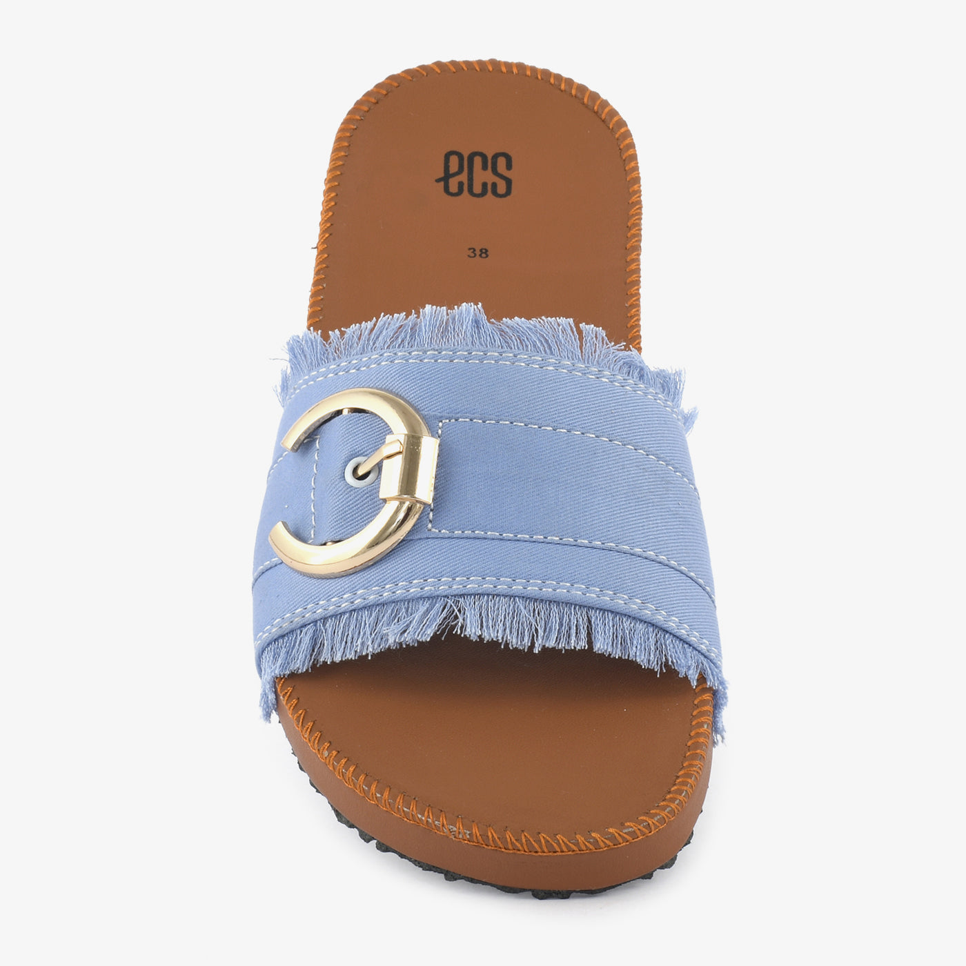 Step into casual chic with these flat slide slippers, featuring a light blue denim strap with a frayed edge and a stylish gold-toned buckle detail. Their relaxed design is perfect for your everyday outings in Lahore.