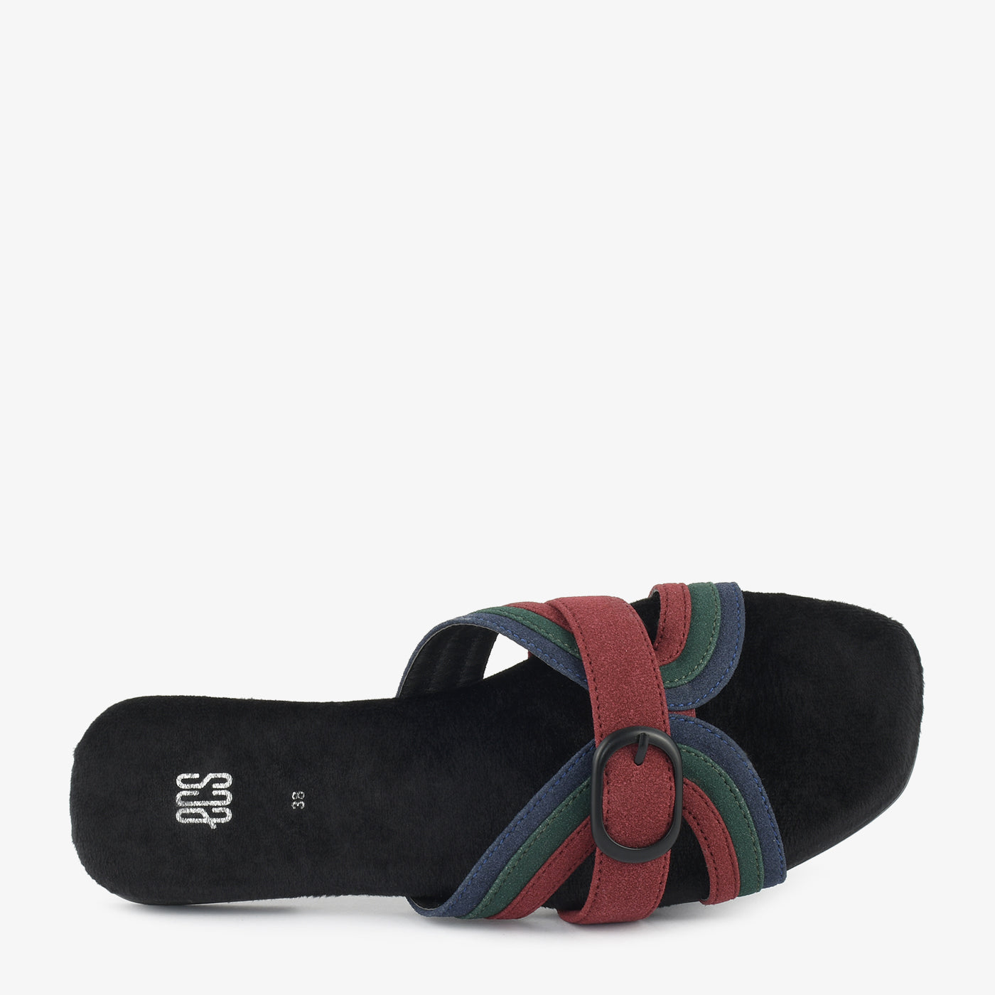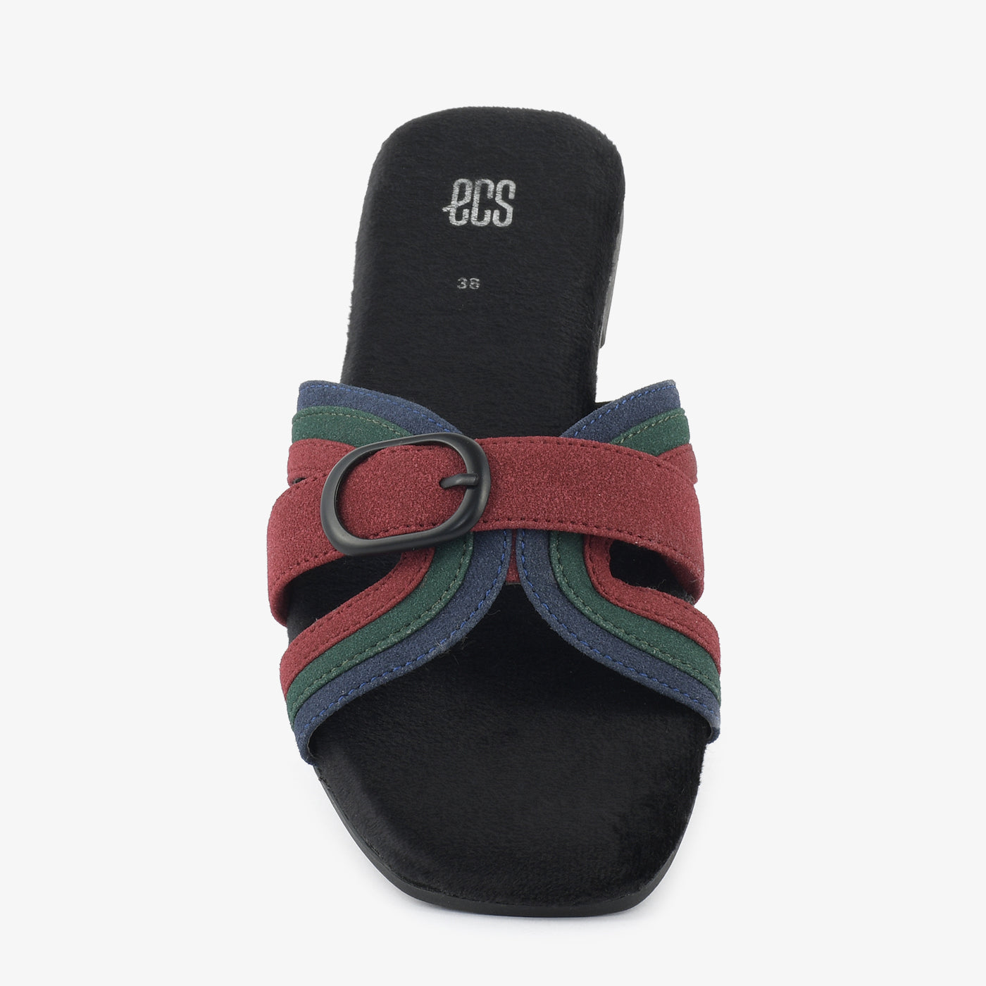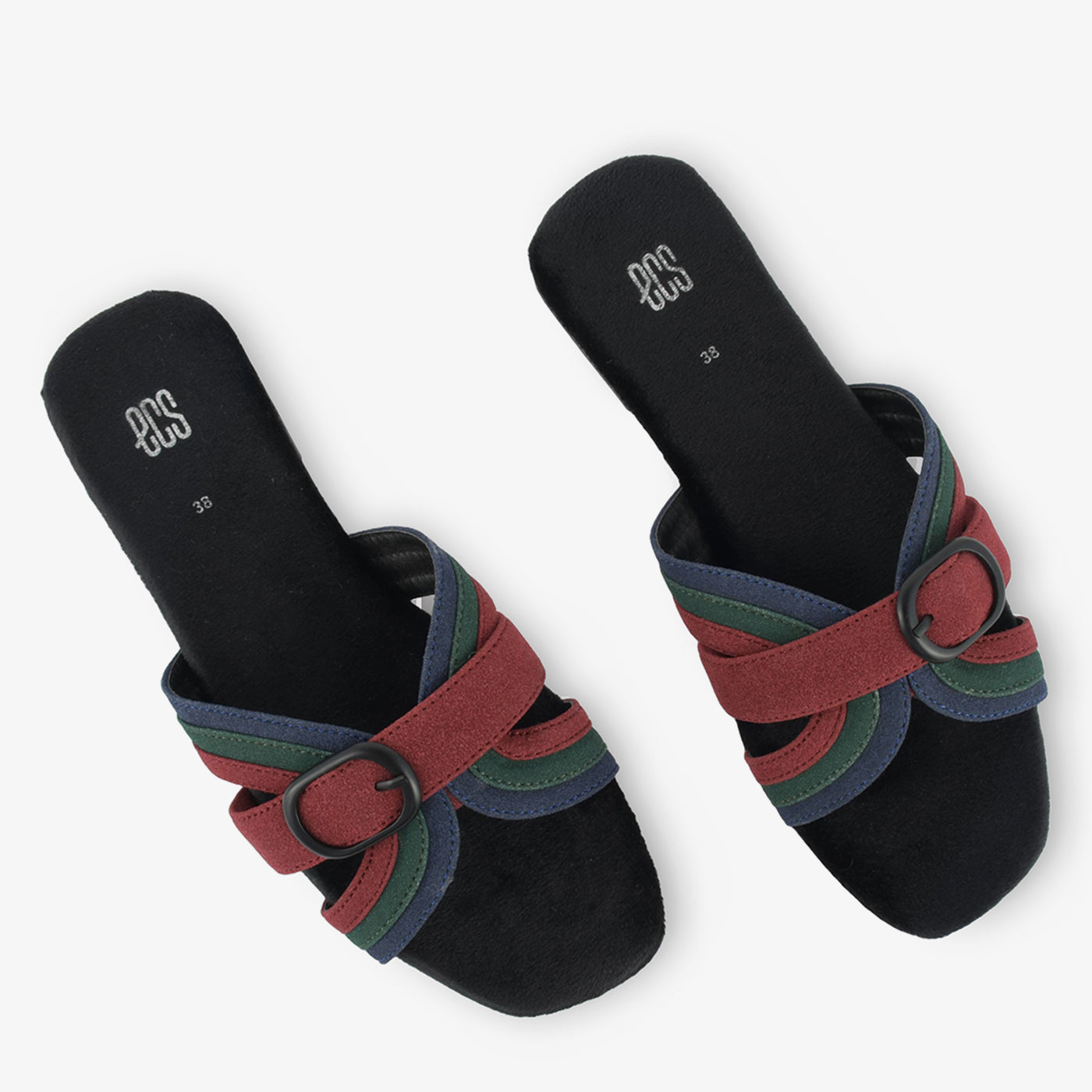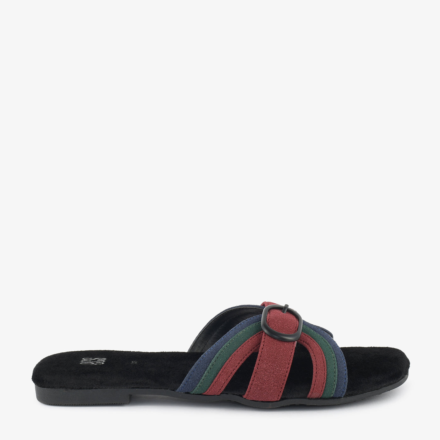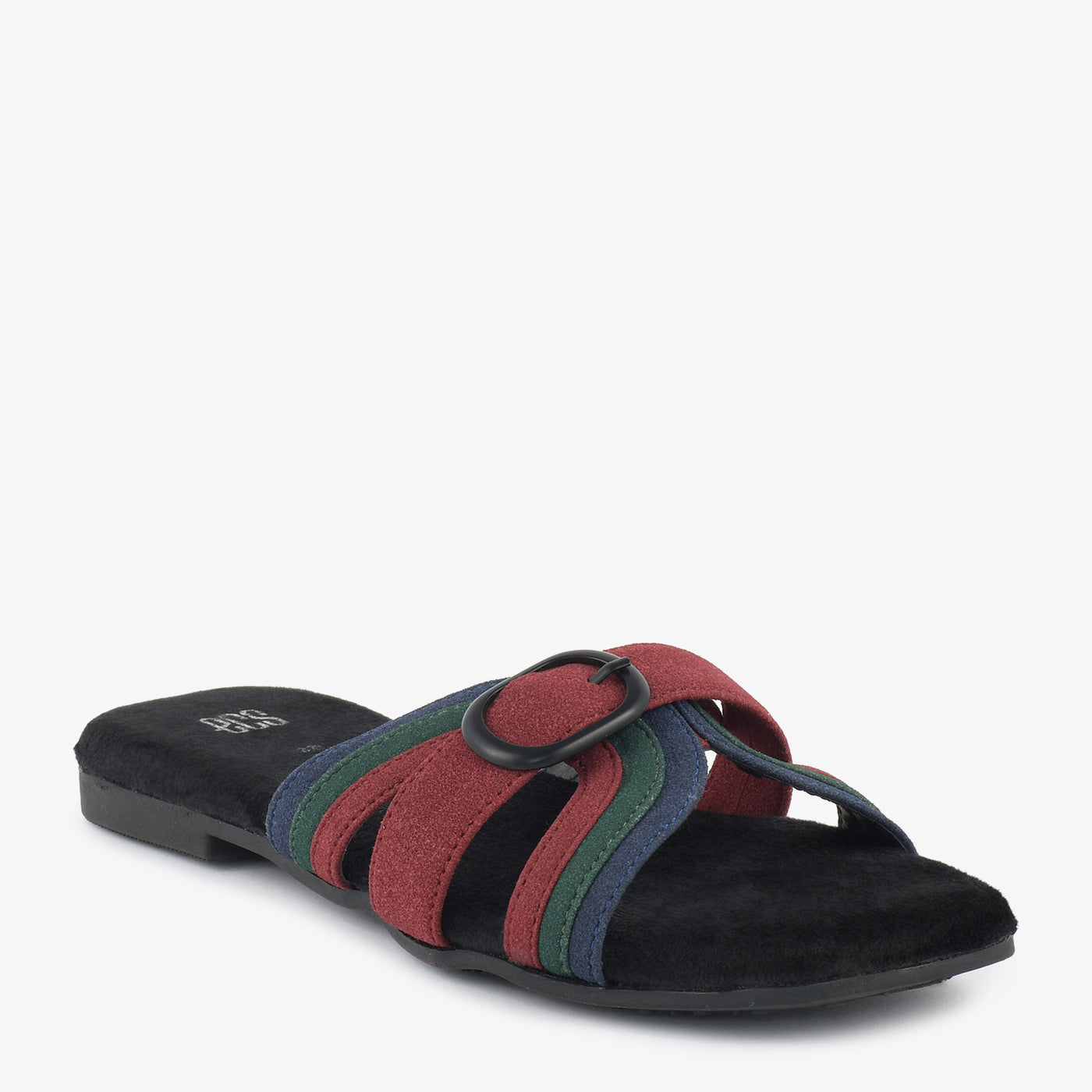Slide into stylish texture with the Buckle Bands. These unique flats feature multiple straps in varying textures and tones, held together by a prominent circular buckle. The flat sole offers a comfortable and fashionable look.