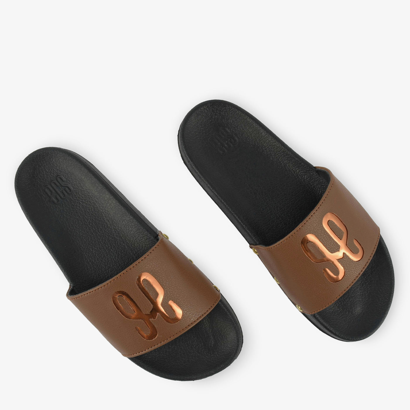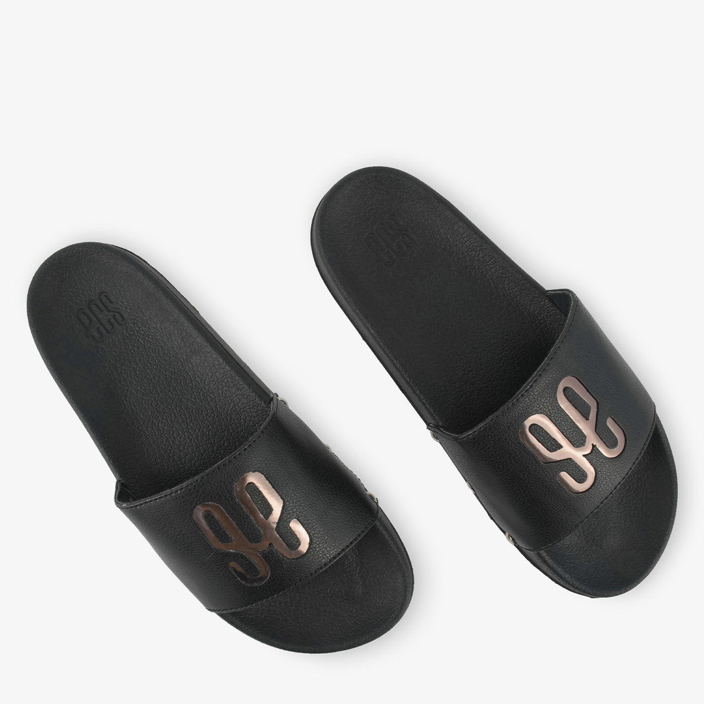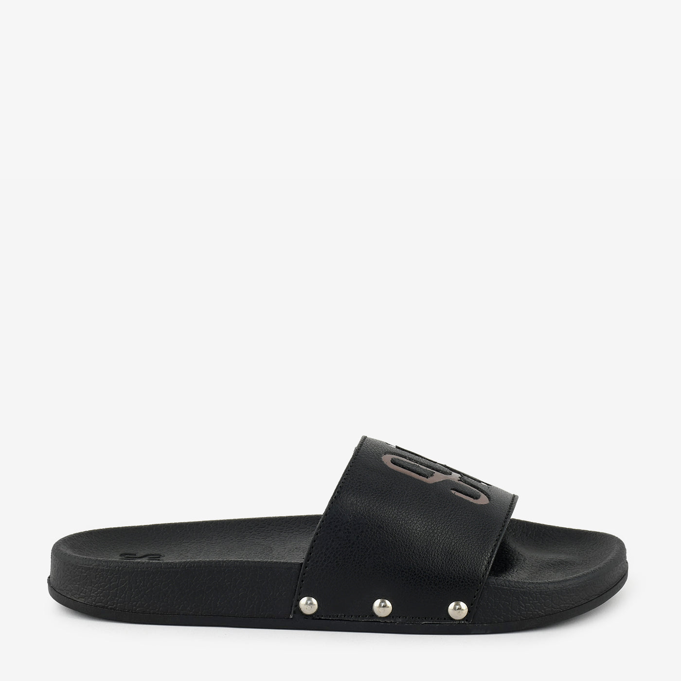Flat slippers with a wide upper featuring embossed detailing and metallic stud accents along the edges. The slip-on design offers effortless wear for daily activities and casual settings. Crafted with a cushioned footbed that provides comfort throughout extended periods. The flat sole ensures ease of movement while maintaining a clean aesthetic. Perfect for relaxed environments that call for both comfort and a refined appearance. A versatile addition that complements casual separates and everyday ensembles with ease.