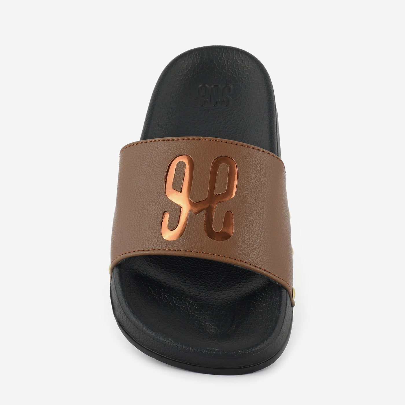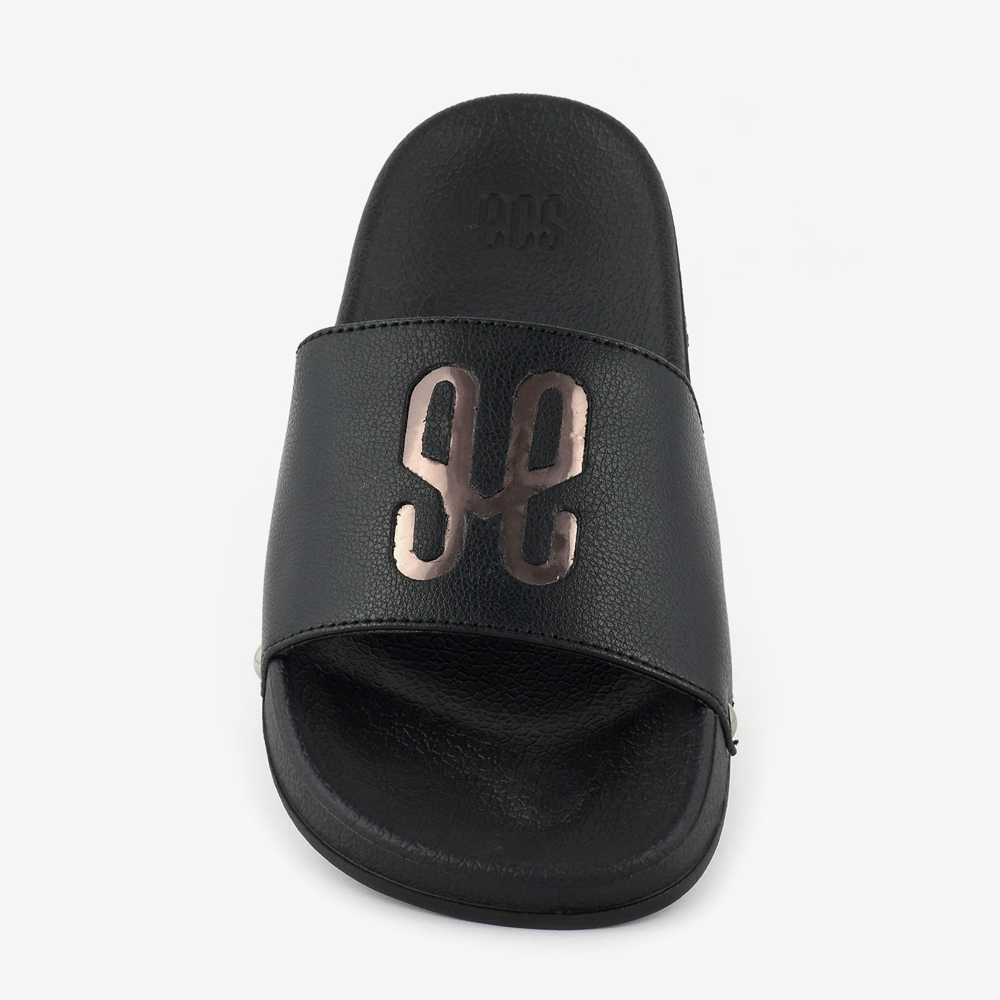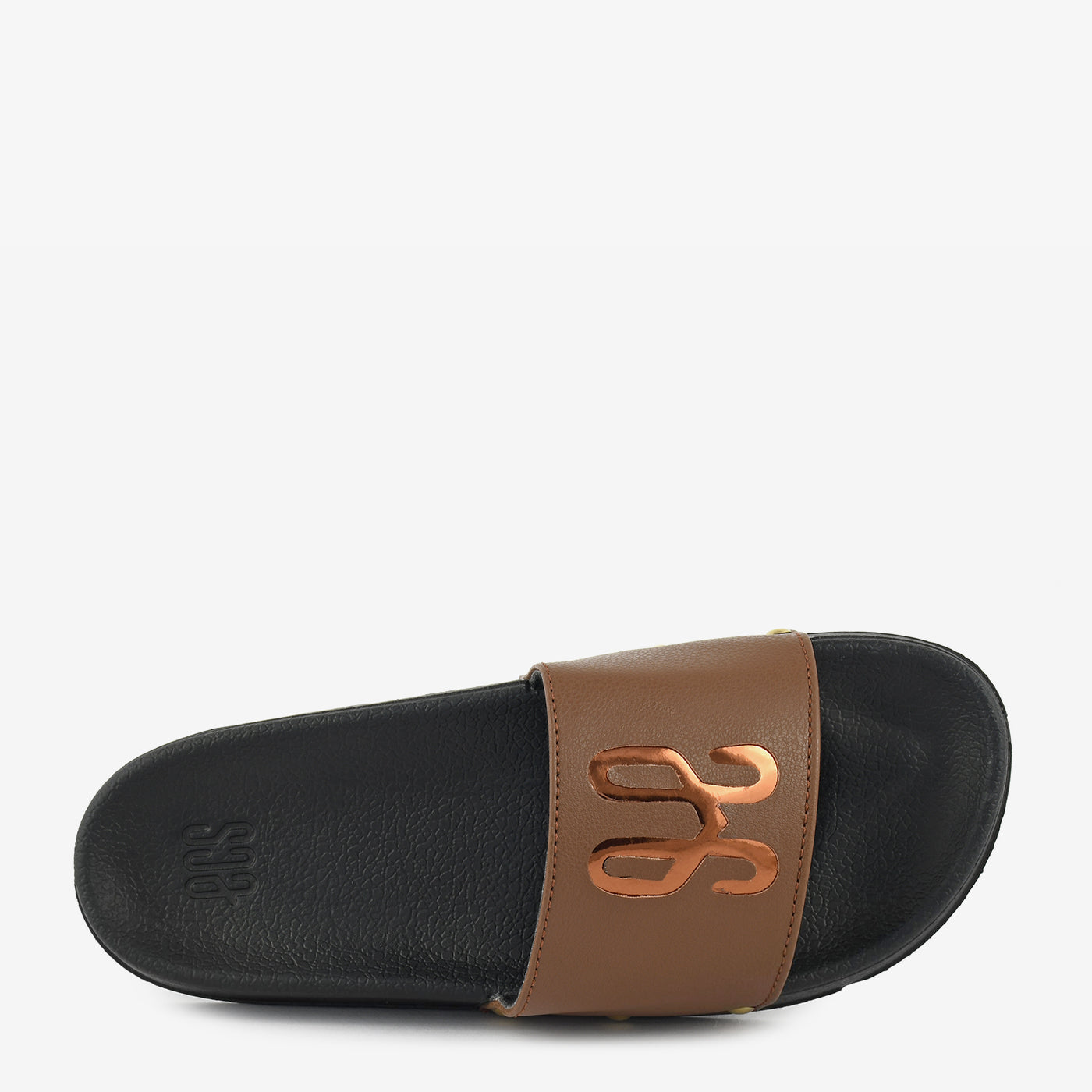 Flat slippers with a wide upper featuring embossed detailing and metallic stud accents along the edges. The slip-on design offers effortless wear for daily activities and casual settings. Crafted with a cushioned footbed that provides comfort throughout extended periods. The flat sole ensures ease of movement while maintaining a clean aesthetic. Perfect for relaxed environments that call for both comfort and a refined appearance. A versatile addition that complements casual separates and everyday ensembles with ease.