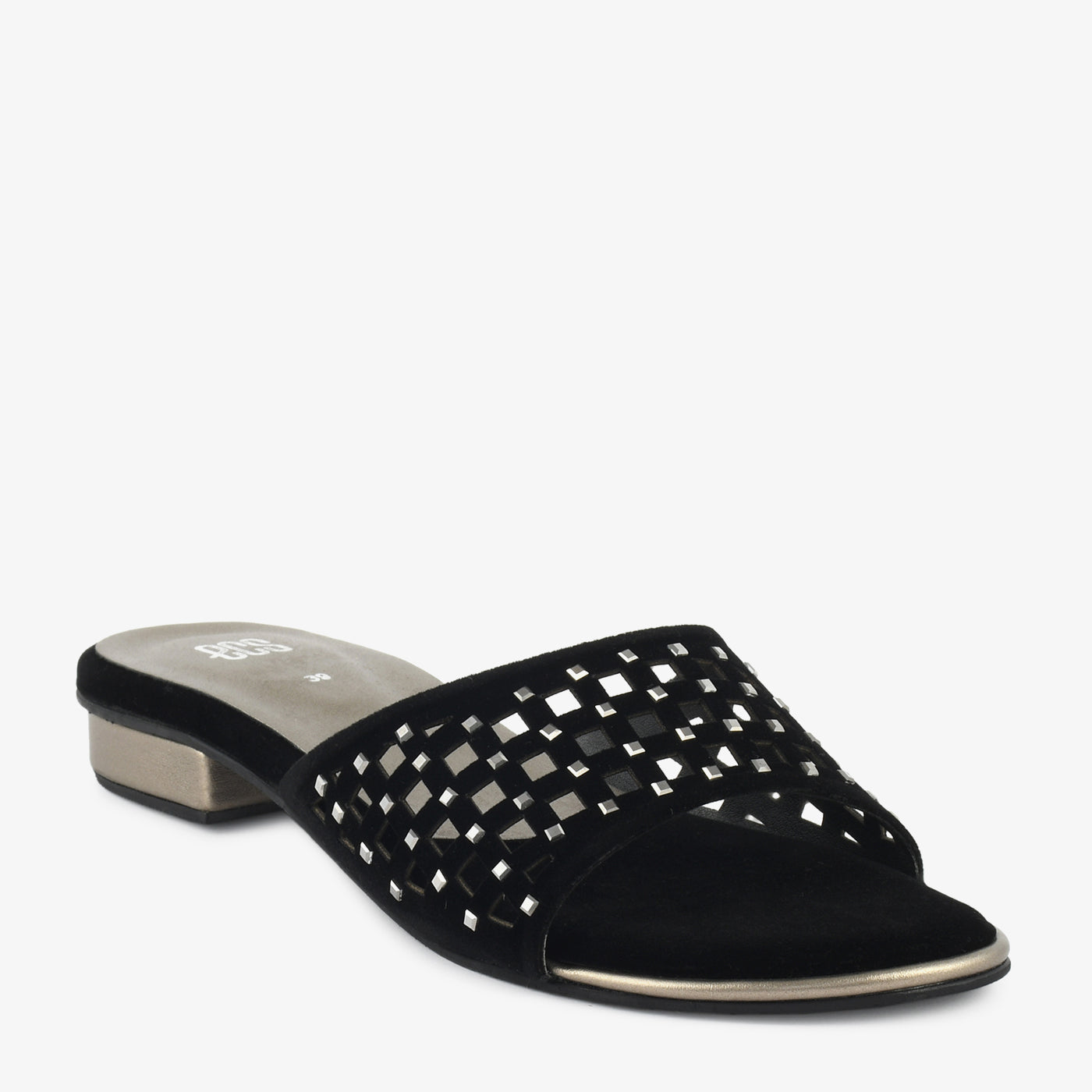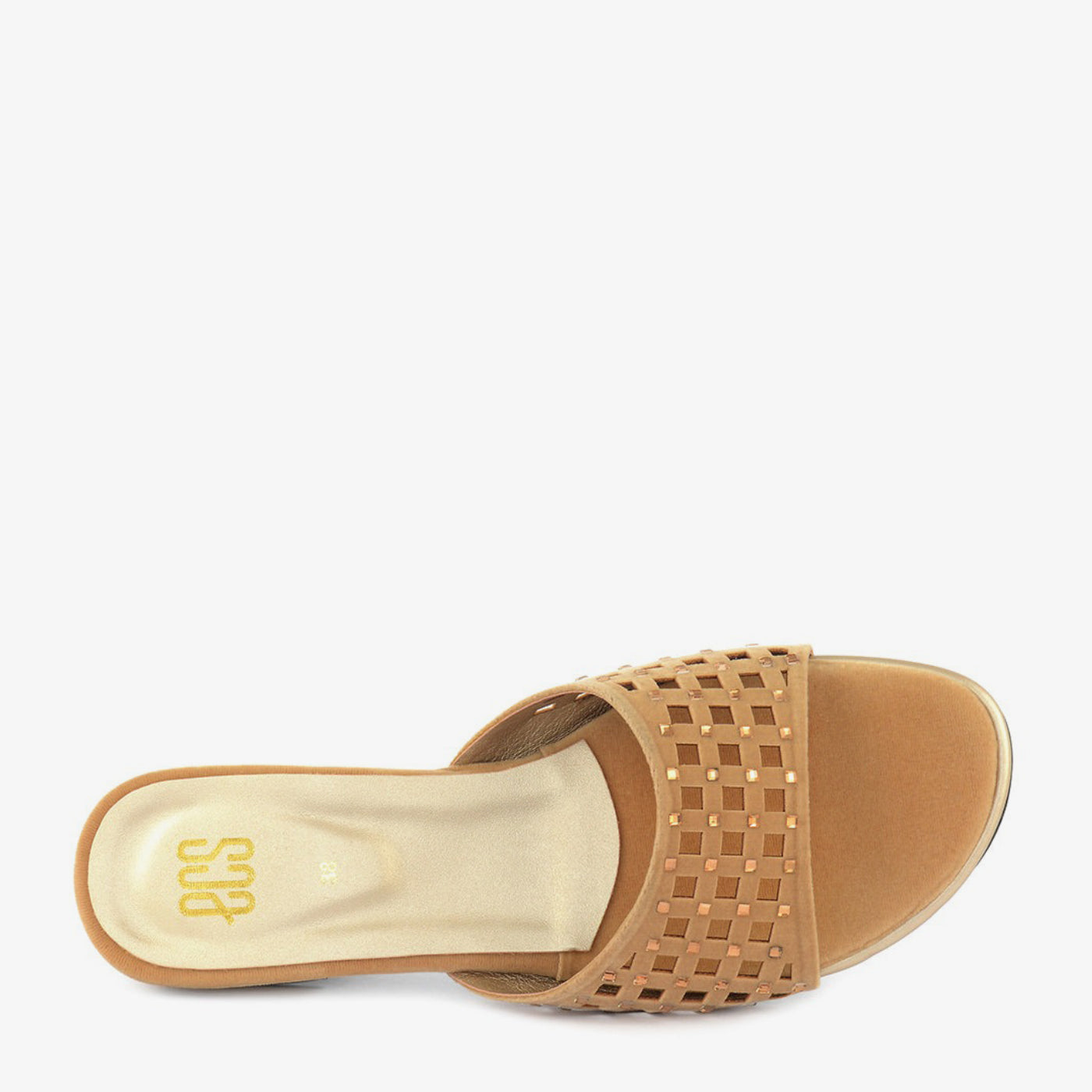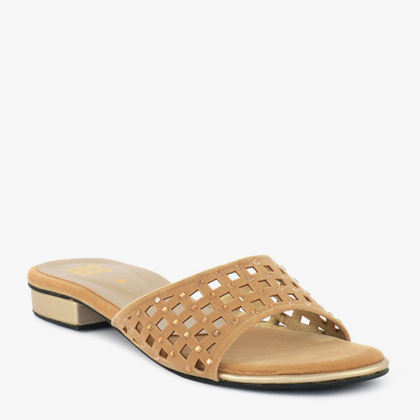 A sleek open-toe slipper featuring a modern cut-out strap designed for breathability and style. The smooth footbed provides a soft feel, while the low heel adds just the right amount of lift for everyday comfort. Perfect for casual hangouts, daily errands, or light festive wear. Offers refined simplicity with a contemporary twist.