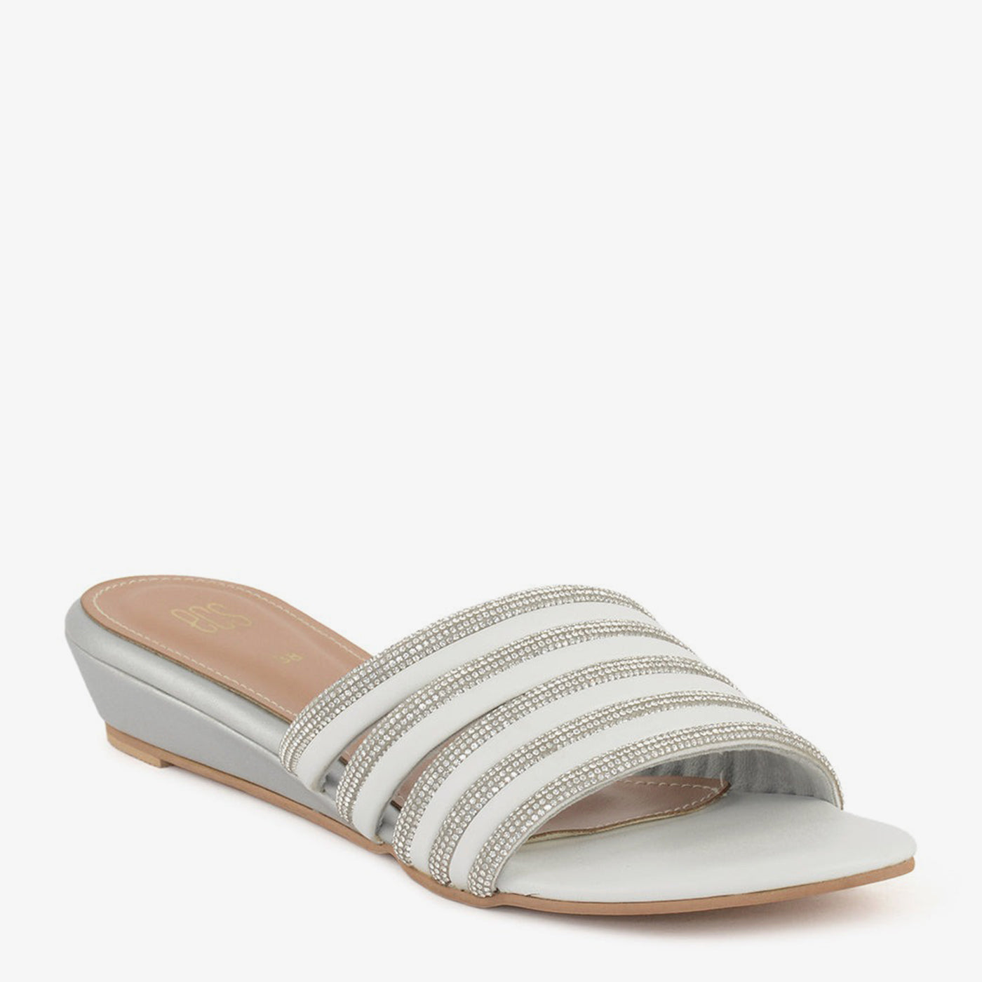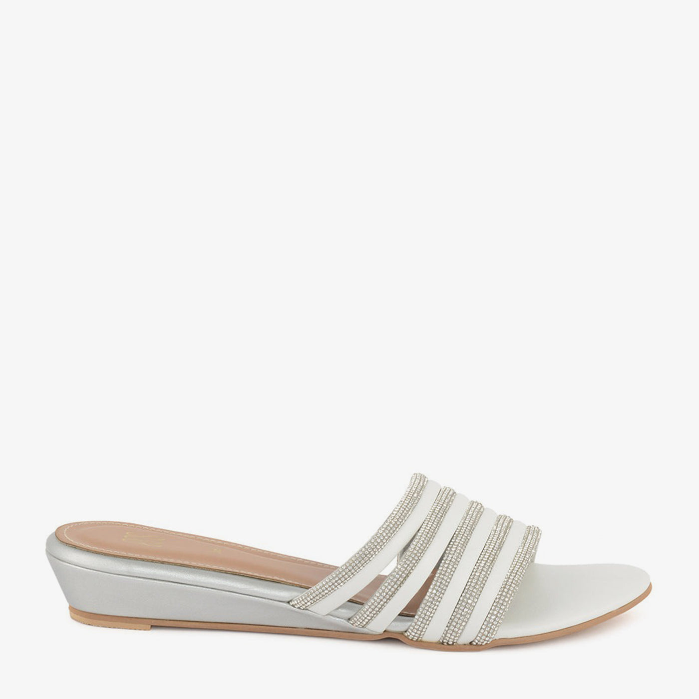 Introducing the "Shiny Glow" slippers, crafted for those who love a sleek and shiny finish. The synthetic PU upper with a round toe shape offers a chic look, complemented by a 2-inch wedge heel for added height. The slip-on style ensures convenience, while the shimmery material adds a festive flair to your outfit.