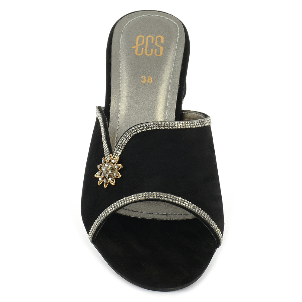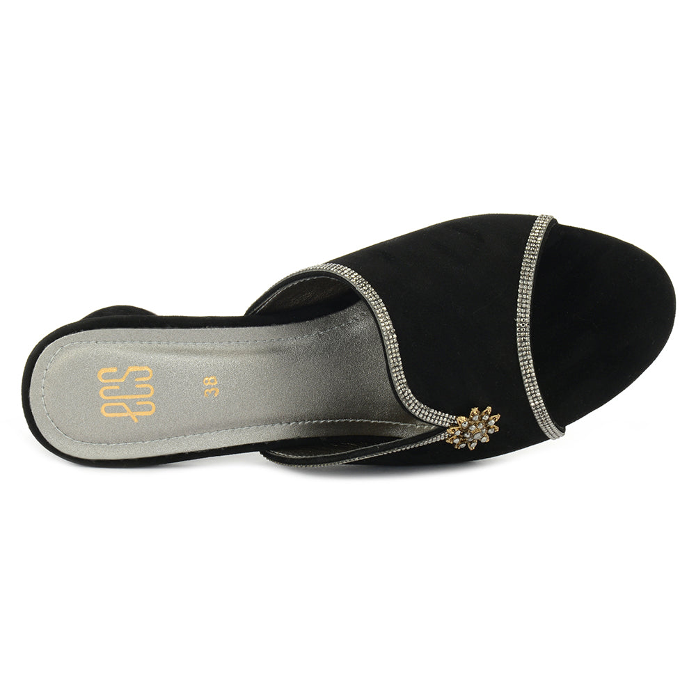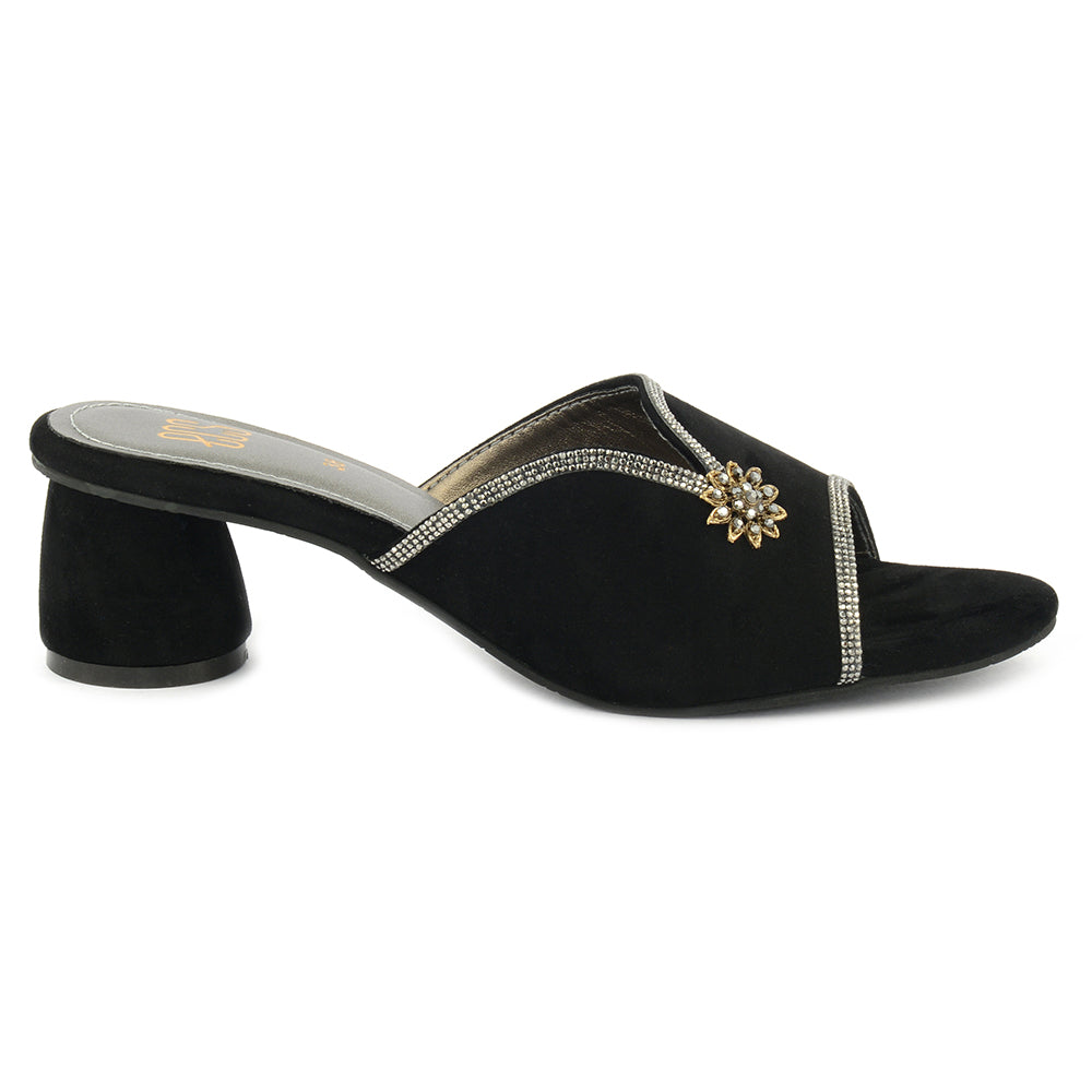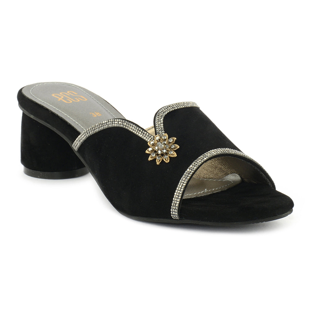 Slip into fashion-forward style and convenience with our collection of trendy slippers. Crafted with synthetic suede uppers, these slippers offer a luxurious and fashionable feel. The round toe shape provides a classic and comfortable fit, allowing you to relax in style. The rubber sole offers traction and stability, making them suitable for indoor wear. With a 2" heel height, these slippers offer a subtle lift to your height. The studs add a trendy and fashionable touch to the design. The slip-on fastening allows for easy and convenient wear. Step into relaxation mode with these stylish and comfortable round-toe slippers and embrace both fashion and convenience.