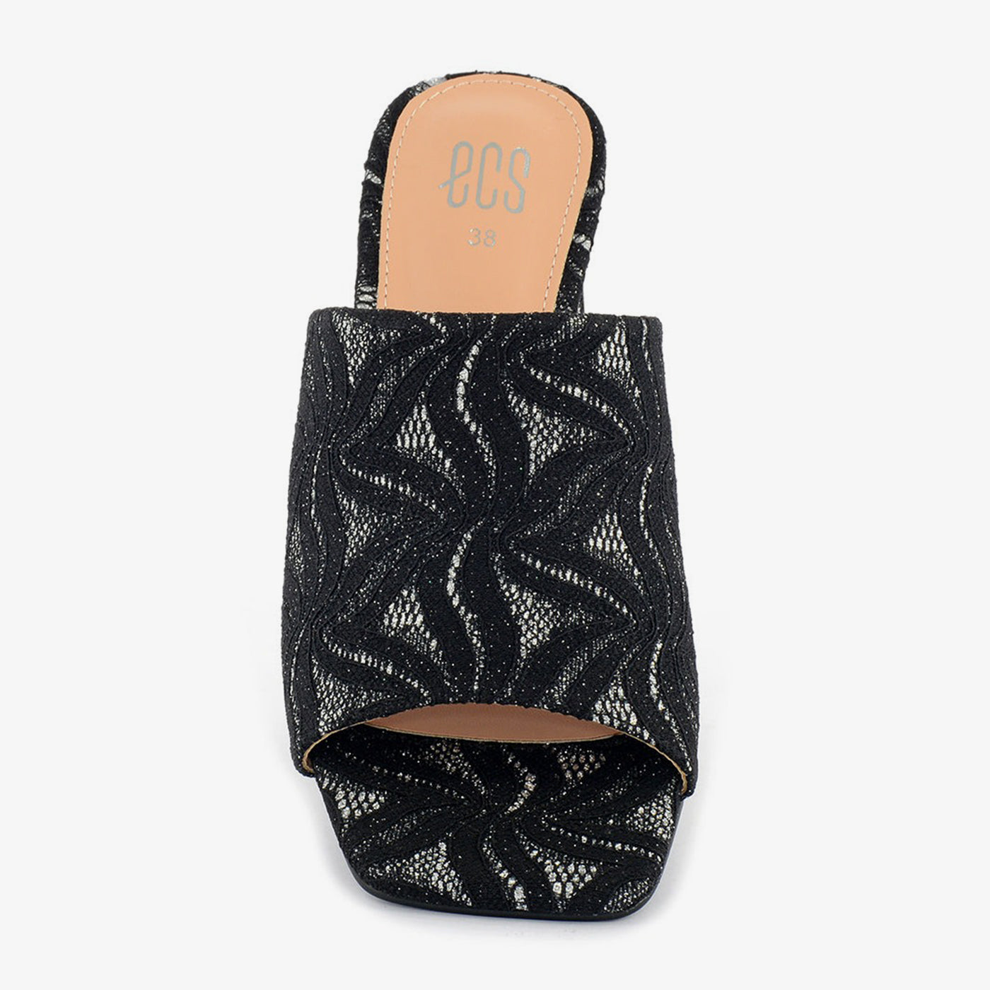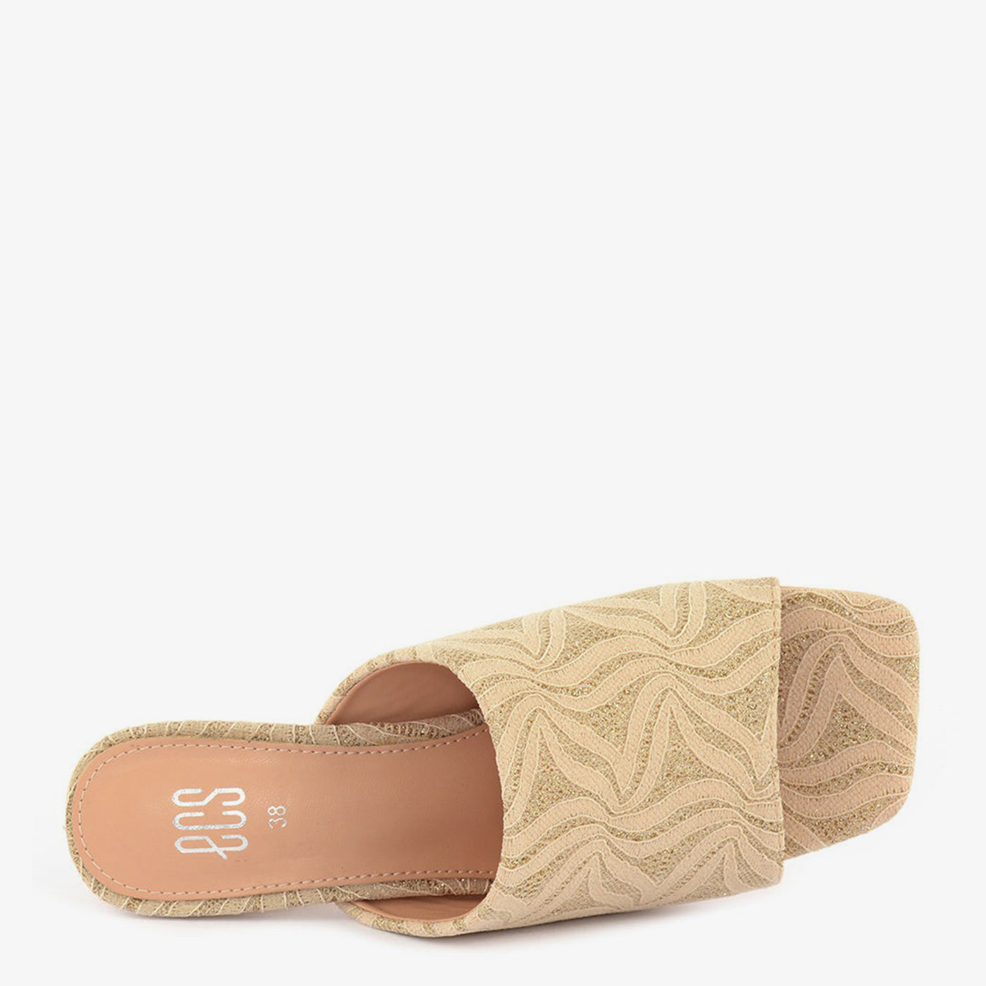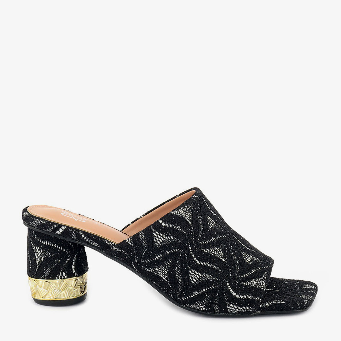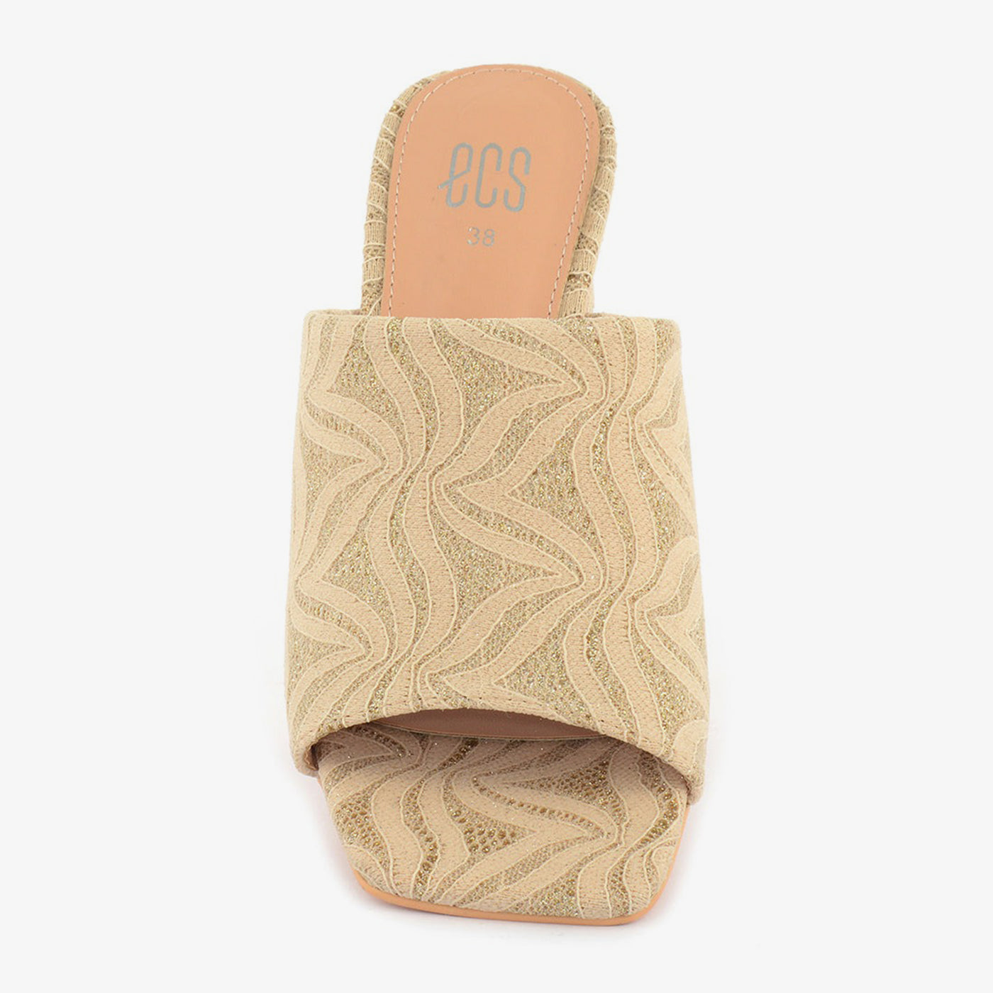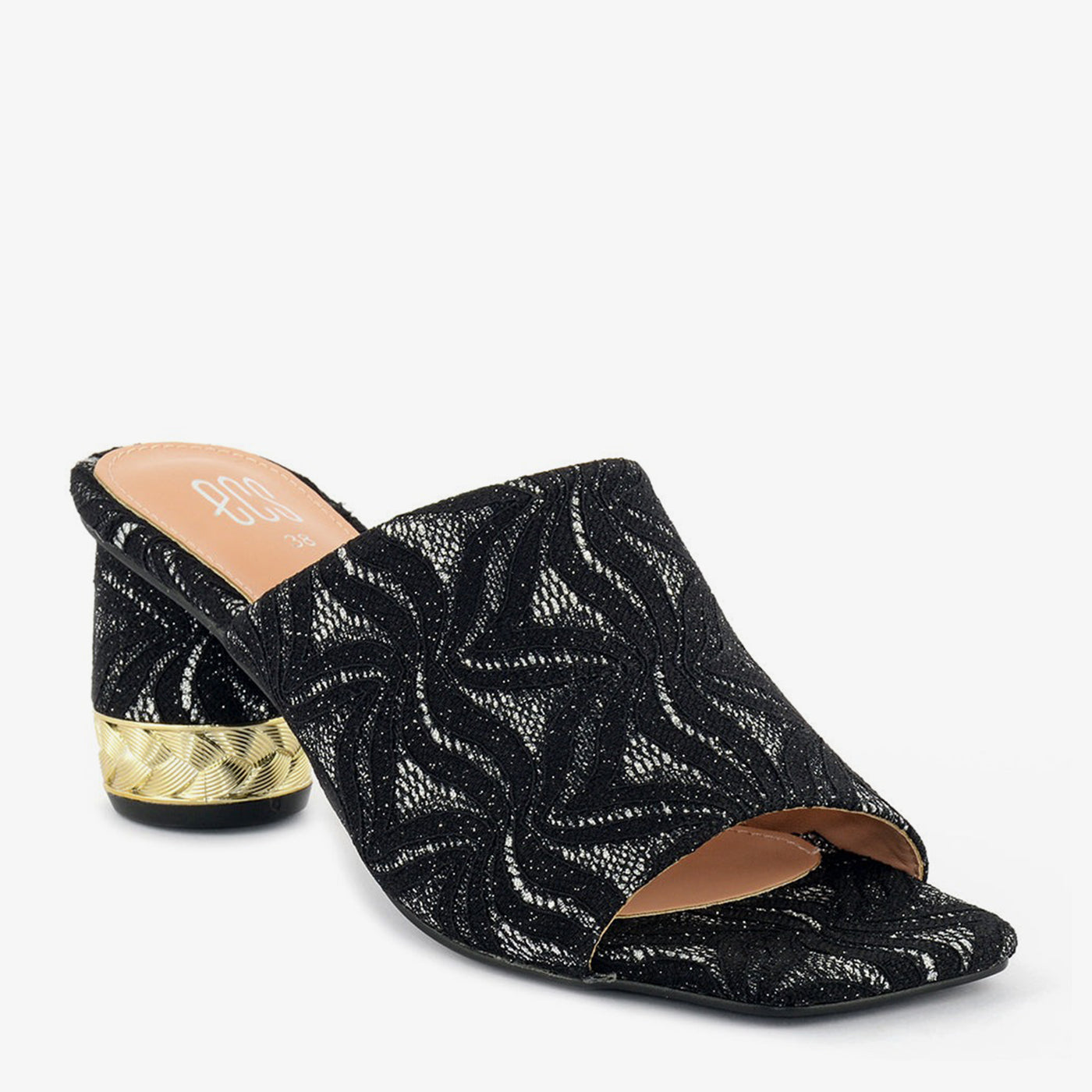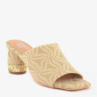 A festive sandal with textured shimmer and a unique metallic heel for effortless glam.