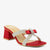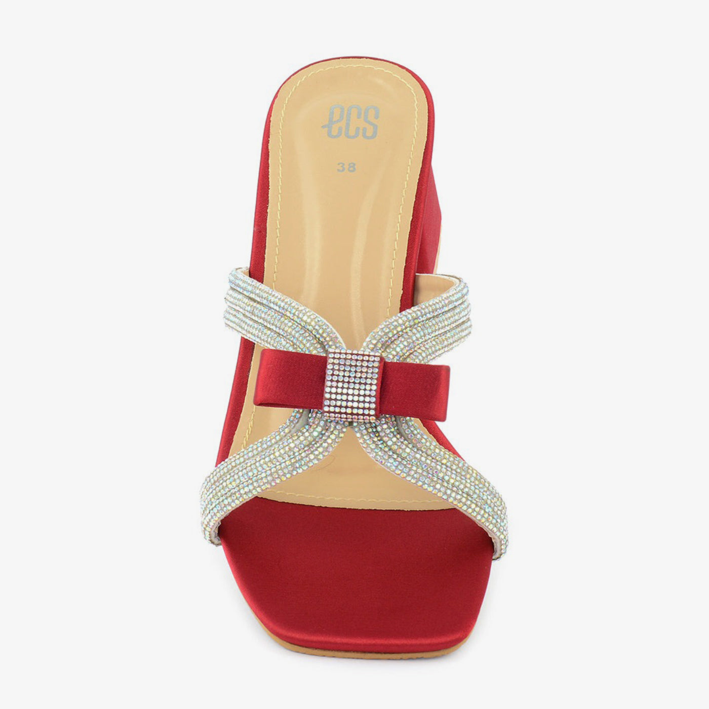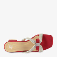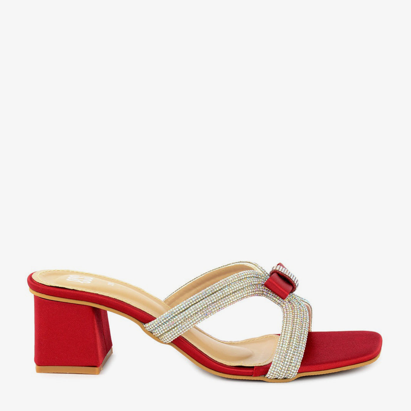 Step into festive flair with these red heeled slippers, featuring a chic square toe and a comfortable block heel. The multiple straps across the upper are adorned with sparkling stones and a stylish red bow, adding a touch of playful glamour to your party wear in Lahore.