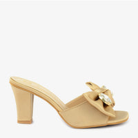 Step into dazzling elegance with the Bow Embellished Heel. These stunning heeled footwear feature a wide, shimmering gold strap across the toes, adorned with a large, ornate crystal-embellished bow. The flared heel adds a touch of modern sophistication, making them perfect for special occasions.