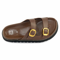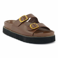 Elevate your everyday style with these dual-strap slippers featuring bold gold buckles. The cushioned sole provides extra support, while the raised outsole adds height and stability.