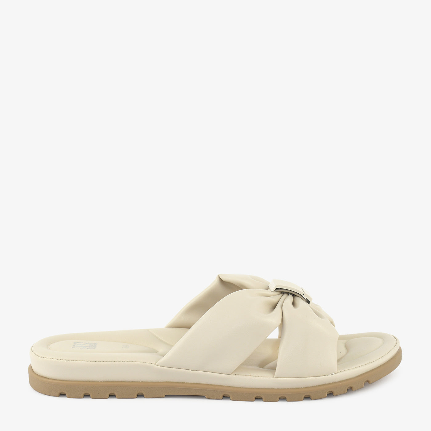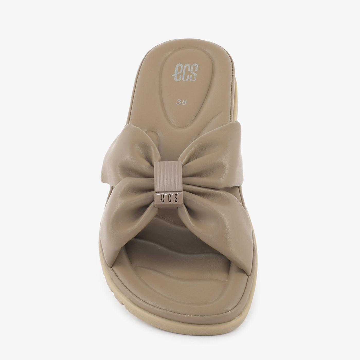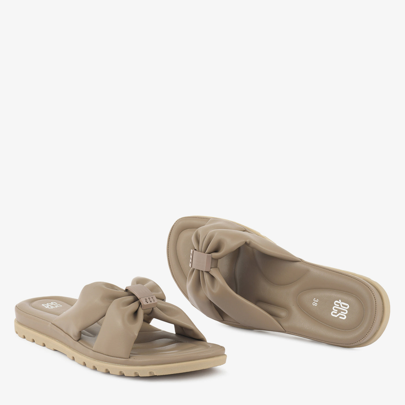 Step into effortless comfort and style with these chic taupe knot slides. The soft, puffed strap with a stylish knot detail adds a touch of contemporary elegance, perfect for the relaxed pace of everyday life. The comfortable, slightly contoured sole makes them ideal for running errands or casual outings around.