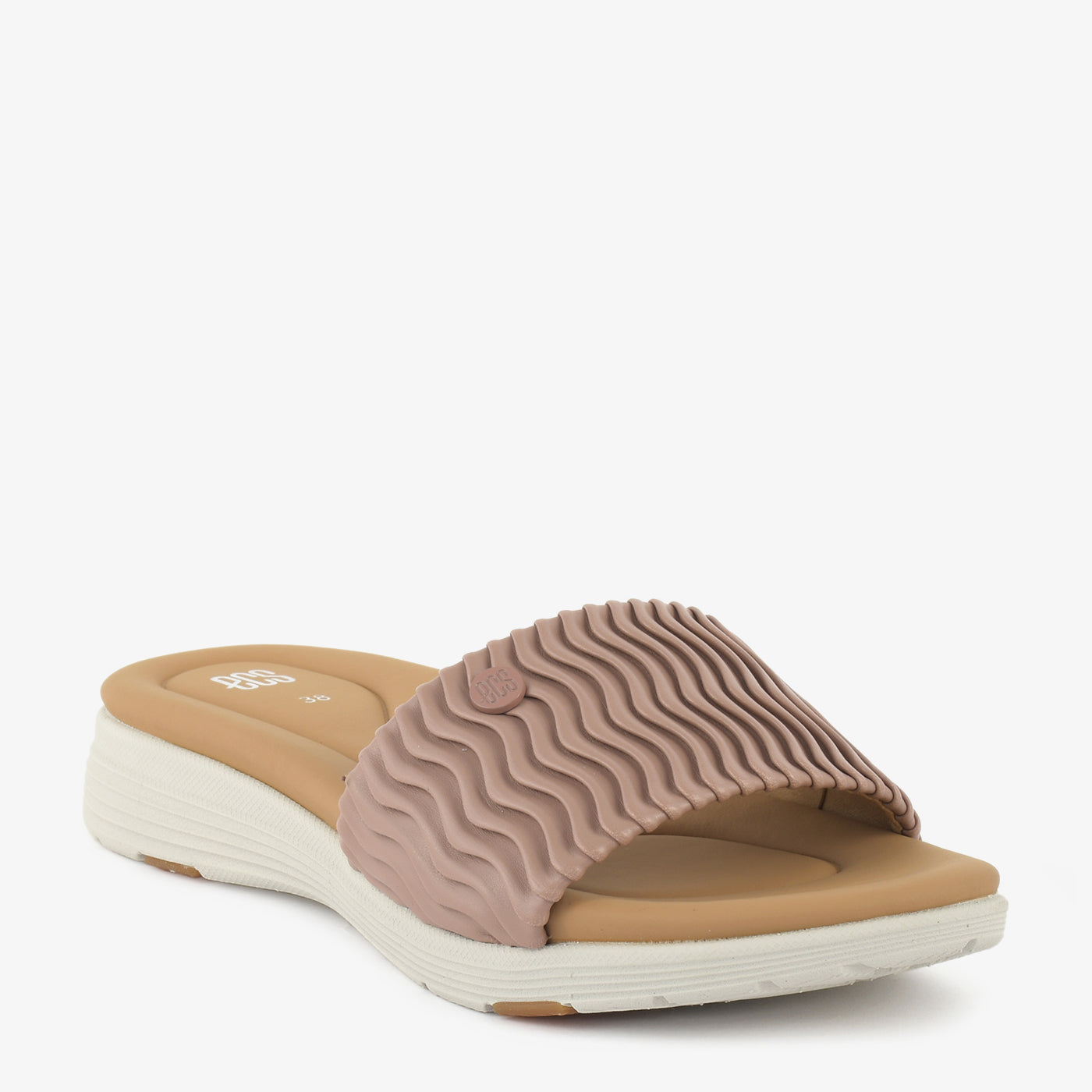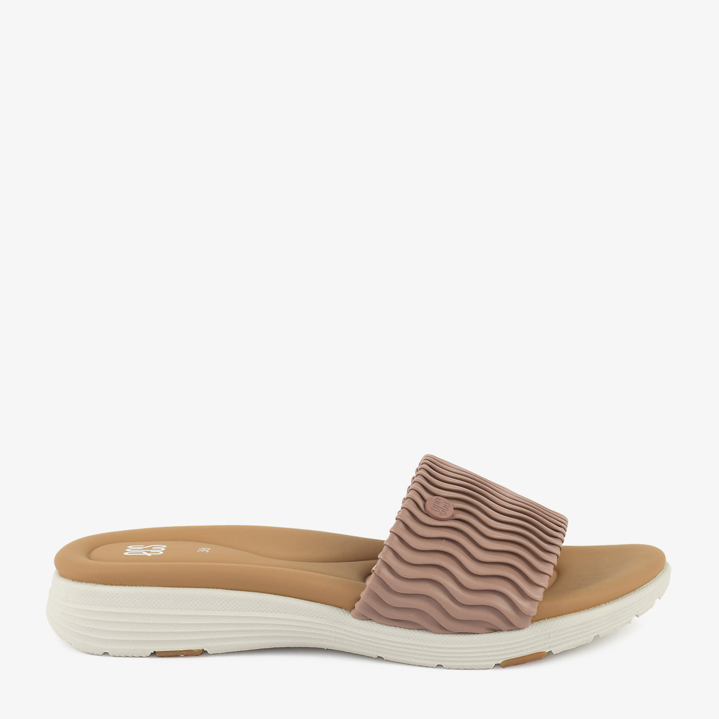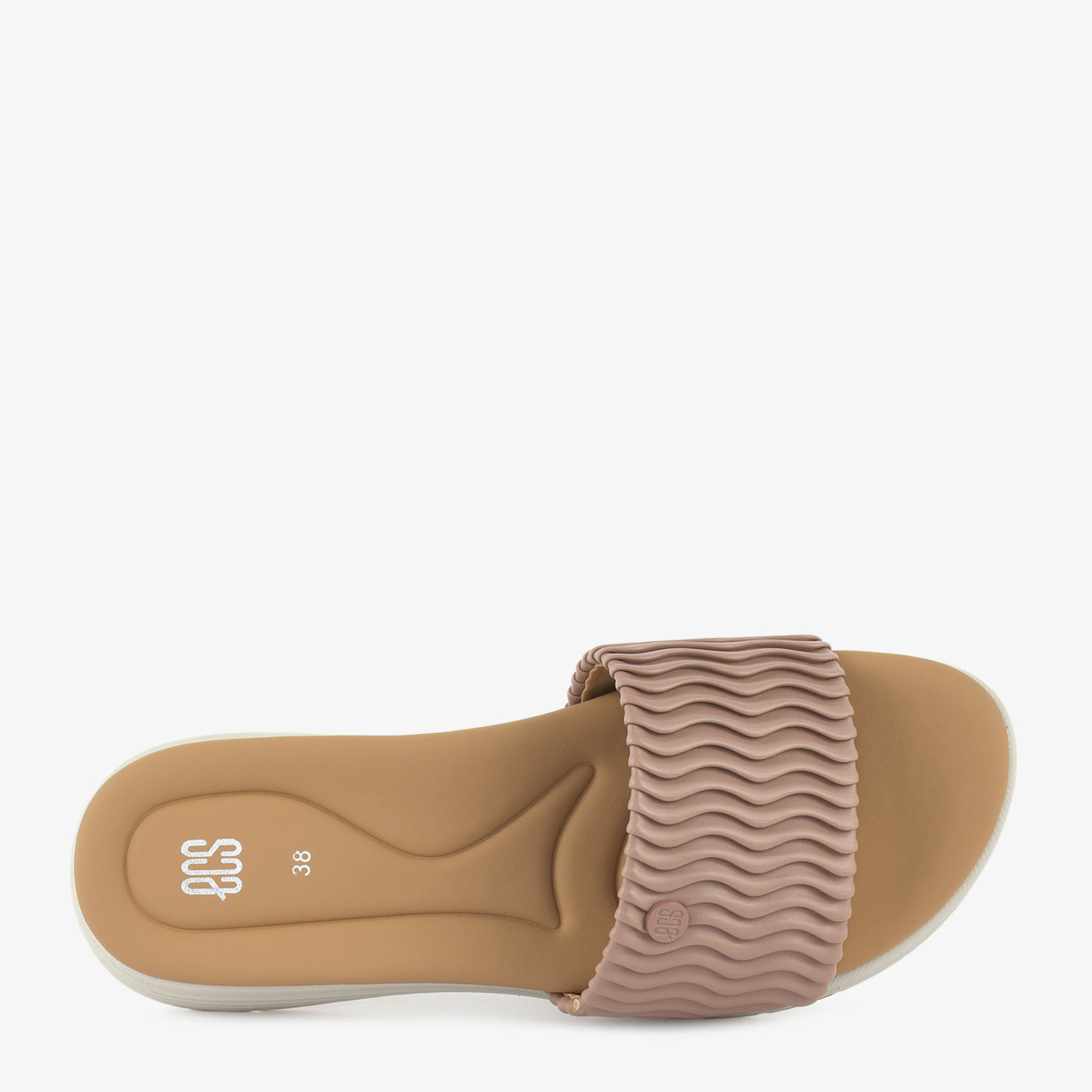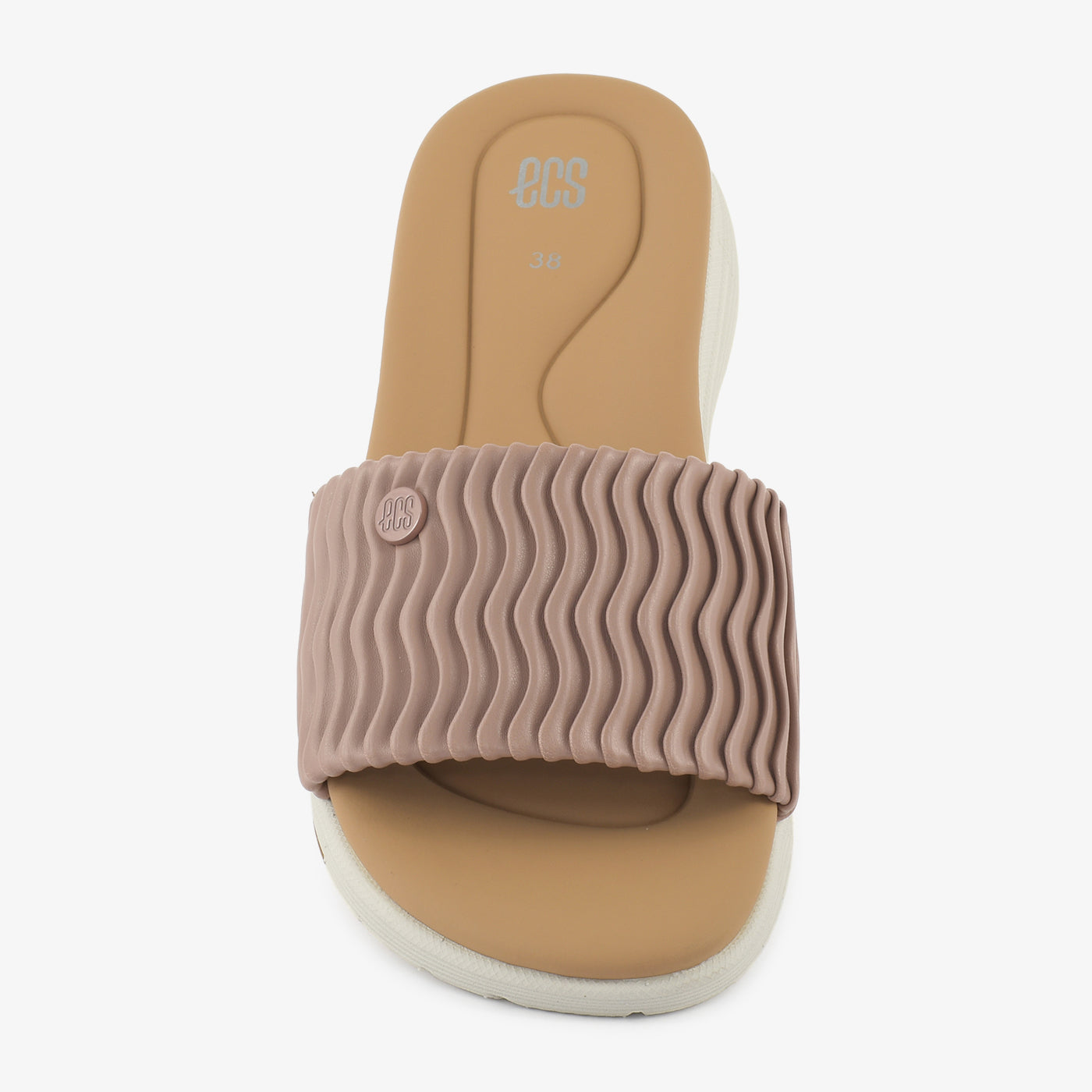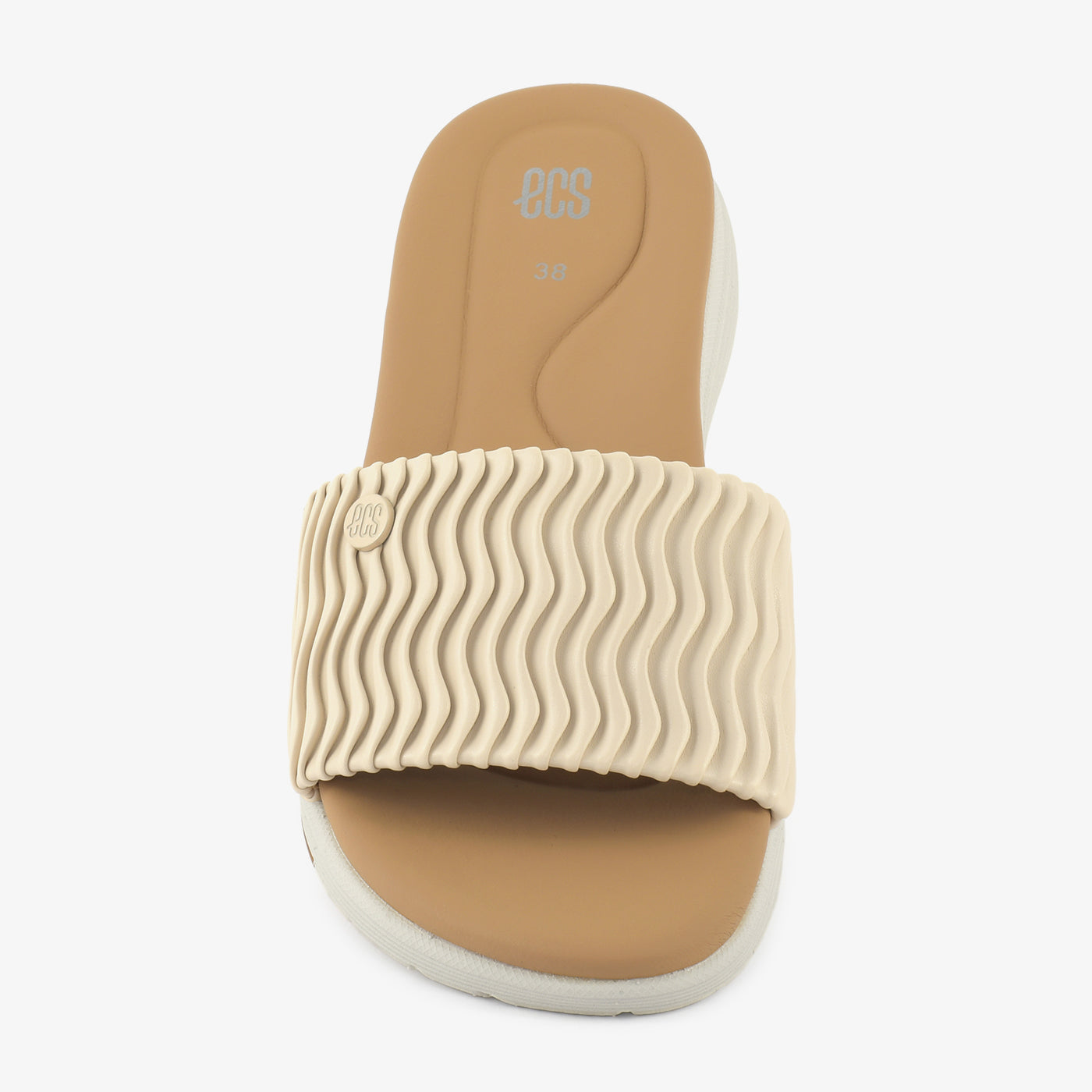 Step into everyday comfort with these stylish beige open-back flats. The unique wavy textured strap adds a touch of subtle visual interest, while the cushioned footbed and slight wedge offer all-day support, perfect for navigating the city with ease.