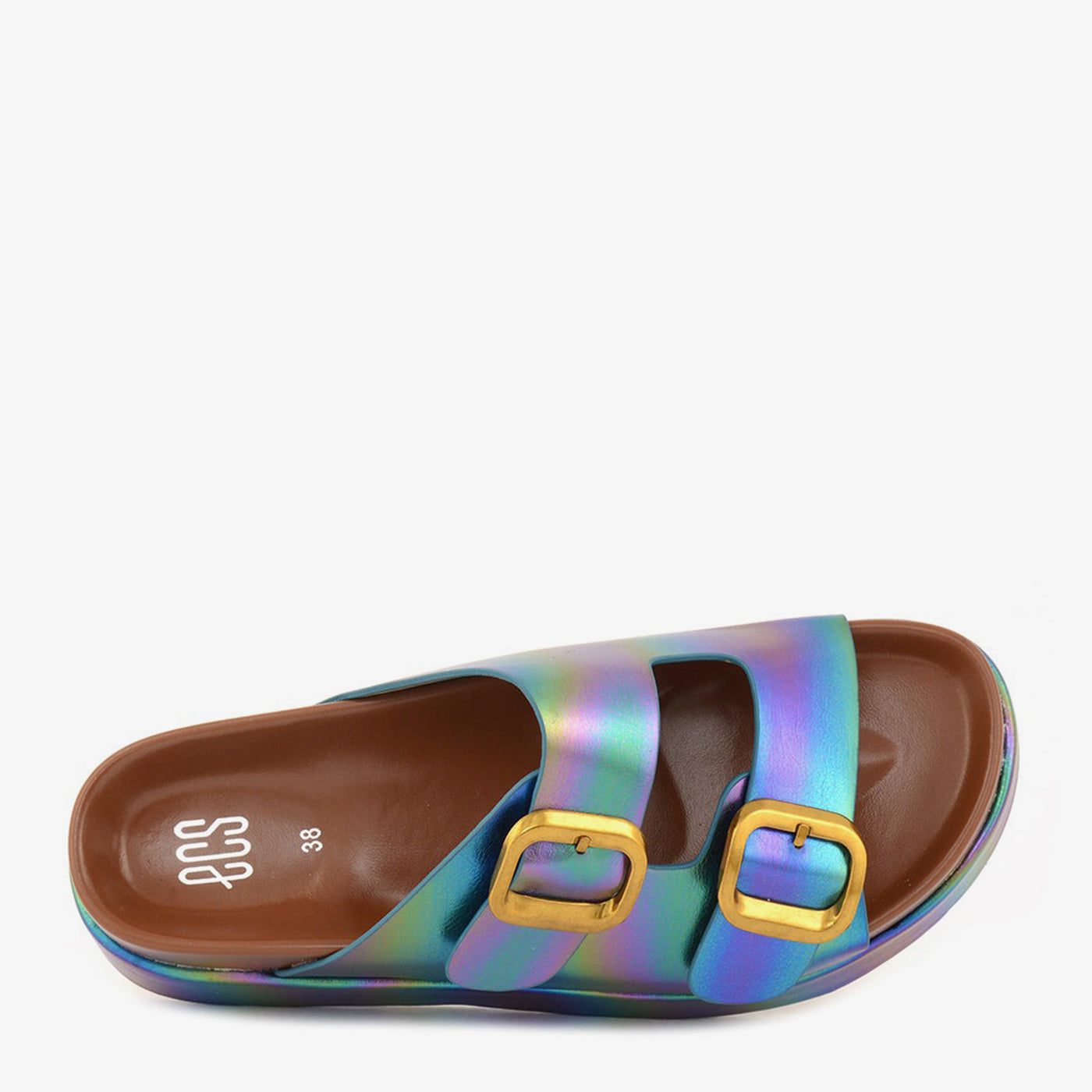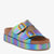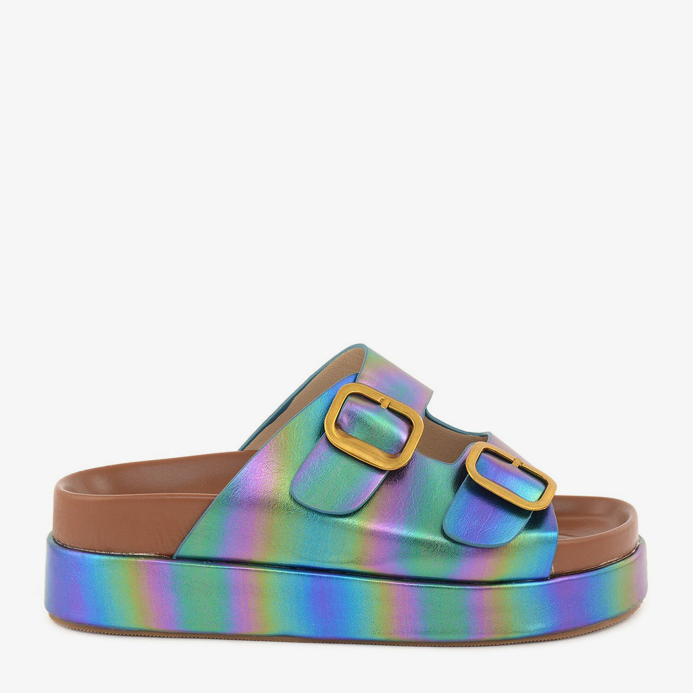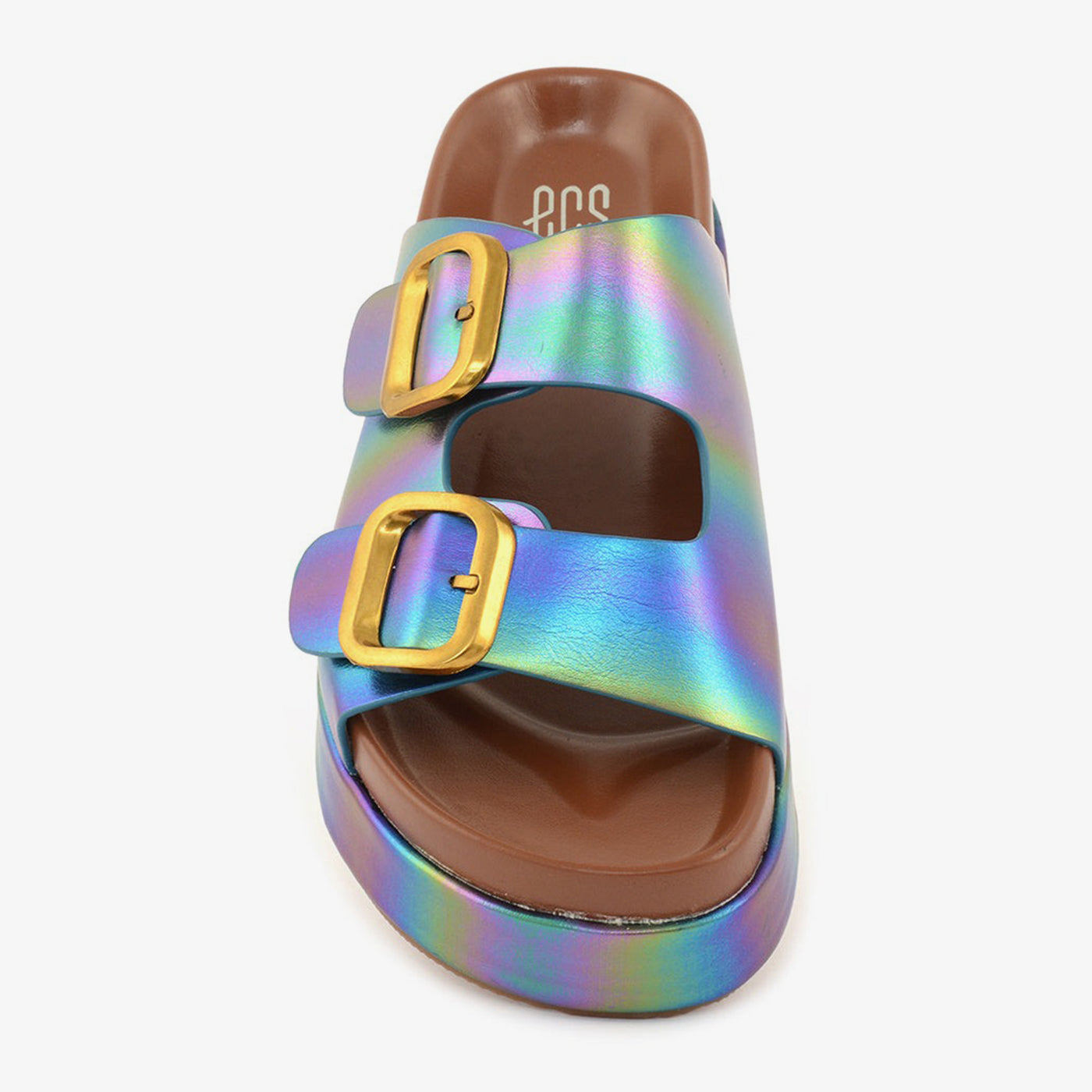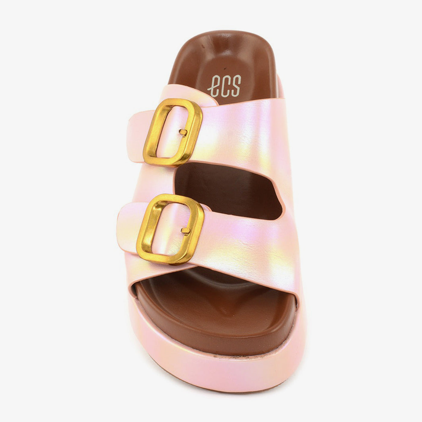 Featuring a soft sheen and oversized buckles, this platform slipper blends modern shine with retro form. Its lightweight sole and padded design ensure day-long ease.