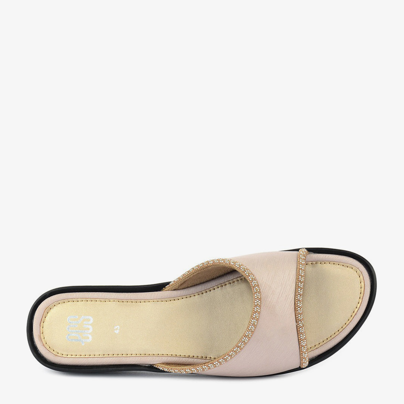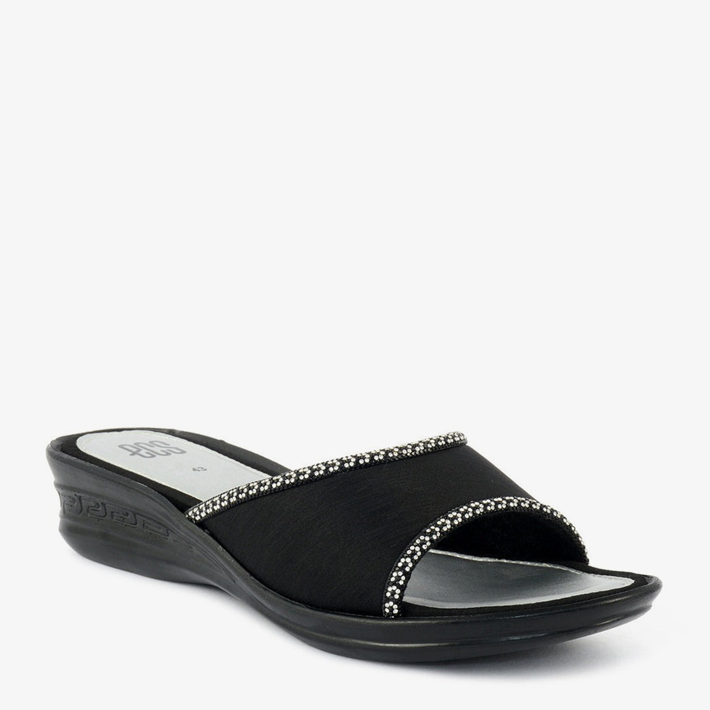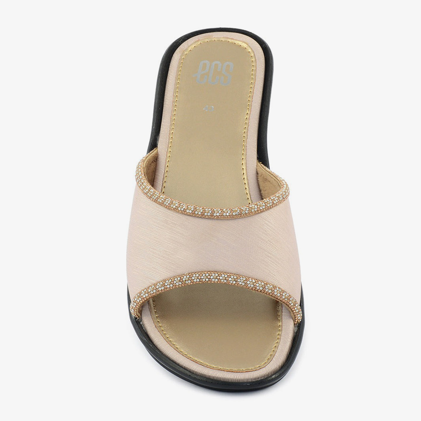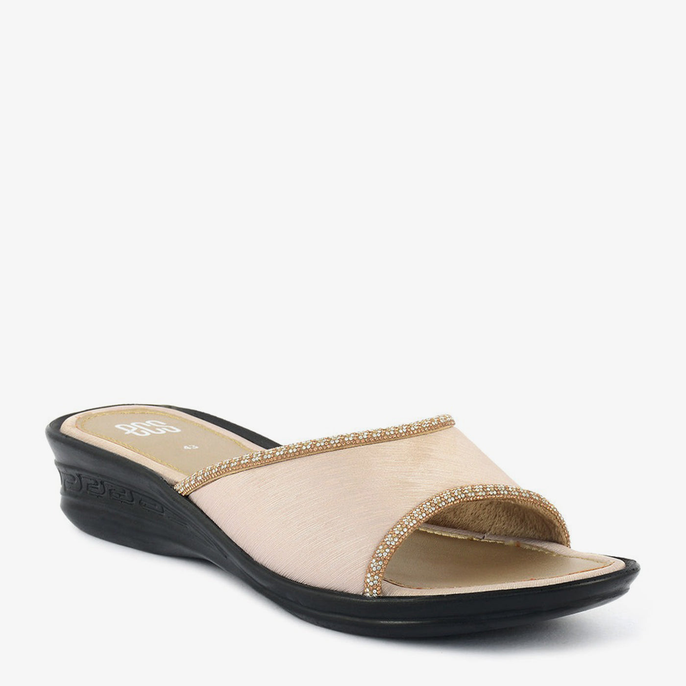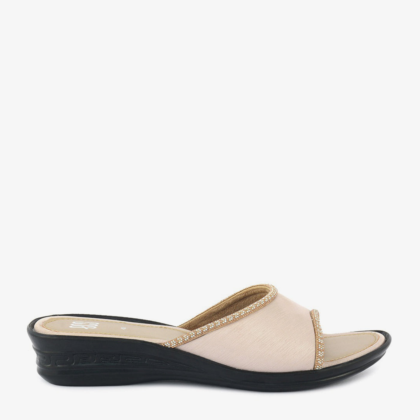 These stylish slippers are crafted from PU with both upper and lining materials. The round toe and wedge heel provide a unique look, while the PU sole ensures durability. The shiny finish and nagena doori detailing add a touch of elegance. Featuring a flip-on fastening for ease of use, they are perfect for casual wear. Clean with a damp cloth and avoid extreme heat.