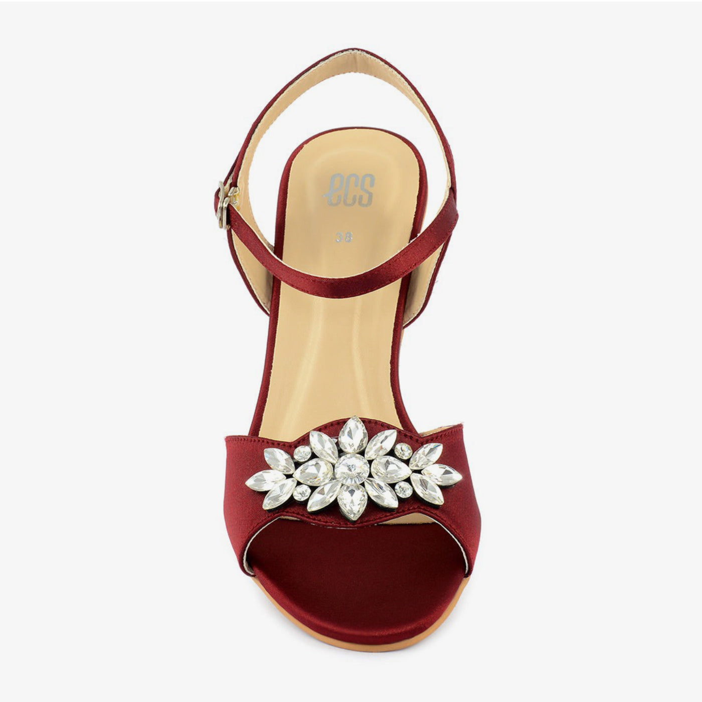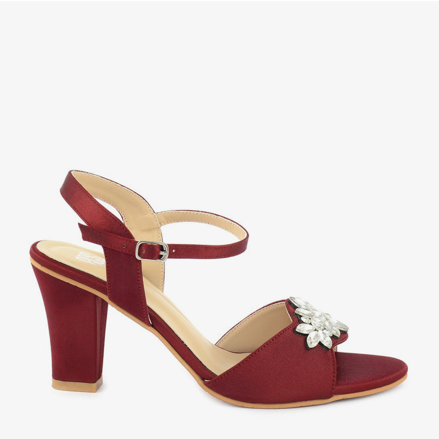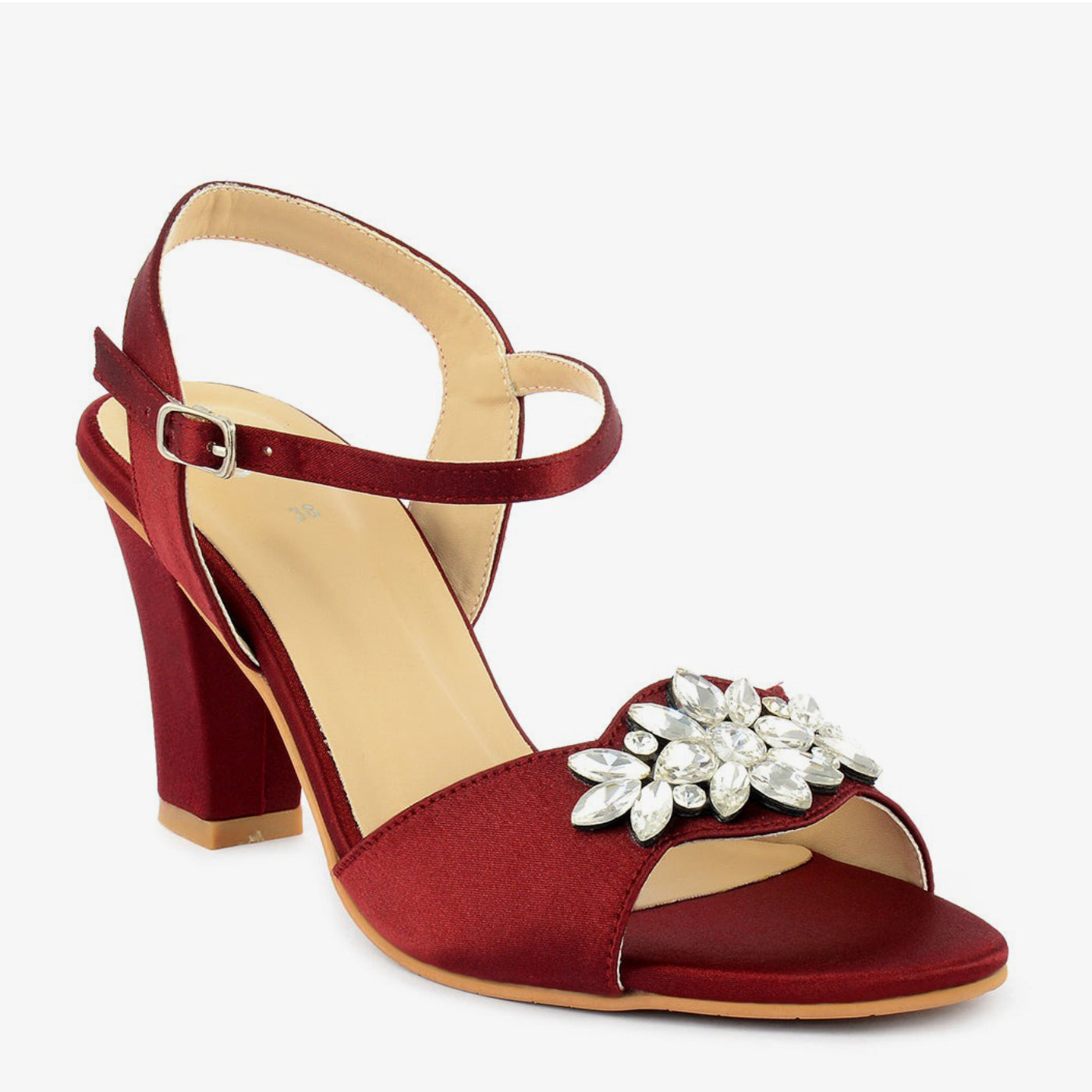 Step into elegant celebrations with these crimson sandals, featuring a comfortable block heel and multiple straps adorned with delicate stone detailing. The rich color and sophisticated embellishments make them perfect for adding a touch of traditional glamour to your wedding attire or festive occasions.