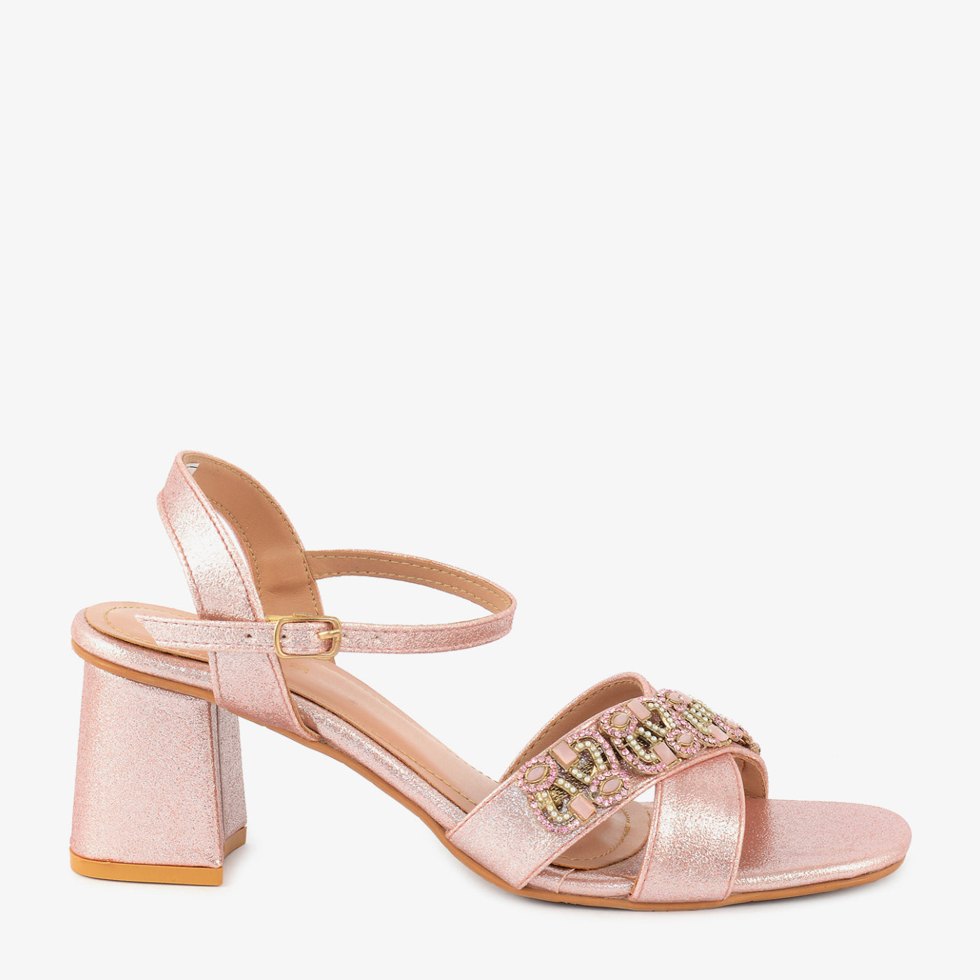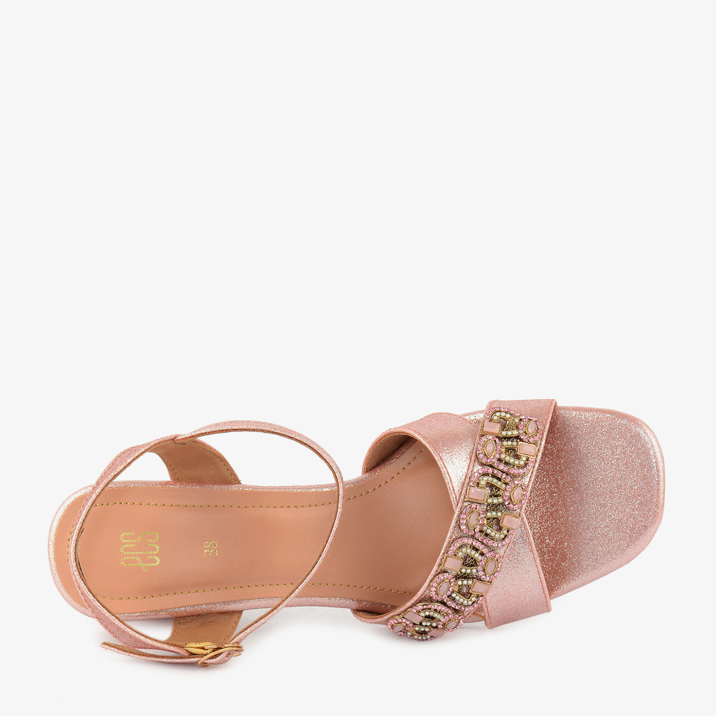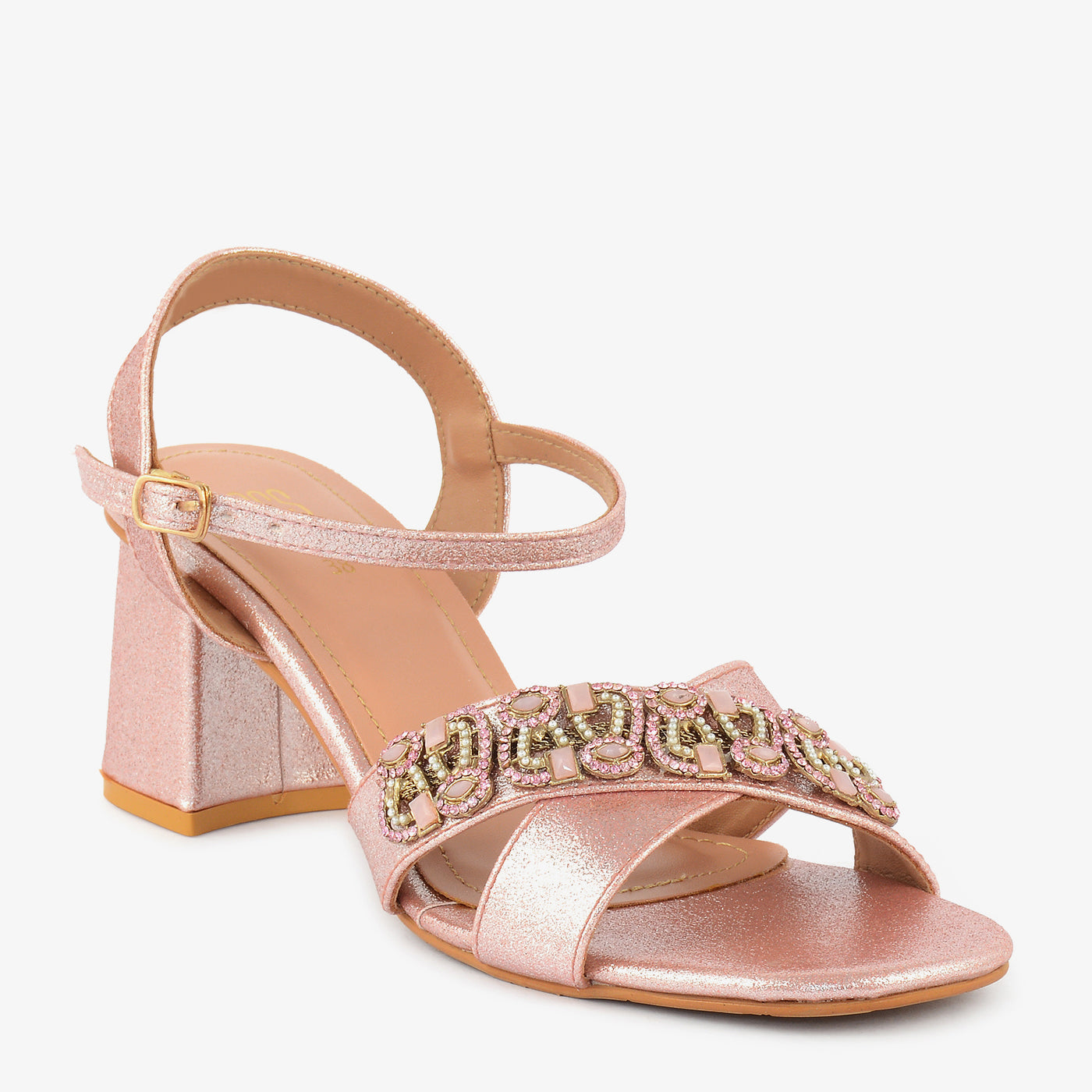 Indulge in pure glamour with these stunning sandals. Crafted with a luxurious shimmering fabric and adorned with sparkling crystal embellishments, these sandals exude sophistication. The delicate ankle strap and block heel offer a comfortable and stylish look.