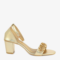 Elevate your evening look with our Glittering Glamour Sandals. These stylish sandals are crafted with a metallic finish and adorned with sparkling embellishments, adding a touch of glamour. The block heel and ankle strap provide both style and comfort.