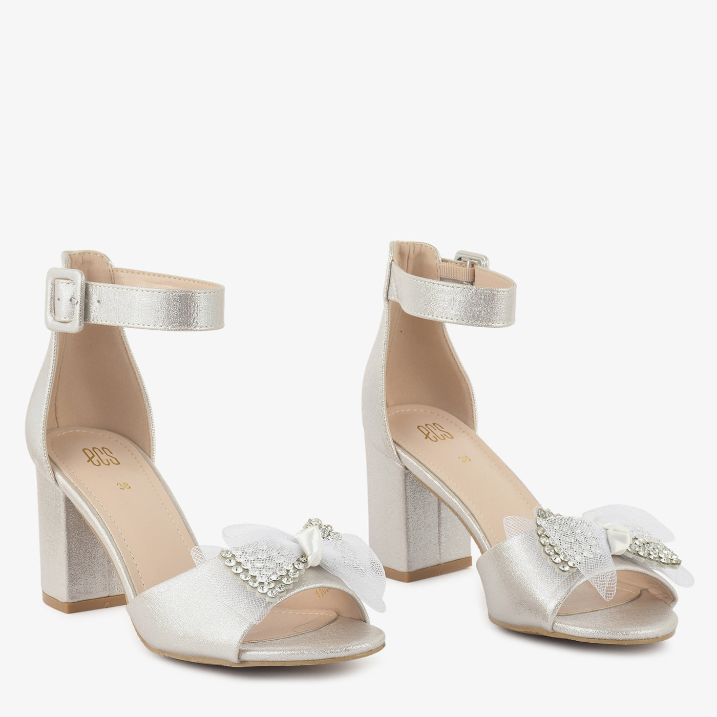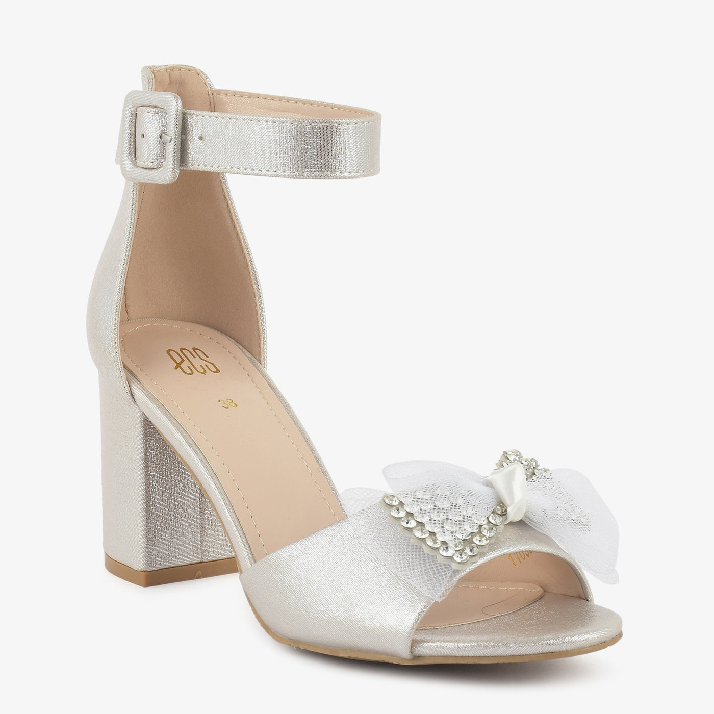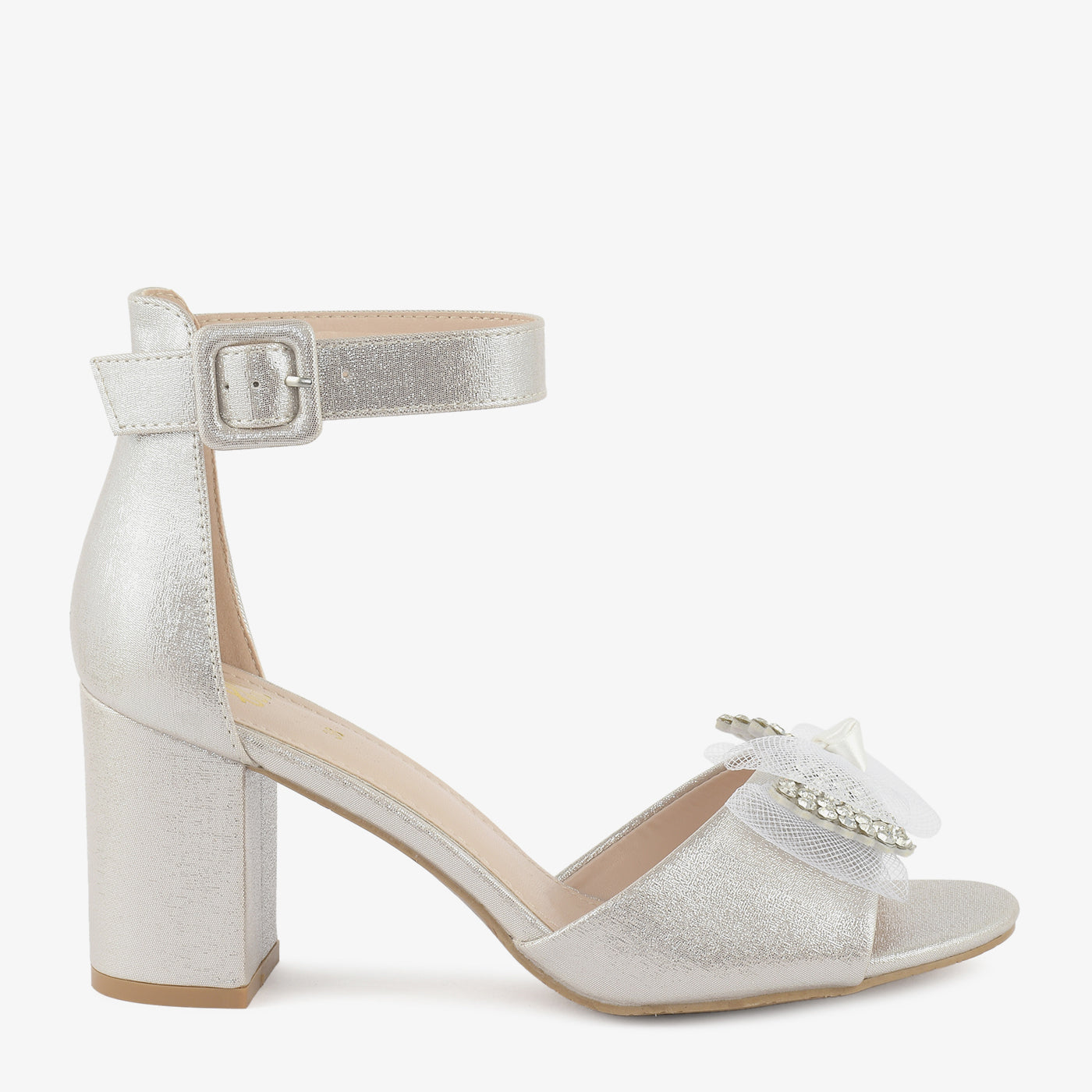 Step into subtle sparkle with these silver sandals. The shimmering finish and the delicate bow detail add a touch of feminine charm to your look. The comfortable block heel...