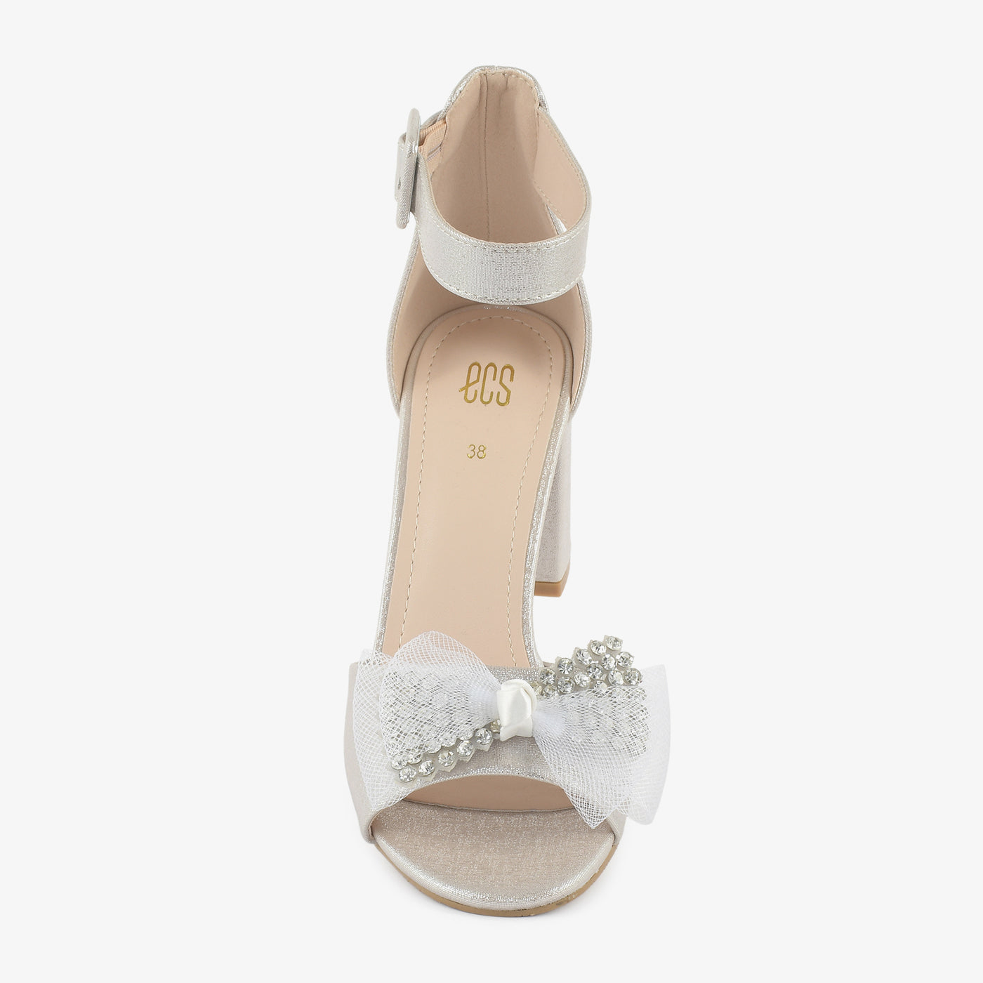 Step into subtle sparkle with these silver sandals. The shimmering finish and the delicate bow detail add a touch of feminine charm to your look. The comfortable block heel provides a bit of elevation while remaining easy to wear for events around Lahore.